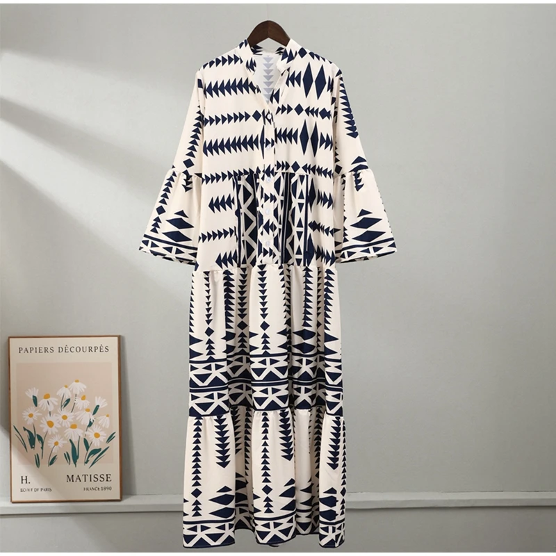 New Women Summer Maxi Dress V Neck Ruched Plus Size Dresses Lady Vintage Geometric Print Bohemian Dresses