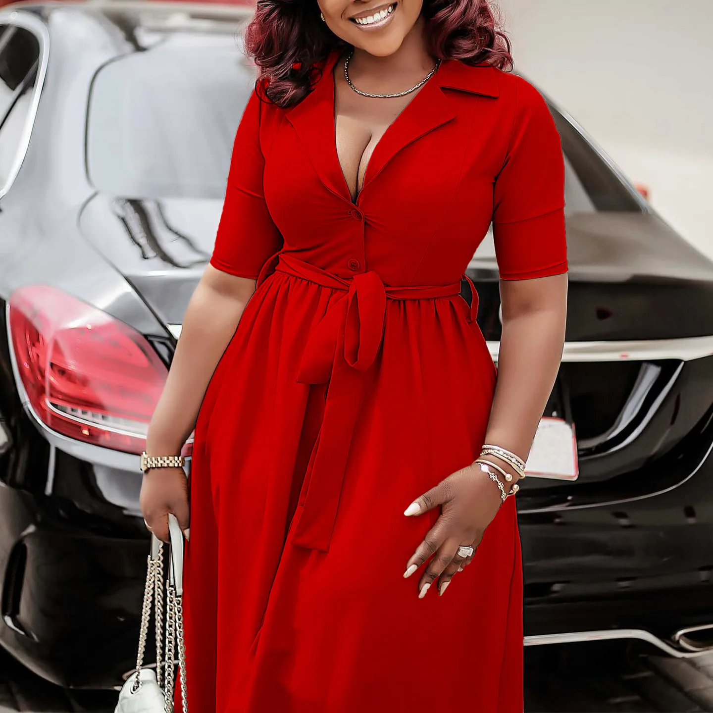 New Women Elegant Shirt Dress Short Sleeve V-neck Button up Lady Solid Summer Midi Dresses