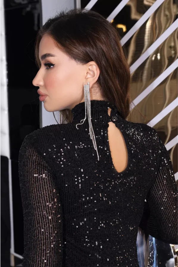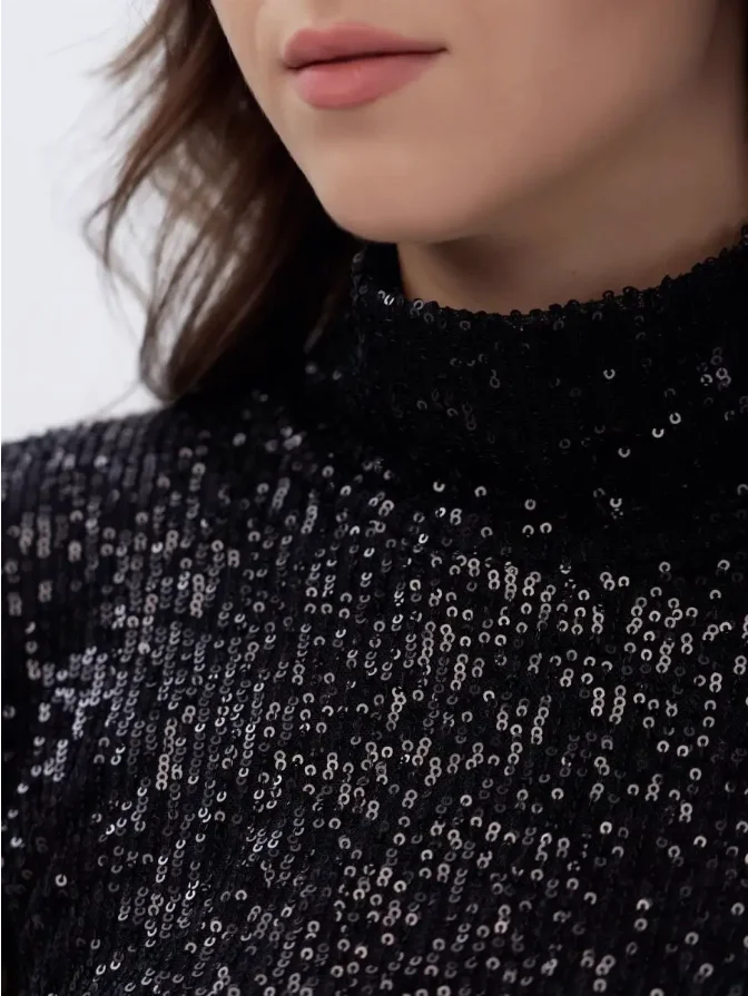 Elegant Solid Black Sequin Turtleneck Bodycon Mini Dress with Long Sleeves Eco-Friendly for Evening Parties and Clubs