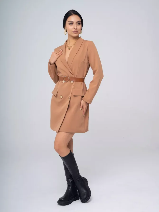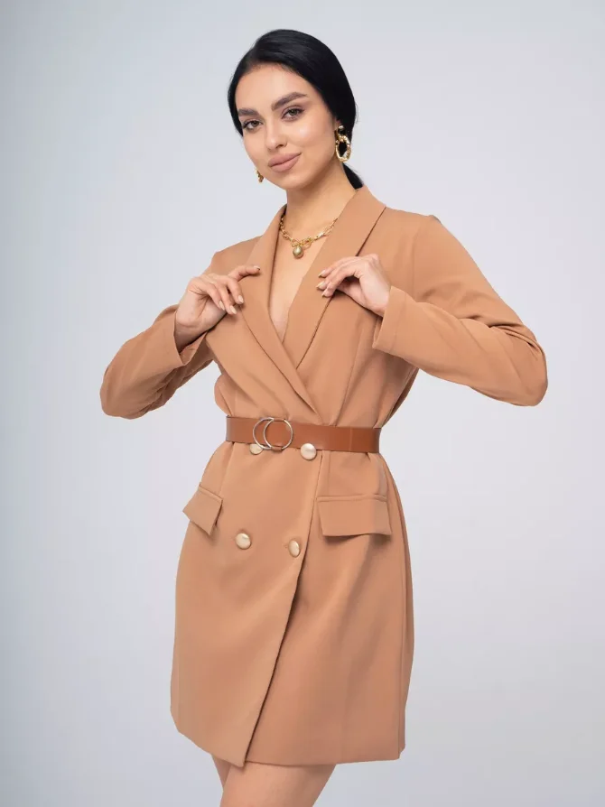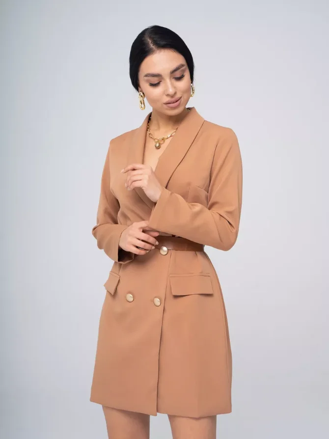 High Quality Brown Solid Double-Breasted Blazer Dress Women High Waist Slim Fit A-Line Pockets Button Decoration Eco-Friendly