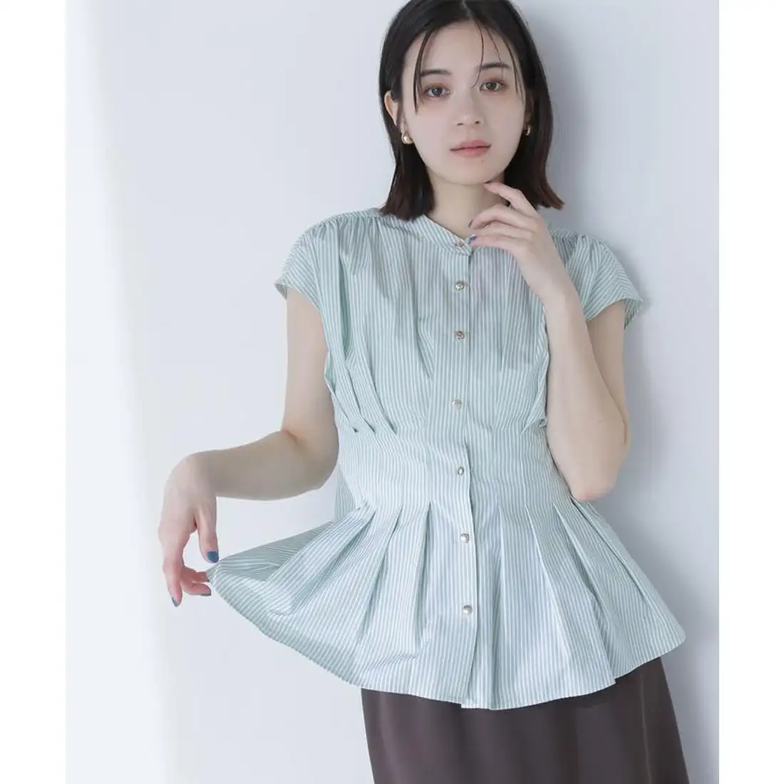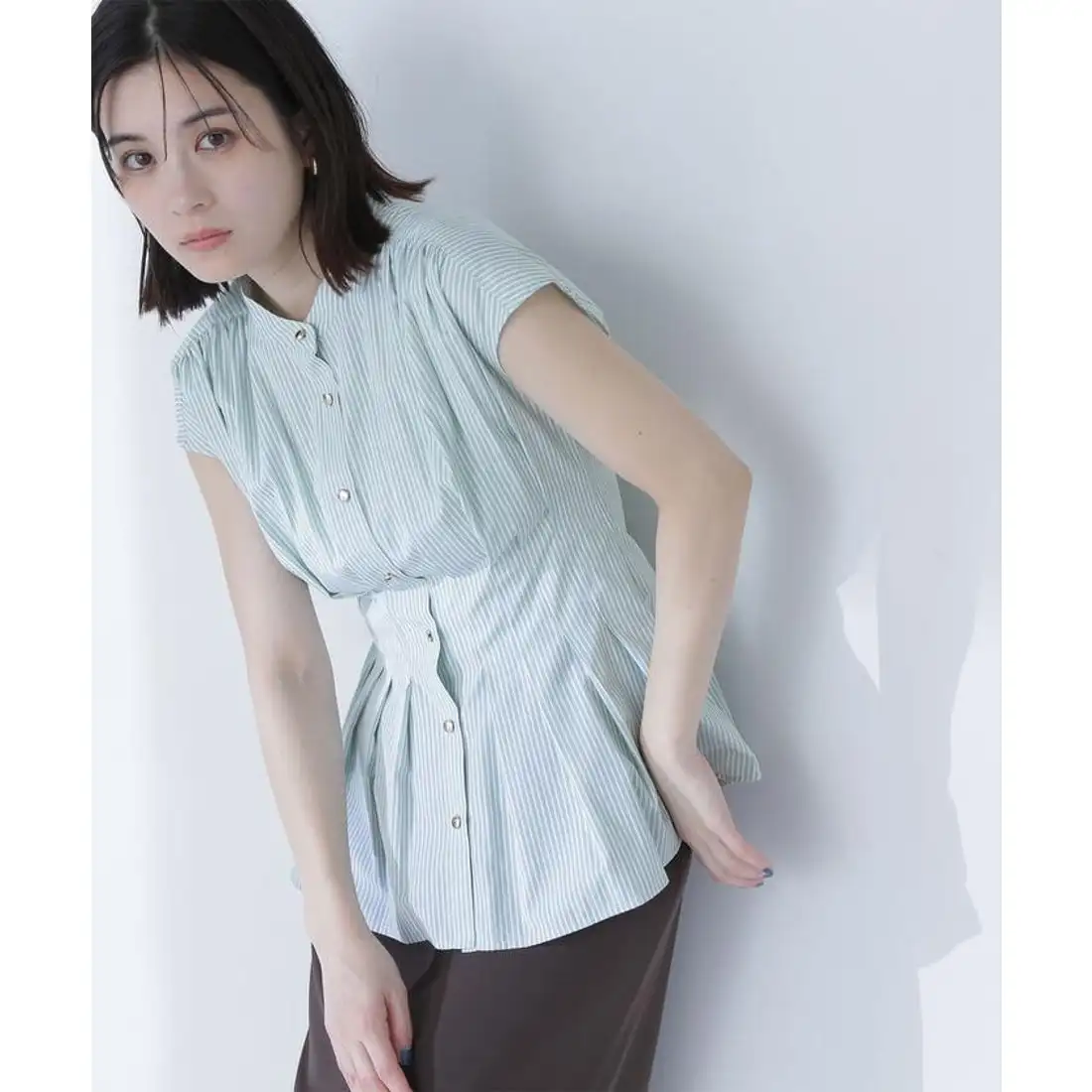 ZYHT 15545 Women's Blouses & Shirts Mint Green Tweed Blazer with Puff Sleeves & Peplum Fit Button-Detail Long Sleeve Jacket