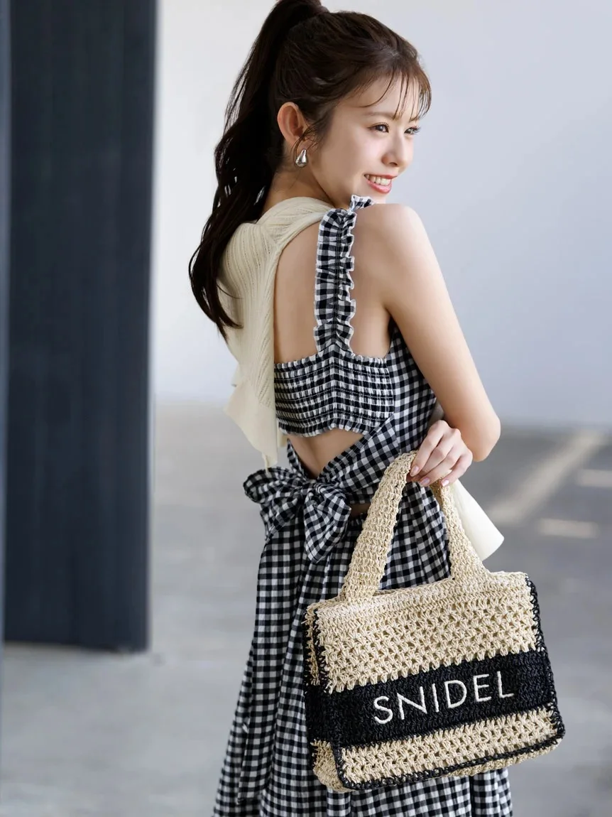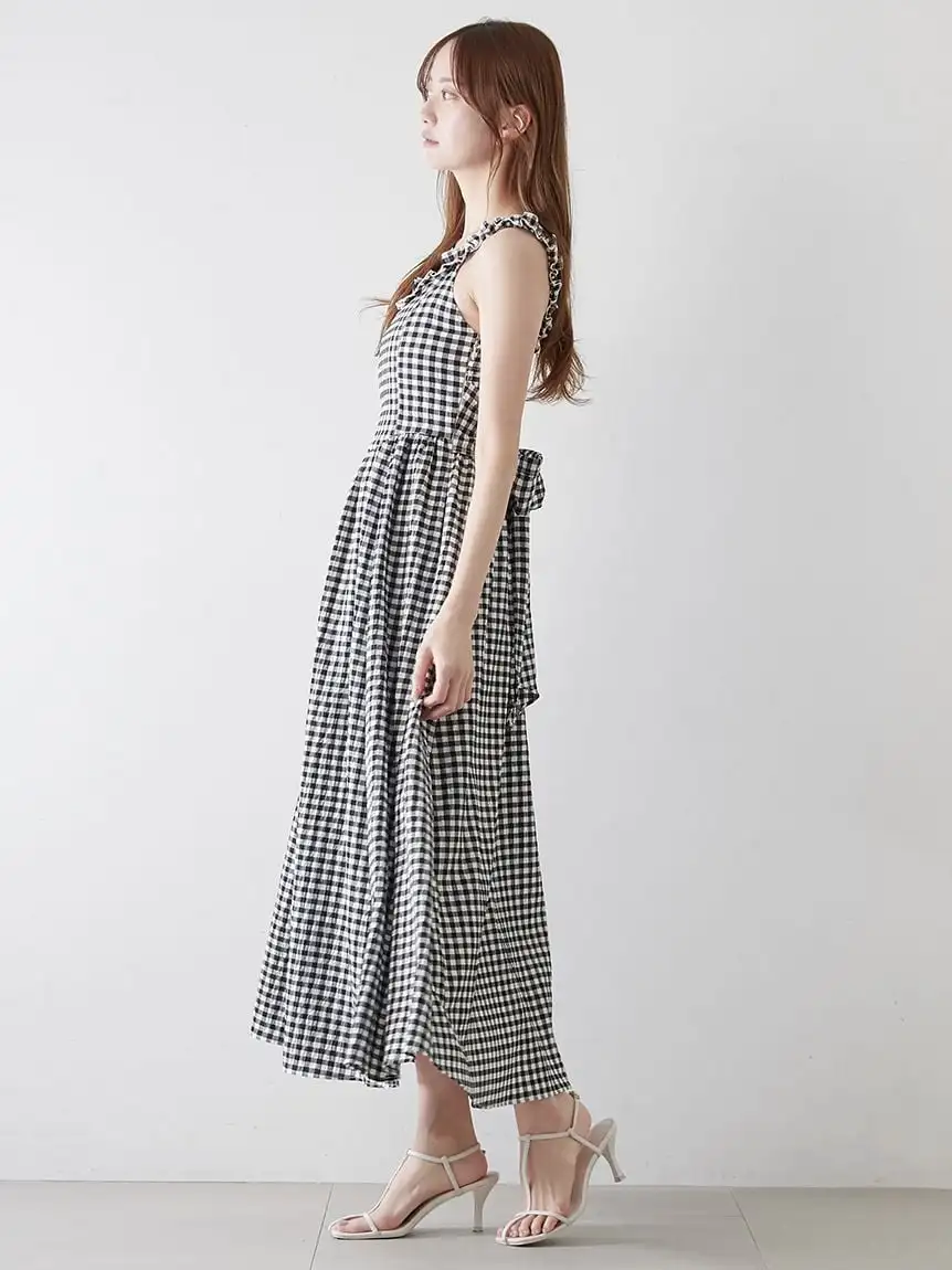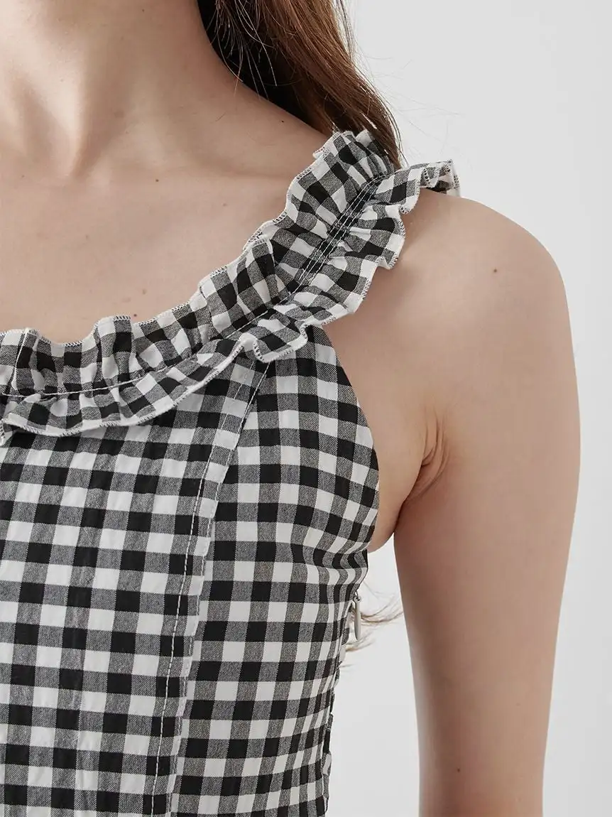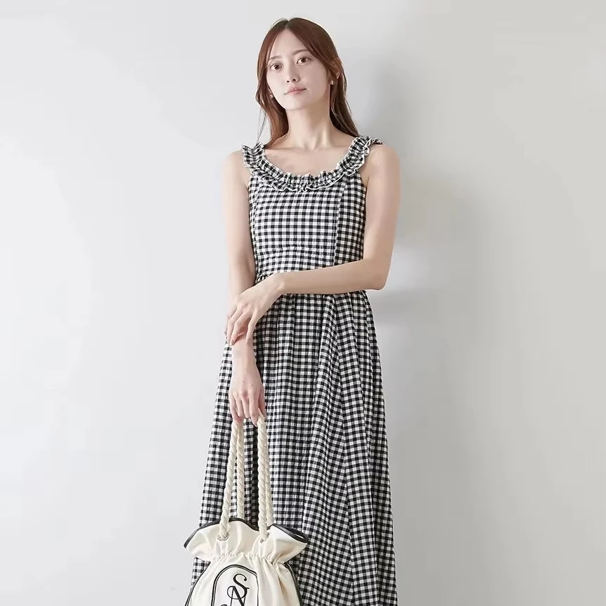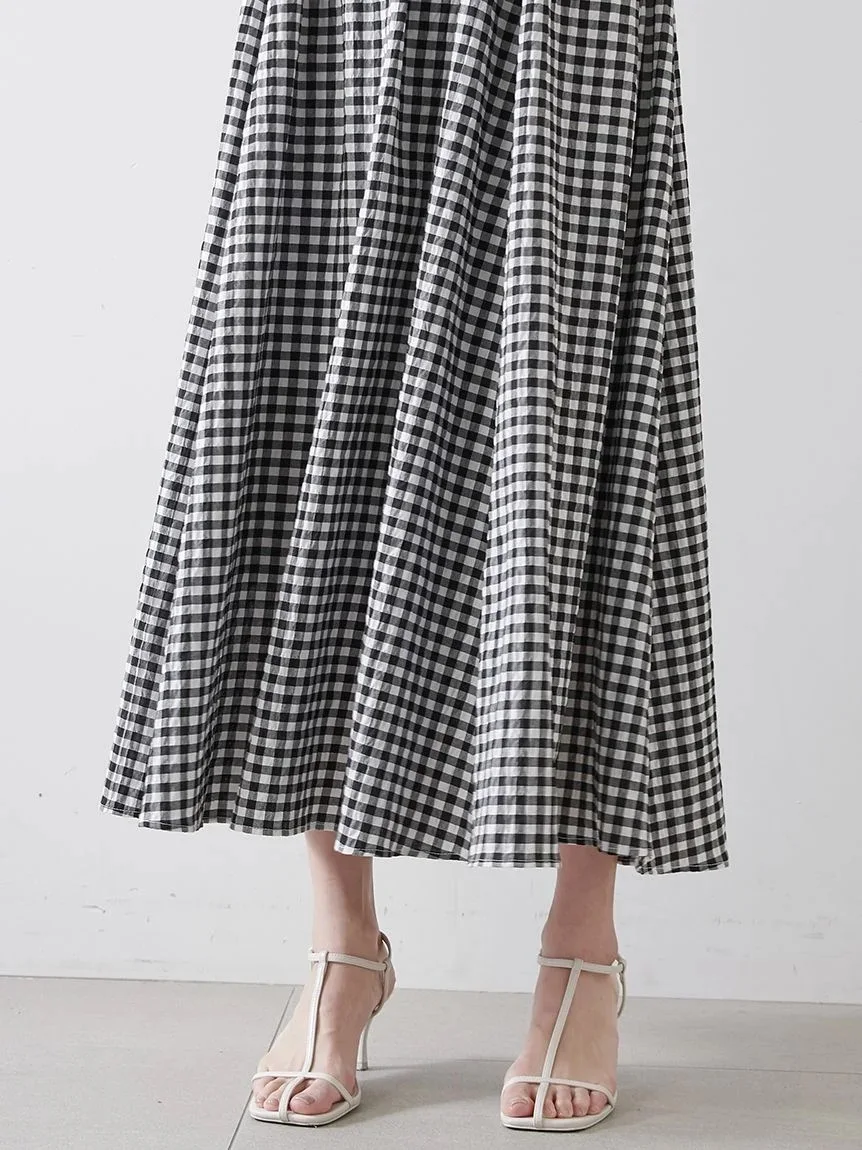 Summer Elegant Women's High Waist Dress Sleeveless Back Elastic Band Pleated Black and White Plaid for Daily Wear