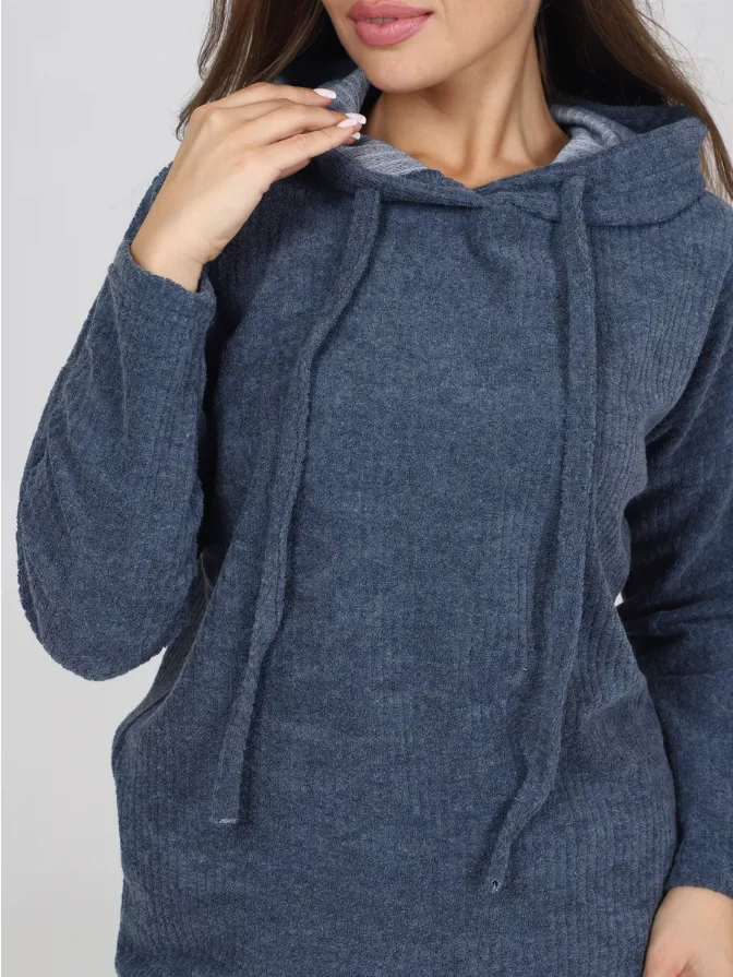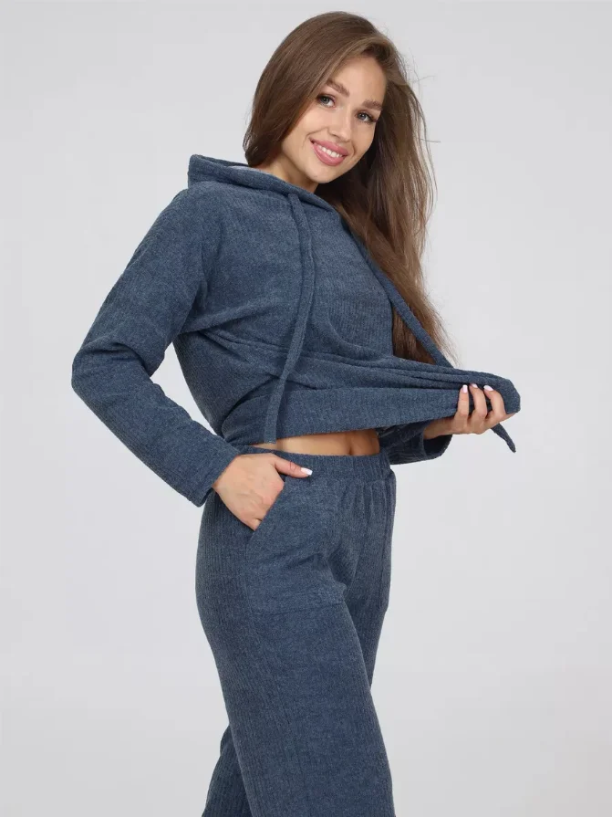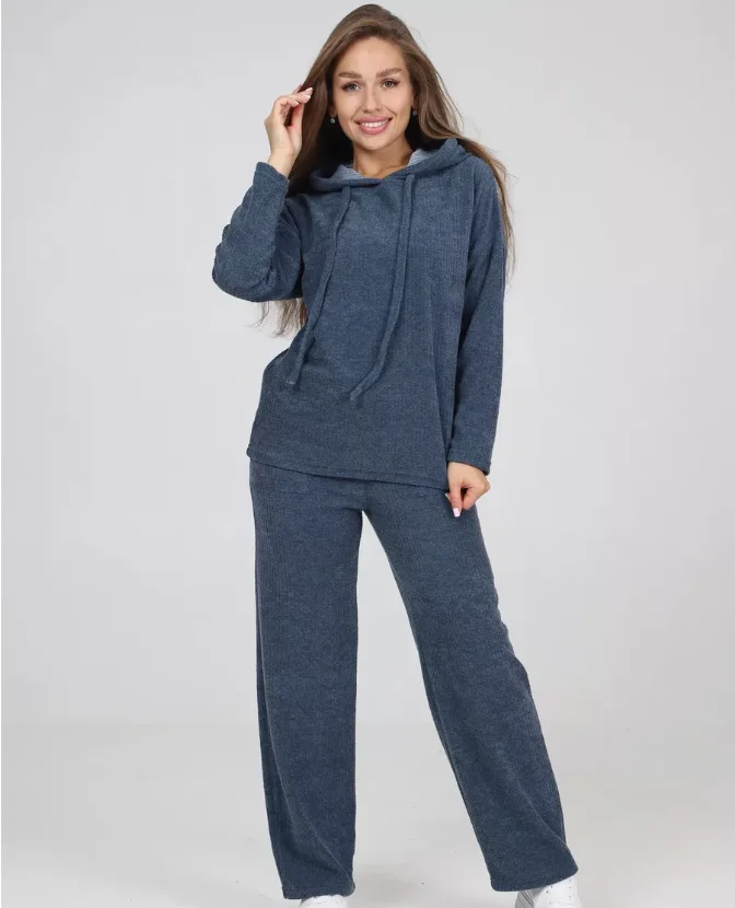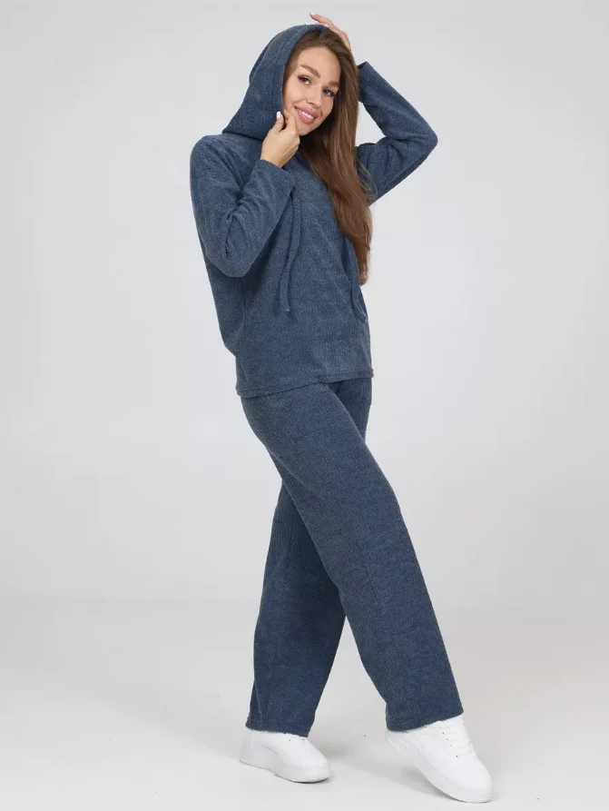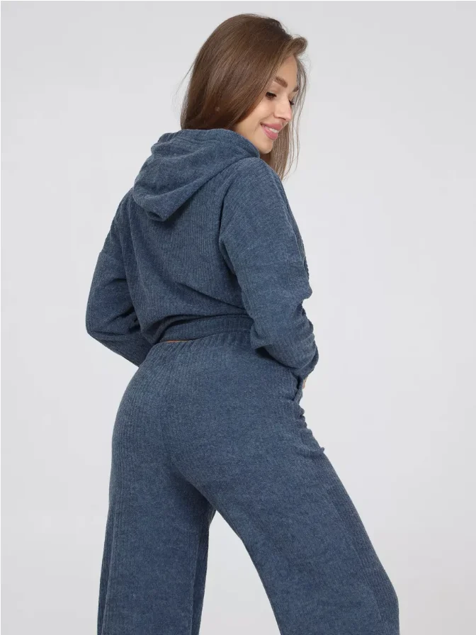Wholesale Custom Women's Winter Loungewear Set Blue Ribbed Knit Hoodie with Drawstring Pocket and Wide-Leg Pants Perfect Match