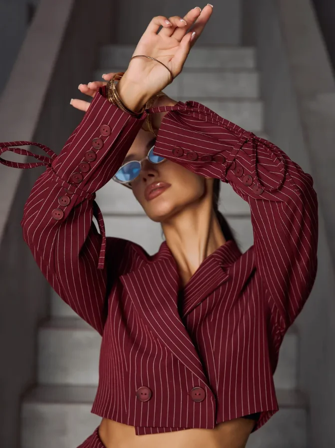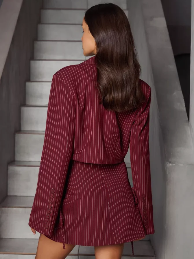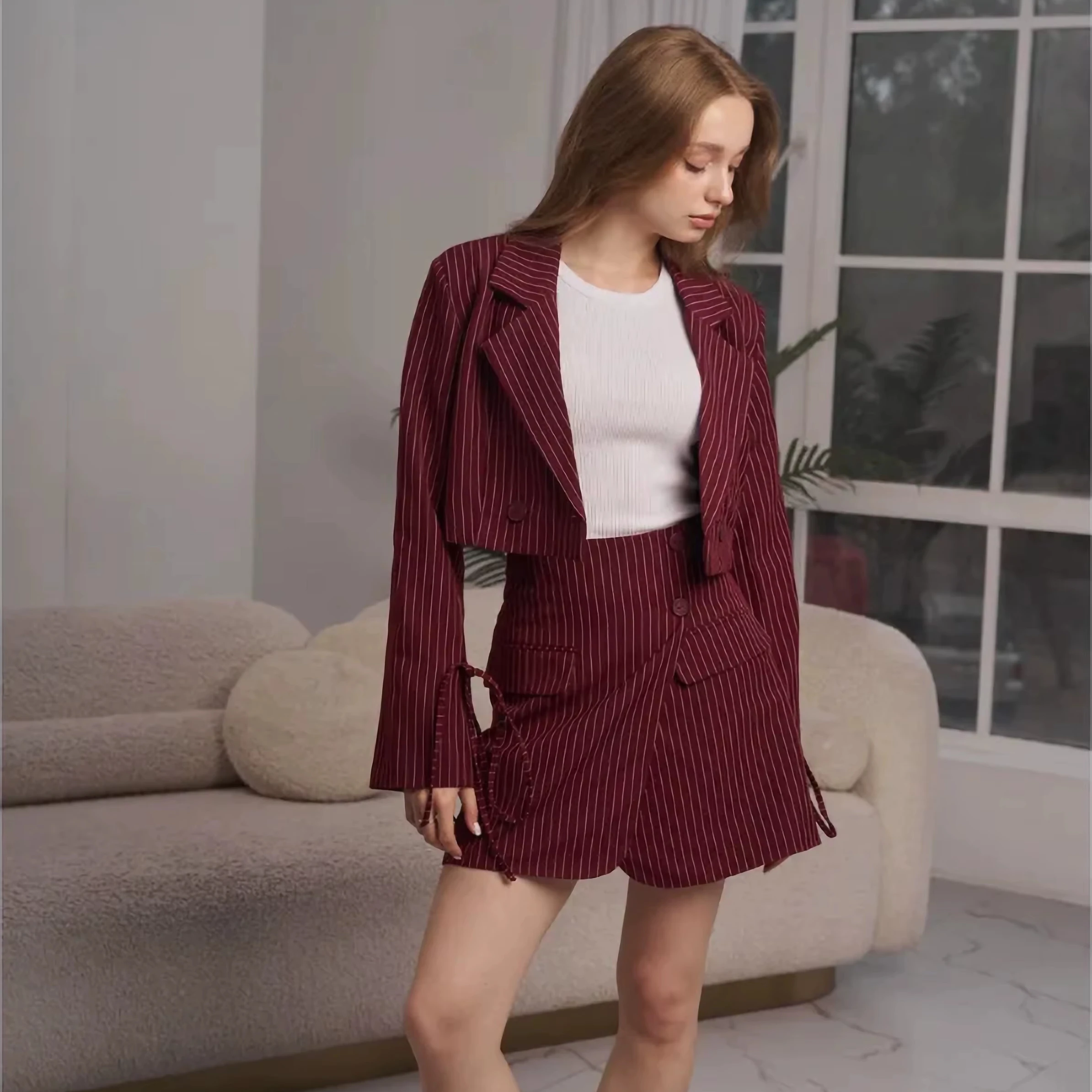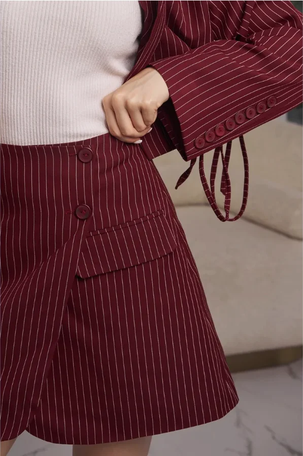 Elegant Casual Red Women's Suit High Quality Custom Made Includes Long Sleeve Striped Shirt and Above Knee Striped Skirt