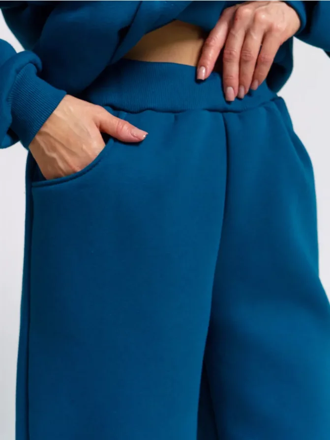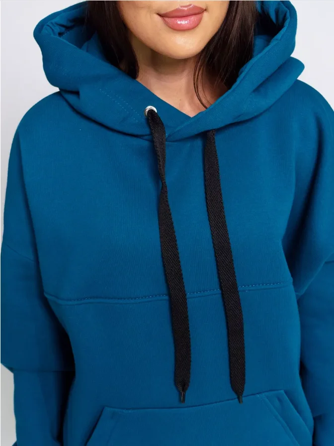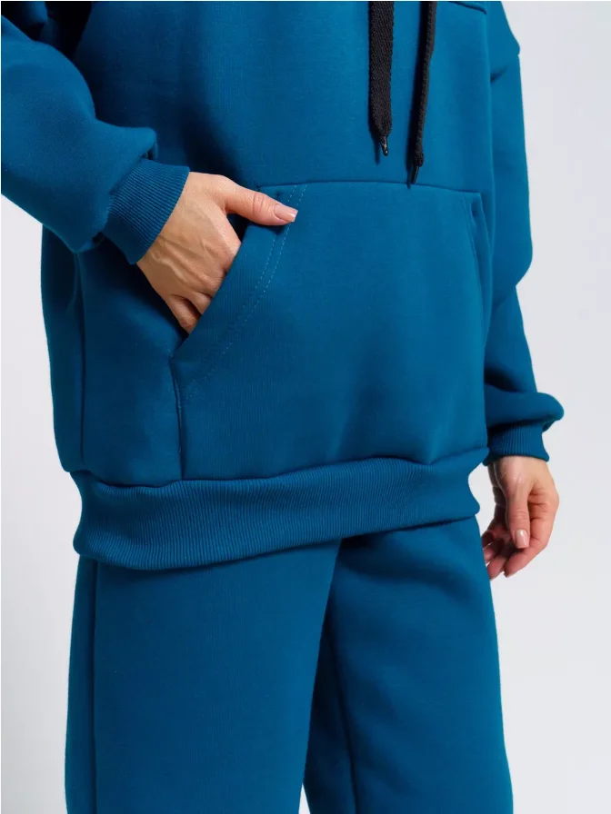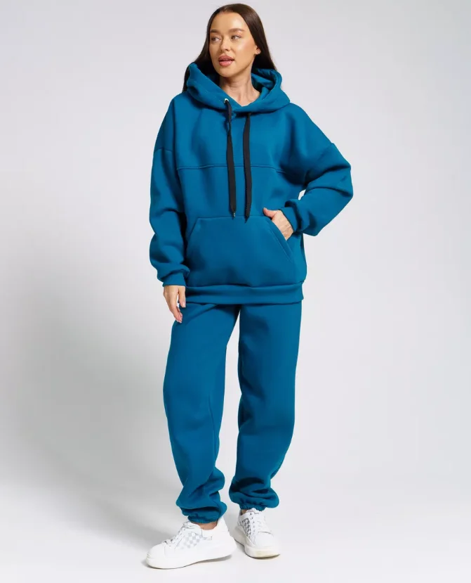 Youthful Energetic Women's Blue Solid Sports Leisure Suit Long-Sleeved Hooded Sweatshirt Drawstrings Sweatpants for Winter