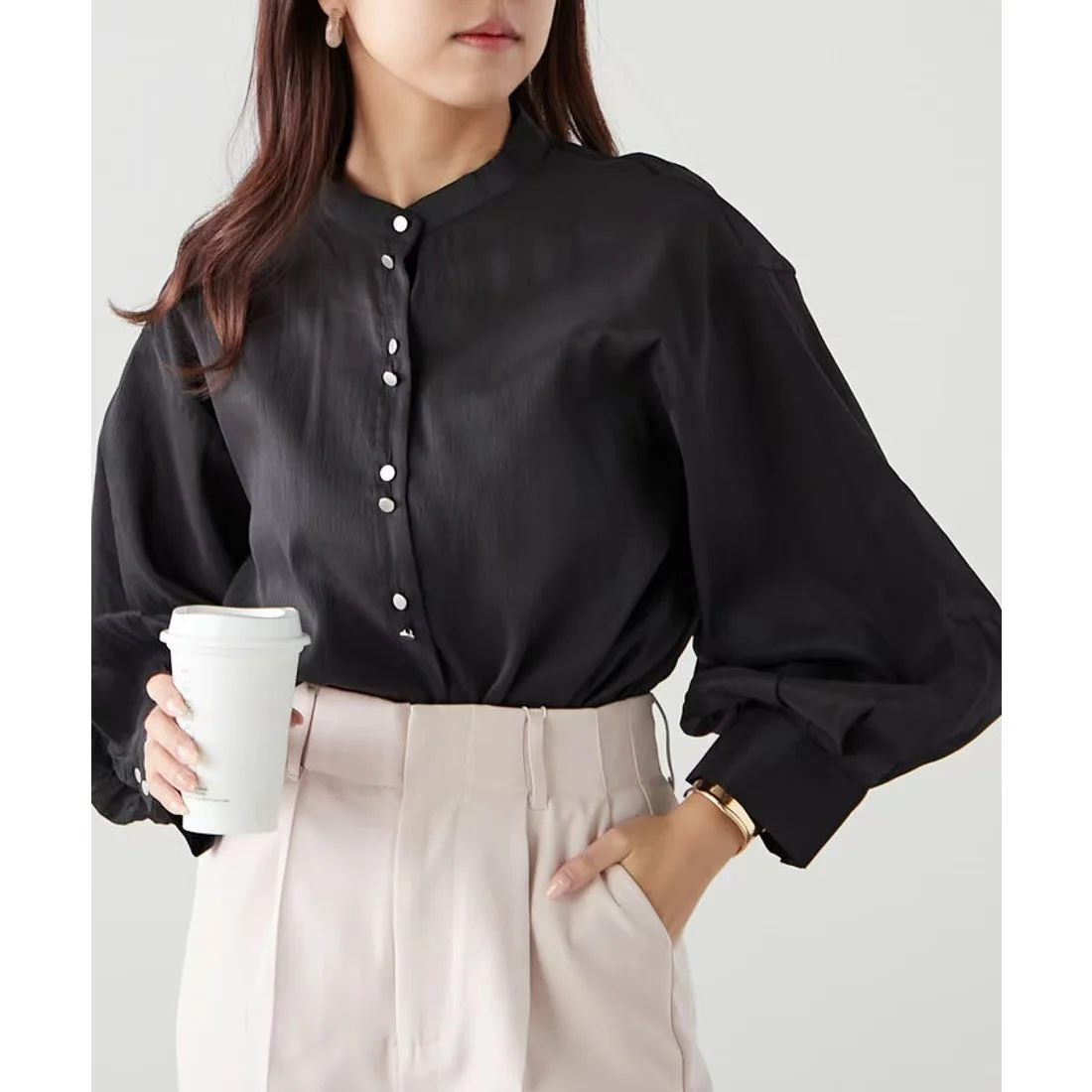 Women's Chic Vintage Office Wear Fashion Tops Long Sleeve Button-Up Casual Blouses Poplin Solid Shirts Plain Dyed Chiffon Fabric