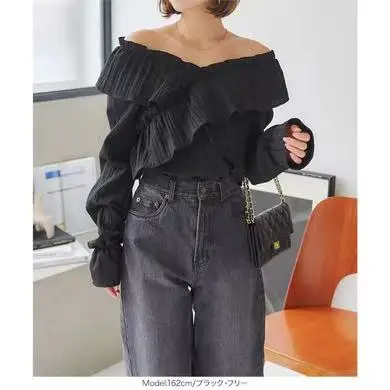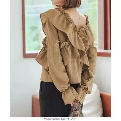 Women's Summer Solid Color Tight Long Sleeve Top with Lace Ruffles Embroidery Decoration ODM Woven