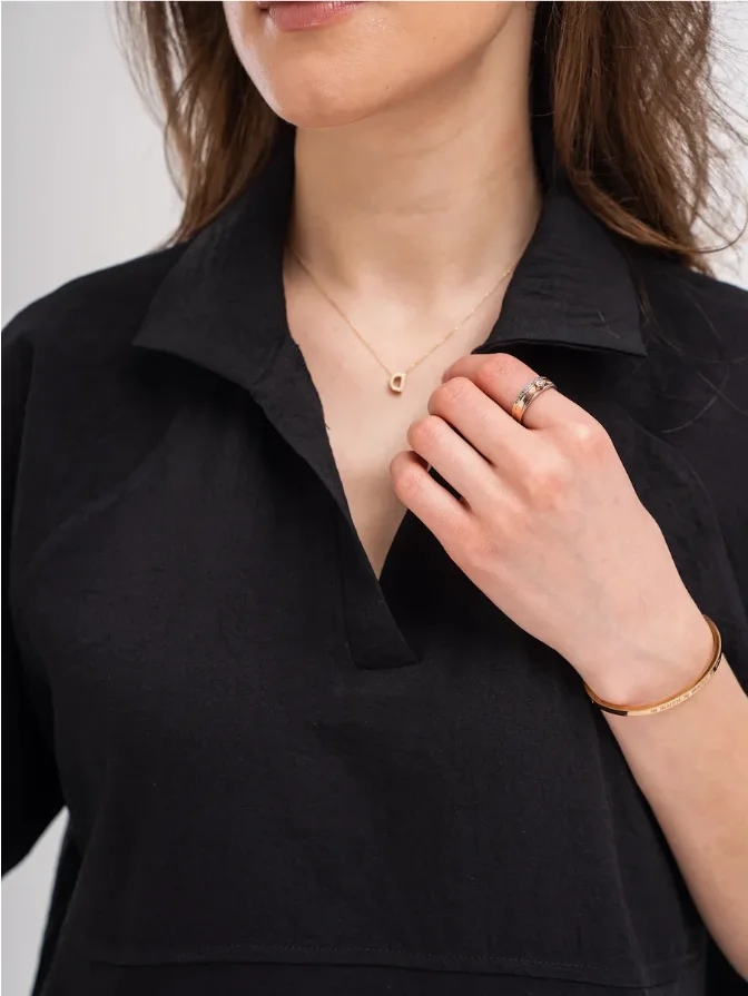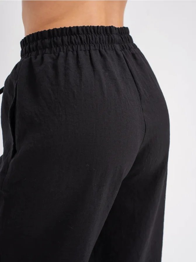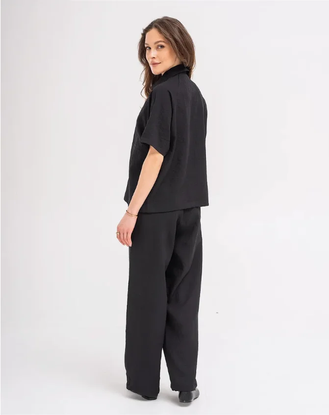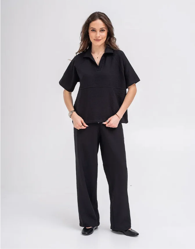 Custom Made Women's Summer Sports Set 100% Linen Black Short Sleeve Polo Shirt & Stretch Wide Leg Pants High Quality