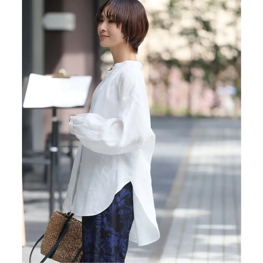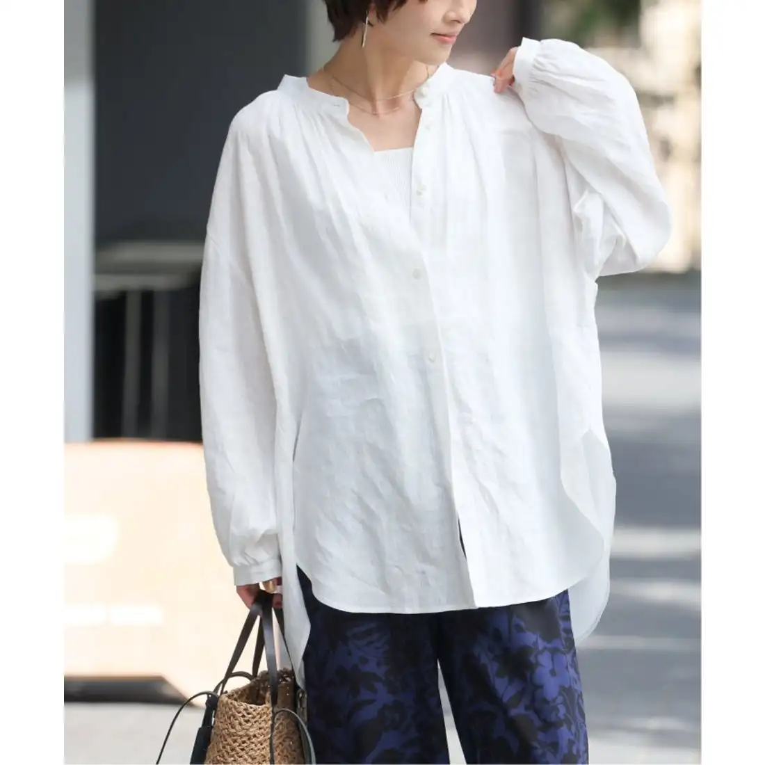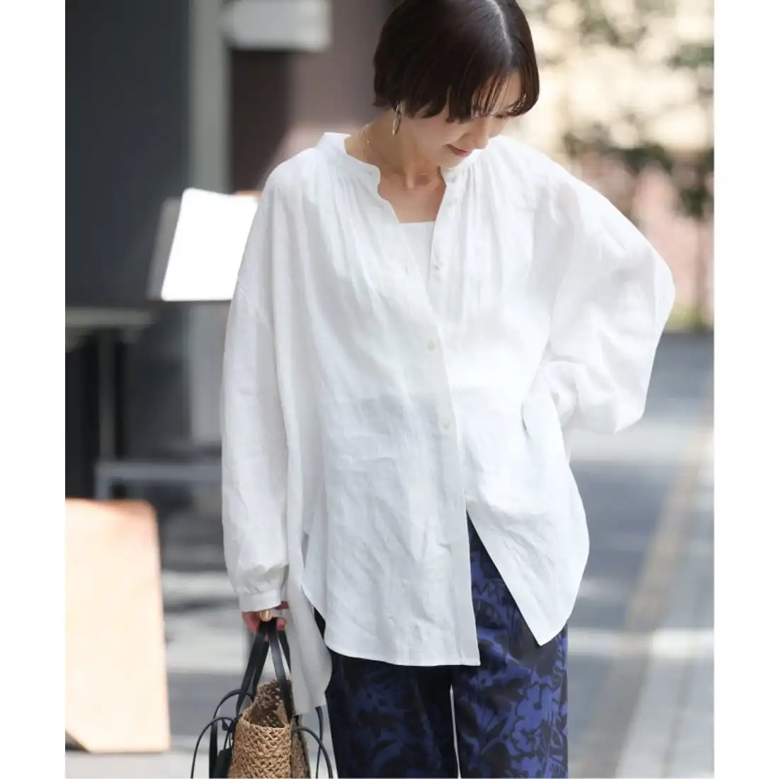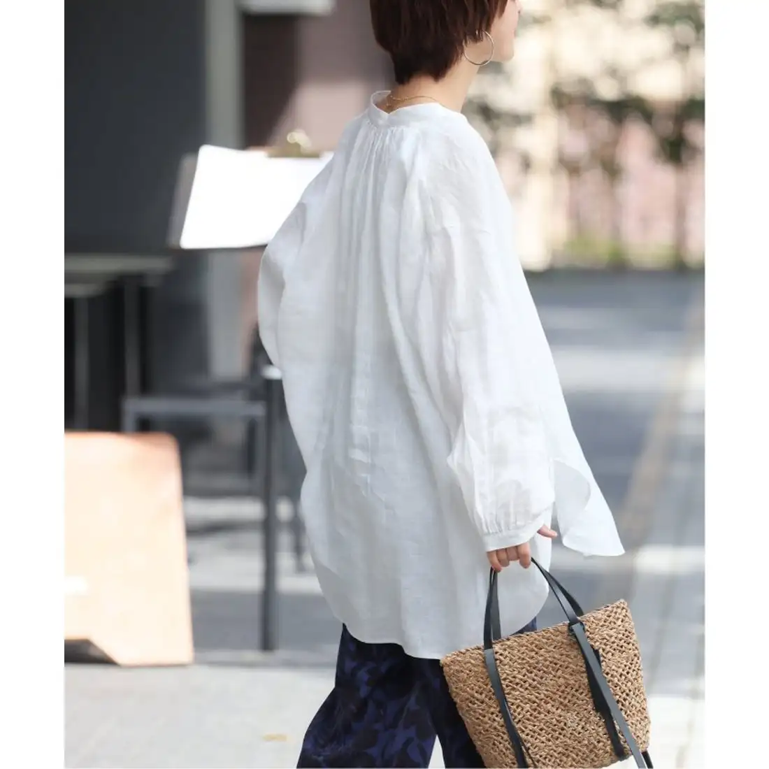 Autumn New Fashionable Loose Women's Linen Shirt Pleated Bubble Sleeves Simple Casual Style Solid One Size Boutique Wholesale