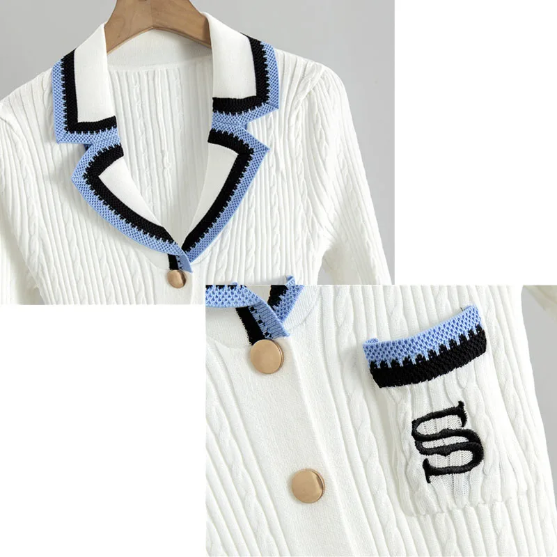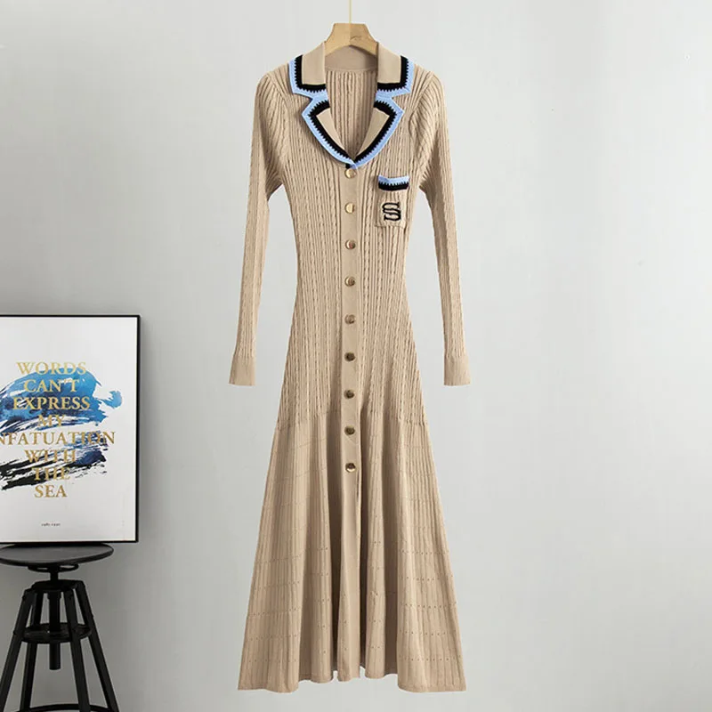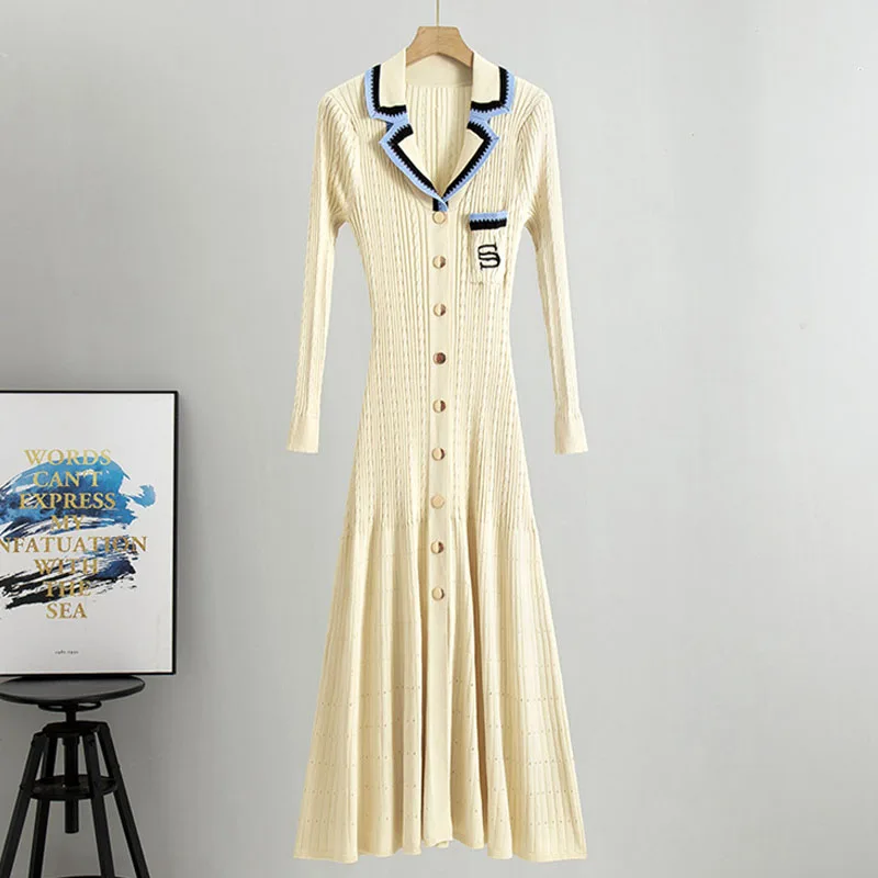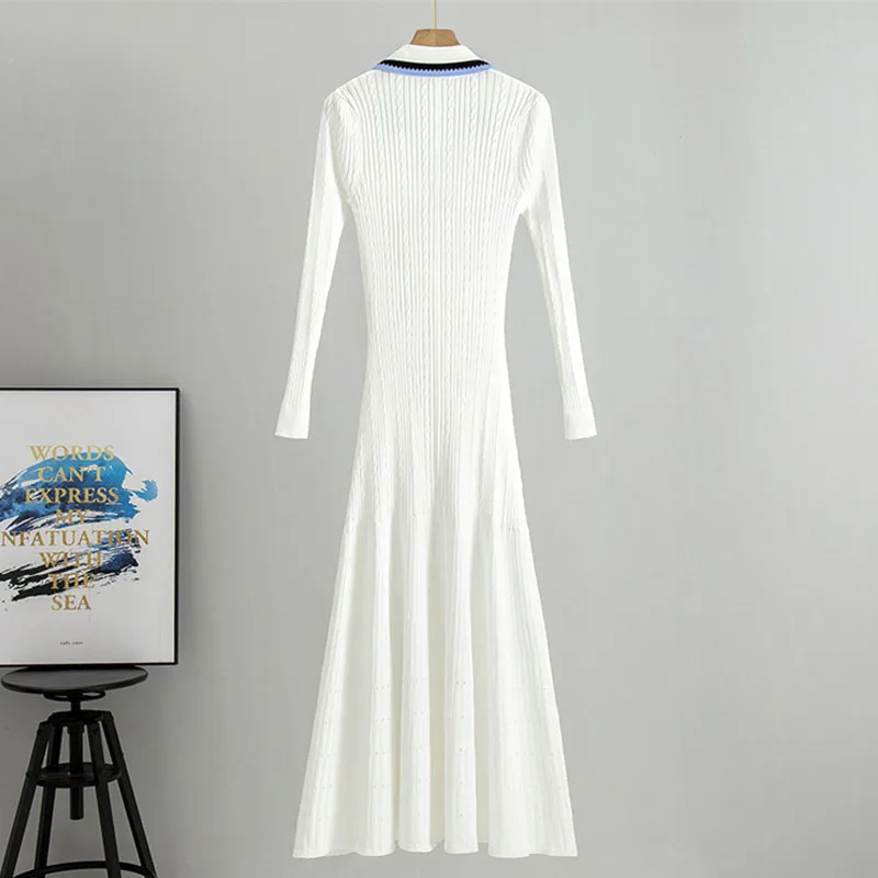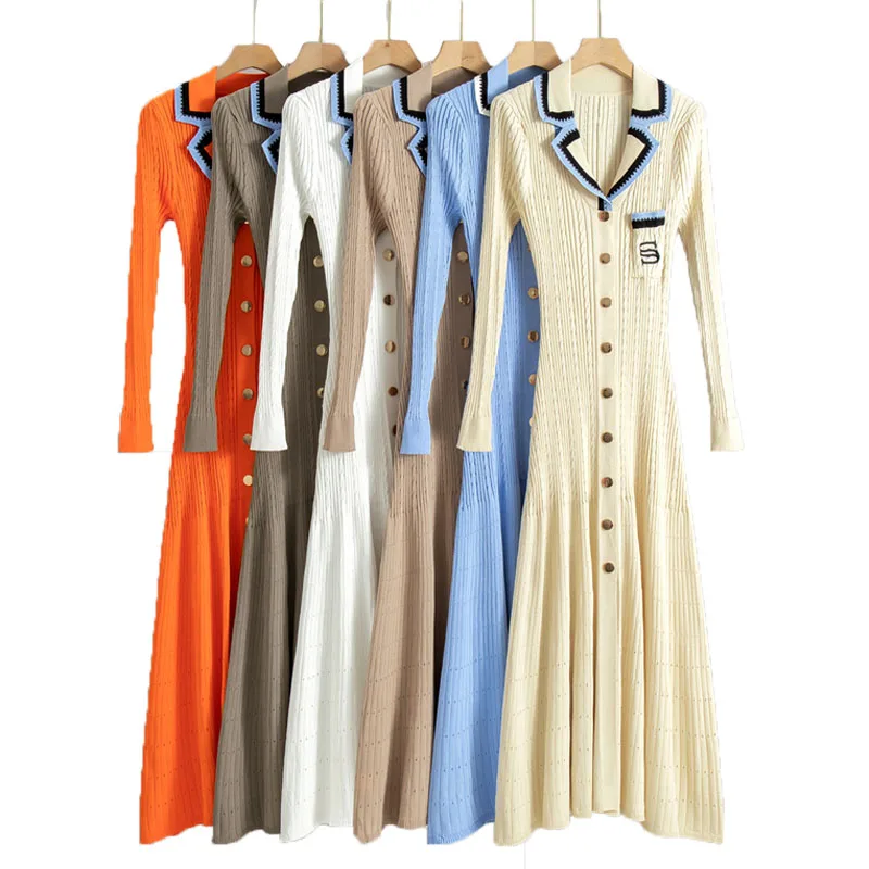 2025 New Simple Polo Neck Knitted Dress Women Casual Embroidery Long Sleeve Dress Knitted Custom Long Skirt