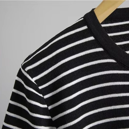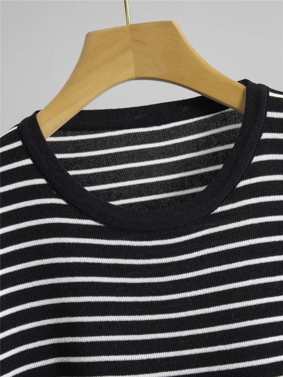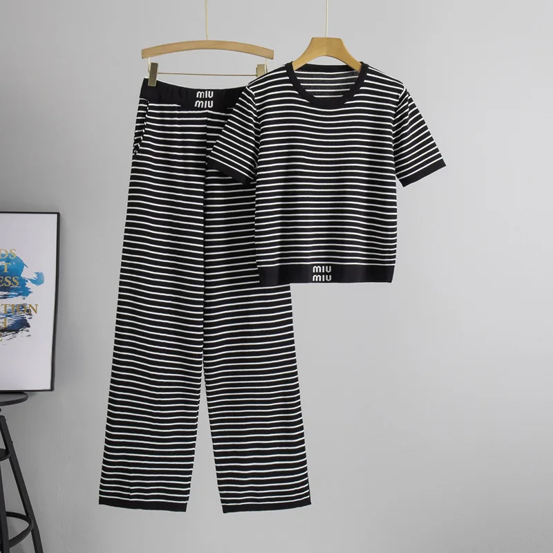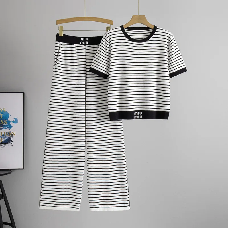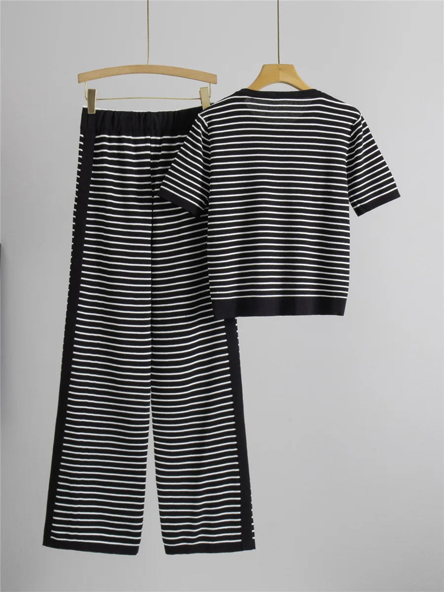 Summer New Simple Striped Round Neck Loose Short Sleeved Knitted Top Wide Leg Pants Knitted Two-piece Set for Women
