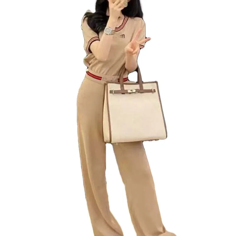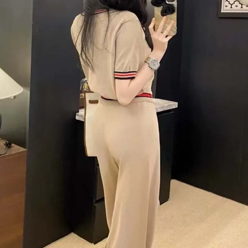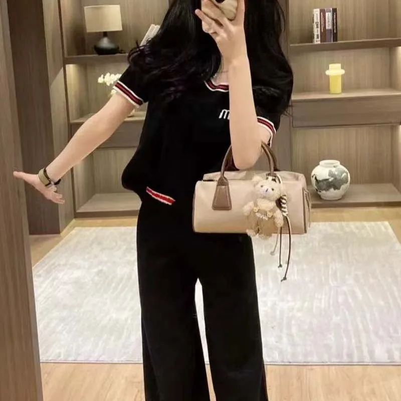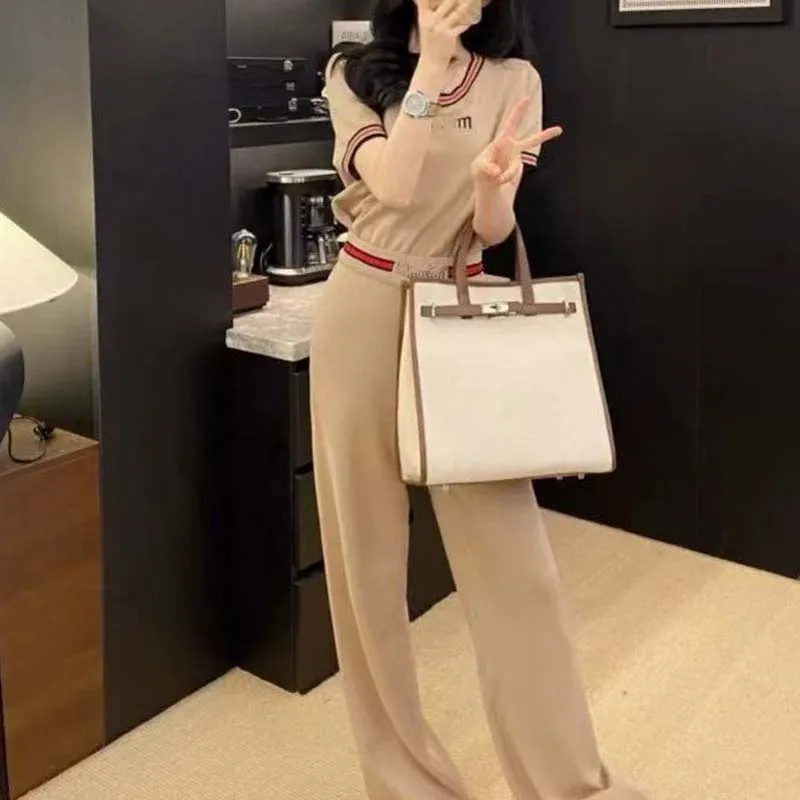 Knitted Two-piece Women's High-quality Letter Embroidery Contrasting Short Sleeved+wide Leg Pants Fashionable Women's Set