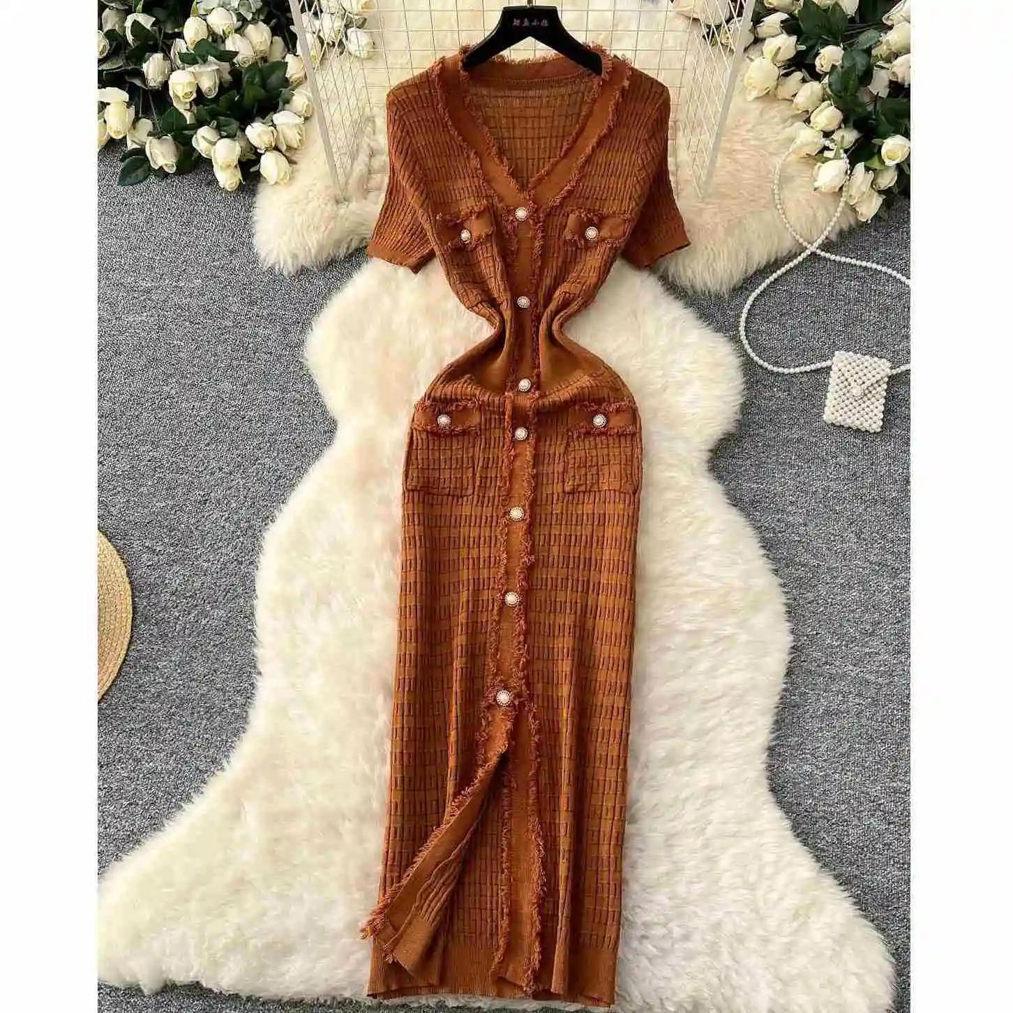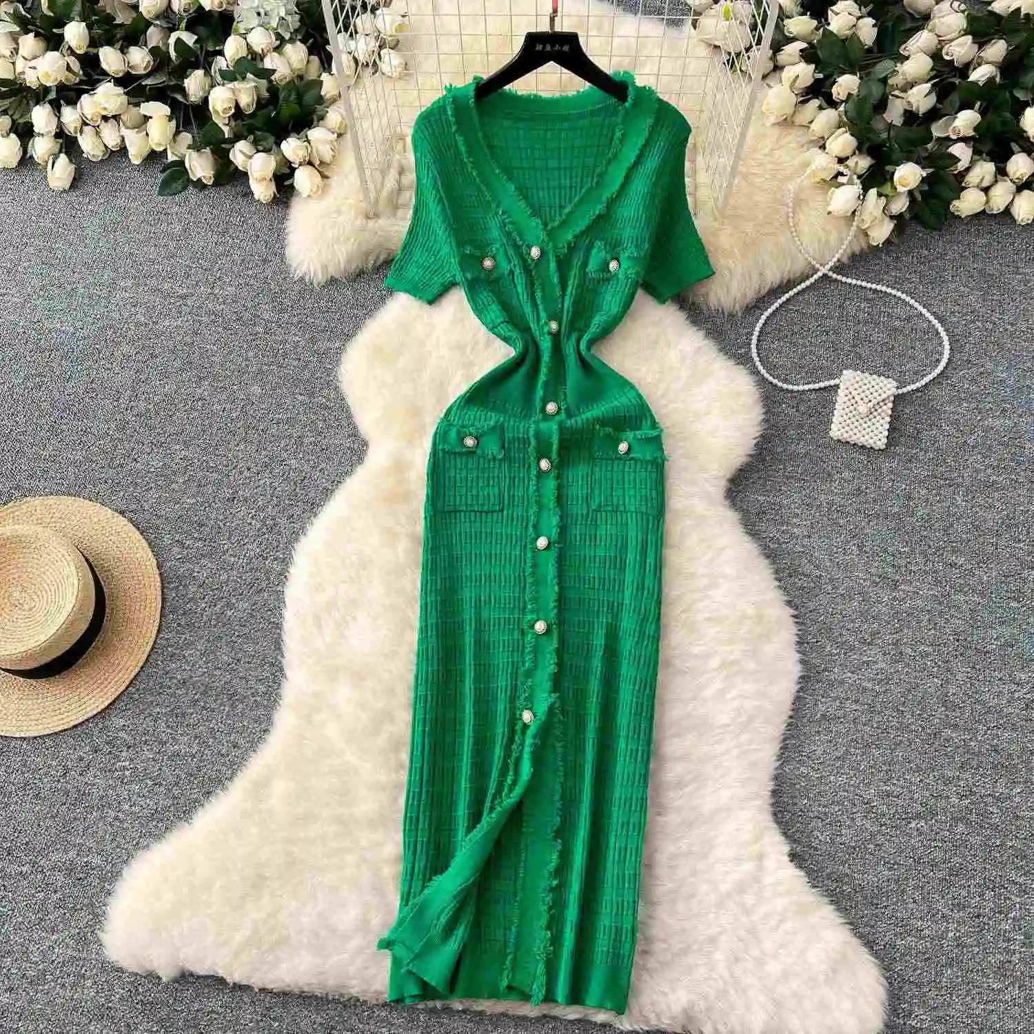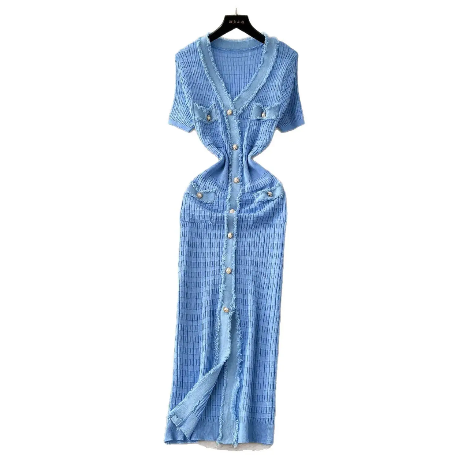 Summer Temperament Long Skirt Retro V-neck Single Breasted Slim Fit Dress with Waist Cinching and Slimming Effect Knitted Dress