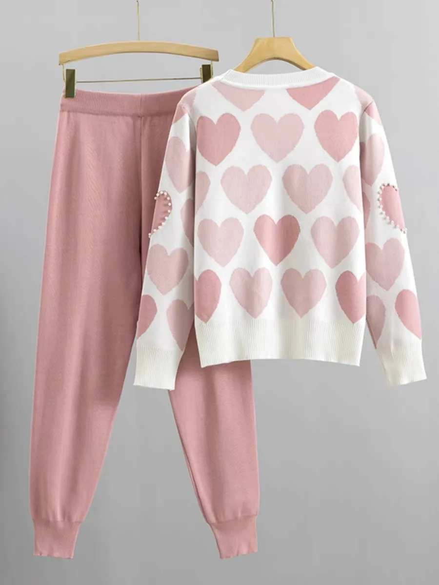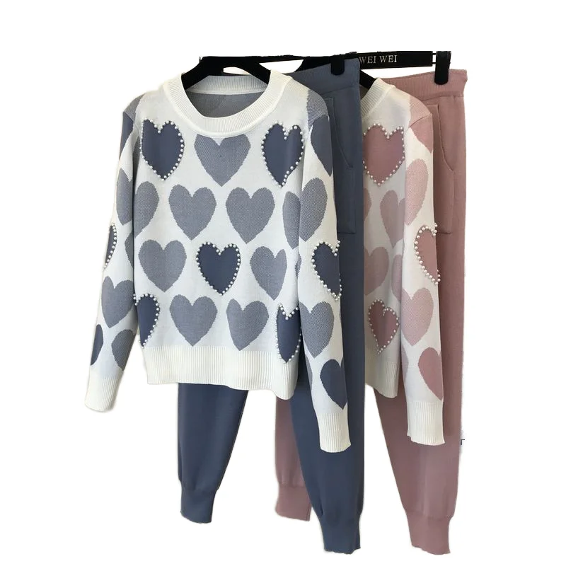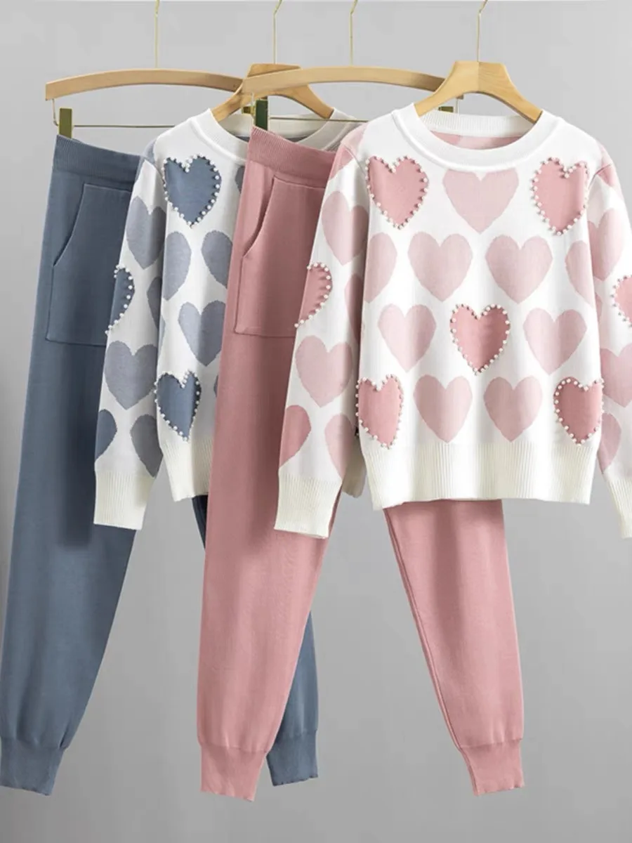 Fashion Autumn and Winter Women's Set Round Neck Heart-shaped Nail Bead Long Sleeved Top High Waisted Casual Pants Two-piece Set