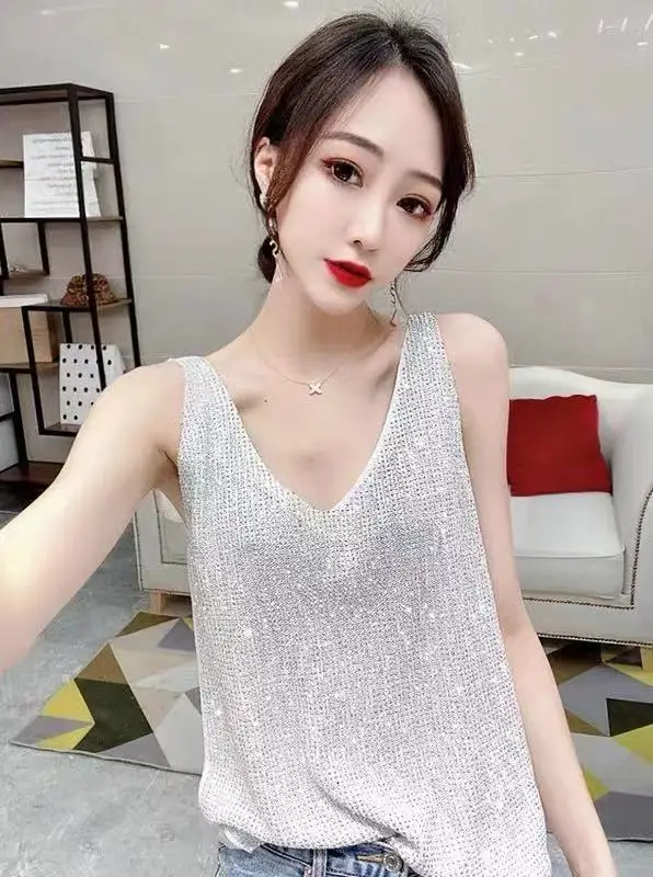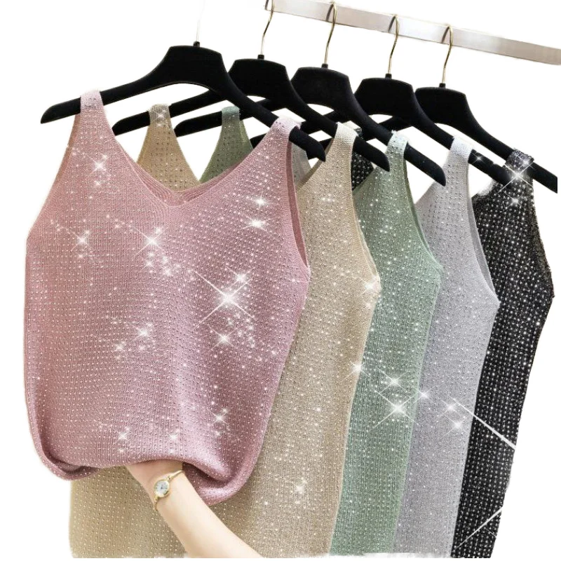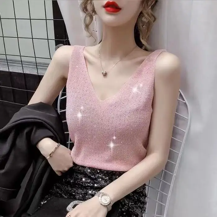 Summer New Women's Sleeveless Top V-neck Rhinestone Suspender Fashion Versatile Slimming Vest