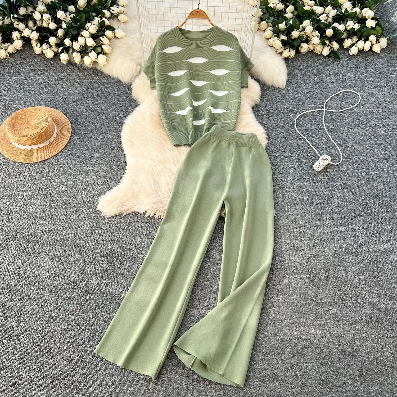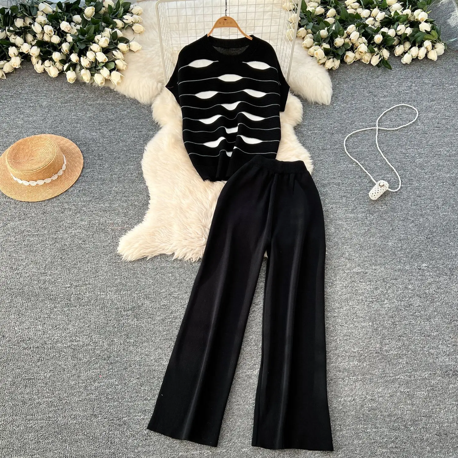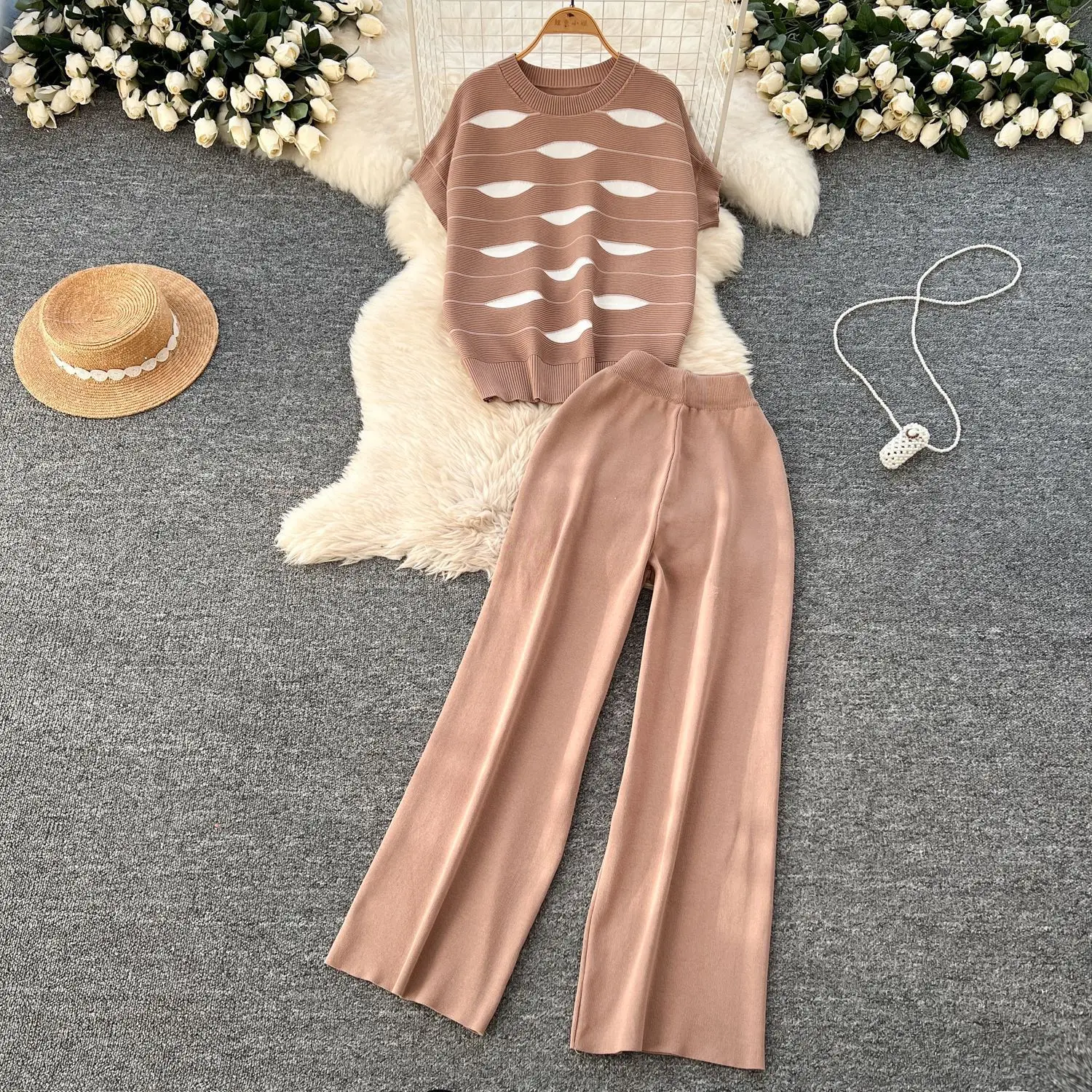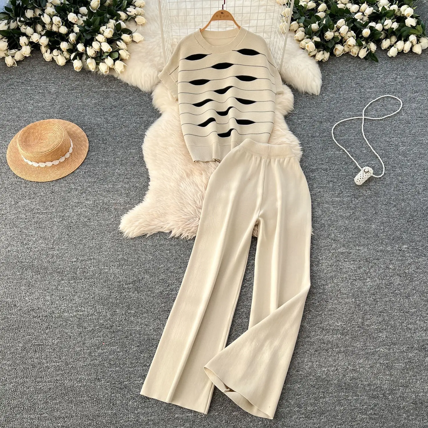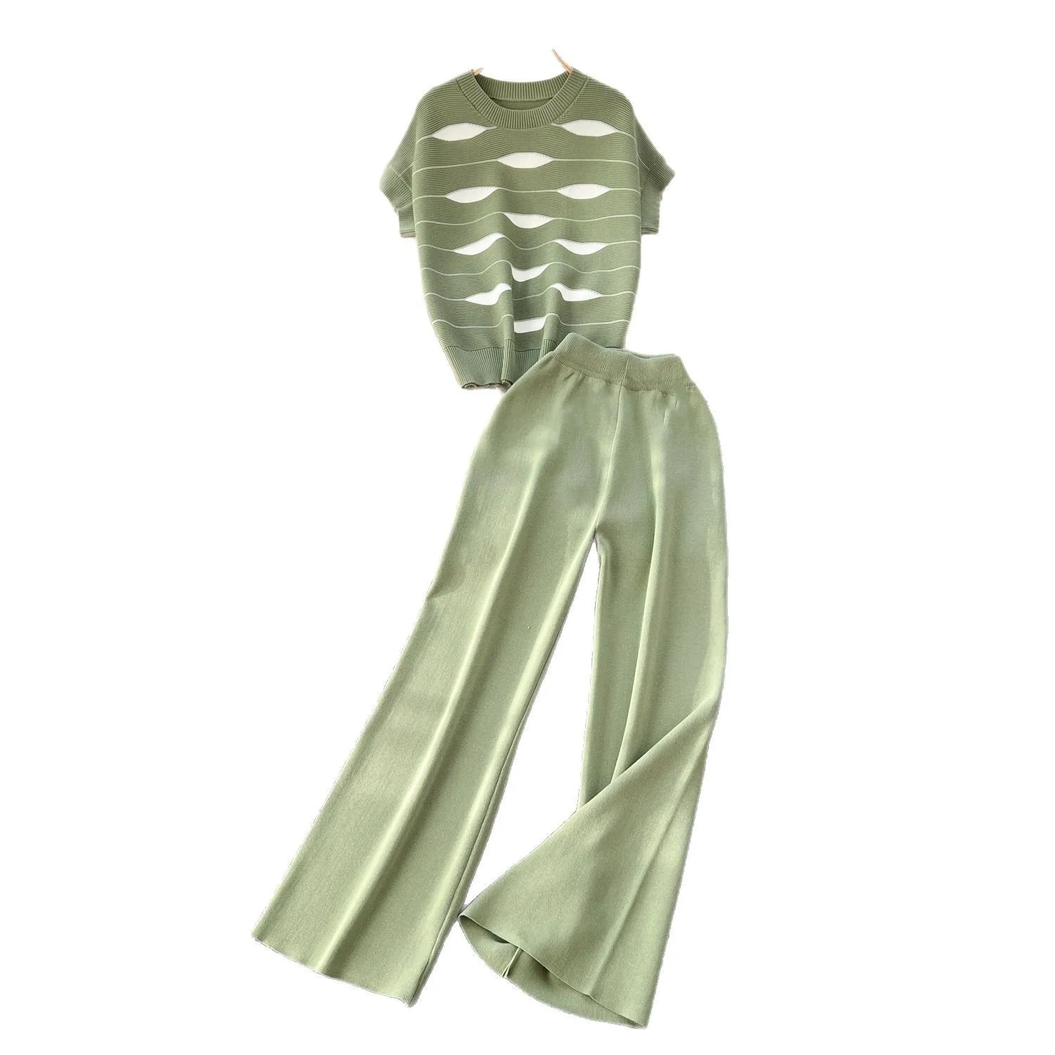 Casual High-end Striped Sweater Versatile Pants Fashionable Temperament Women's Two-piece Set Summer Knitted Set