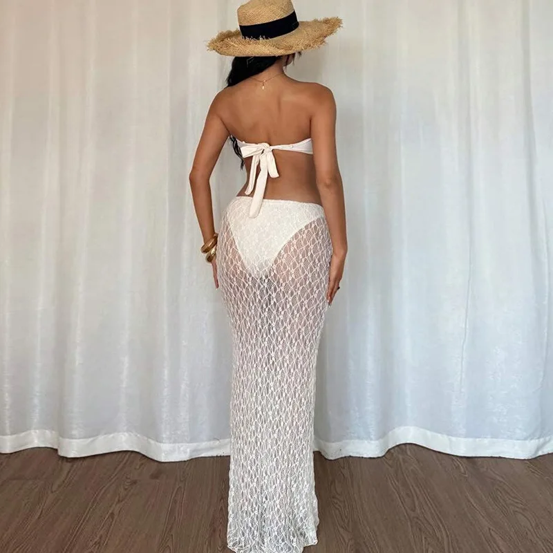 White Lace Crop Skirt Set Sexy Women Summer Beach Outfits Crop Top Long Skirt Two Piece Set