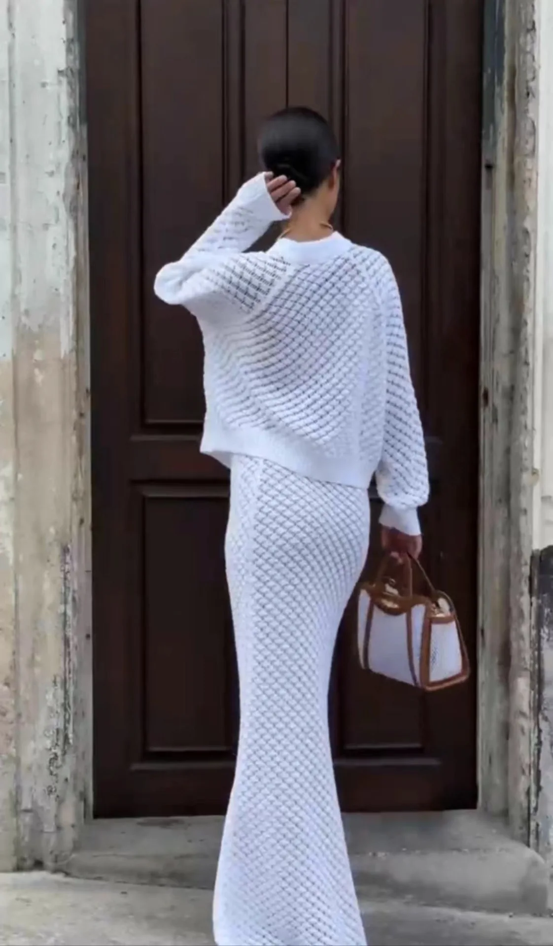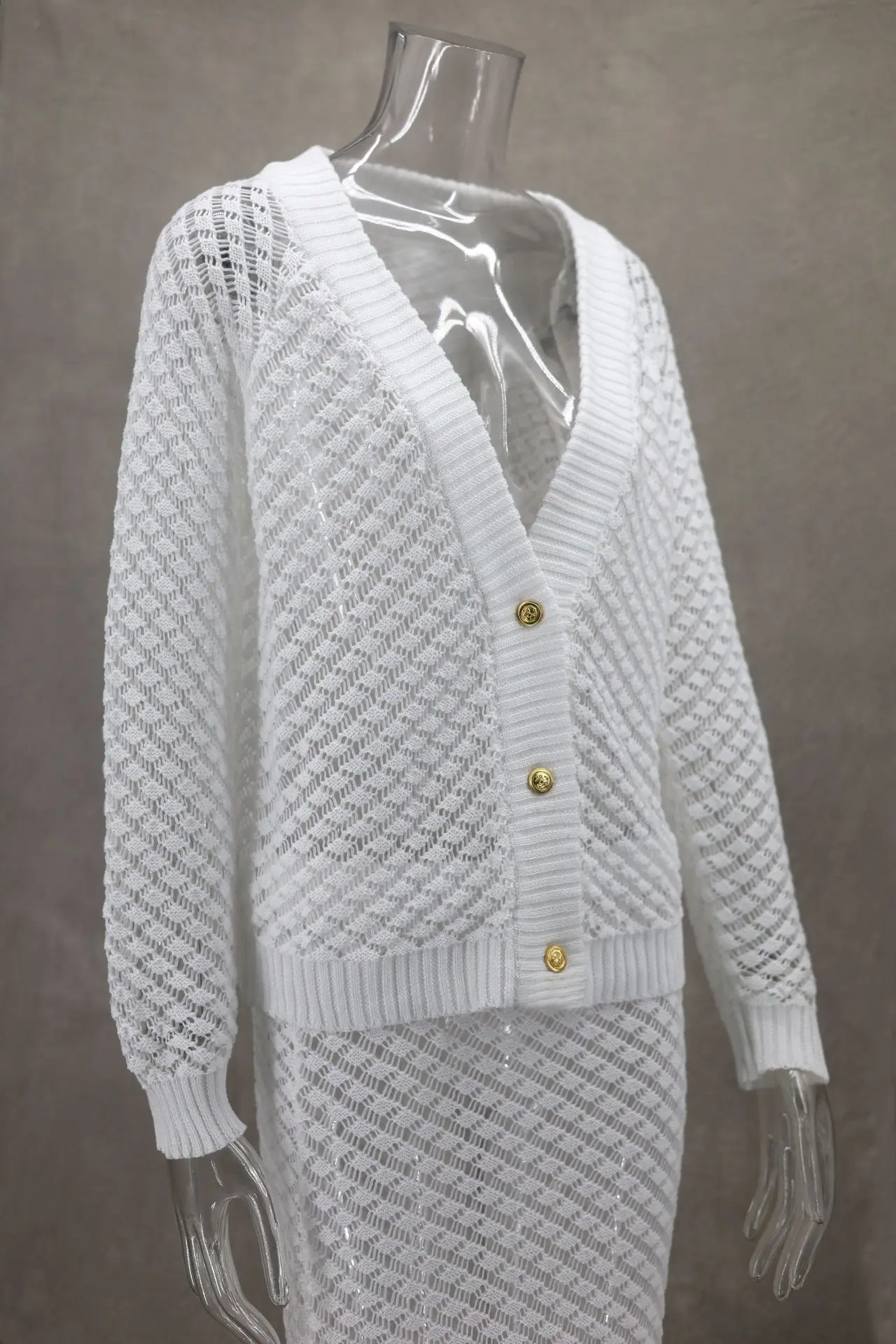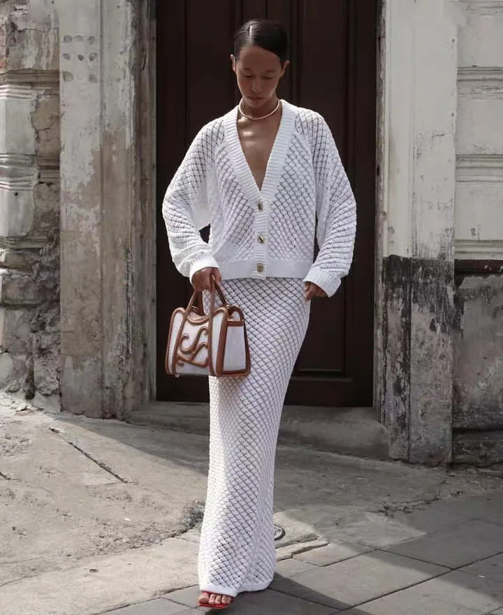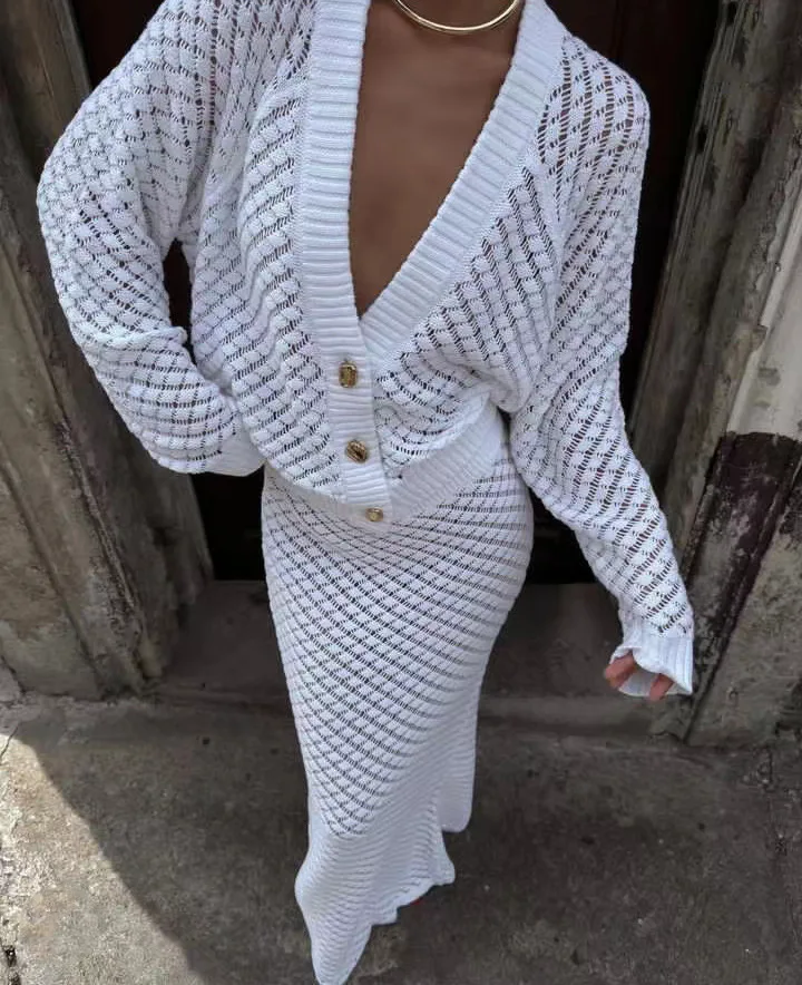 White Hollow Cardigan Skirt Set Sexy Summer Knitted Sets Women Long Skirt Set Two Piece