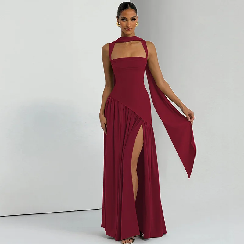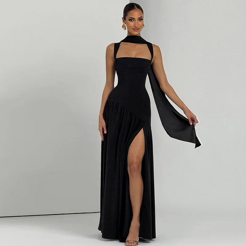 Women Dresses Elegant Strap Dress Slit Square Collar Sexy Maxi Dresses Sleeveless