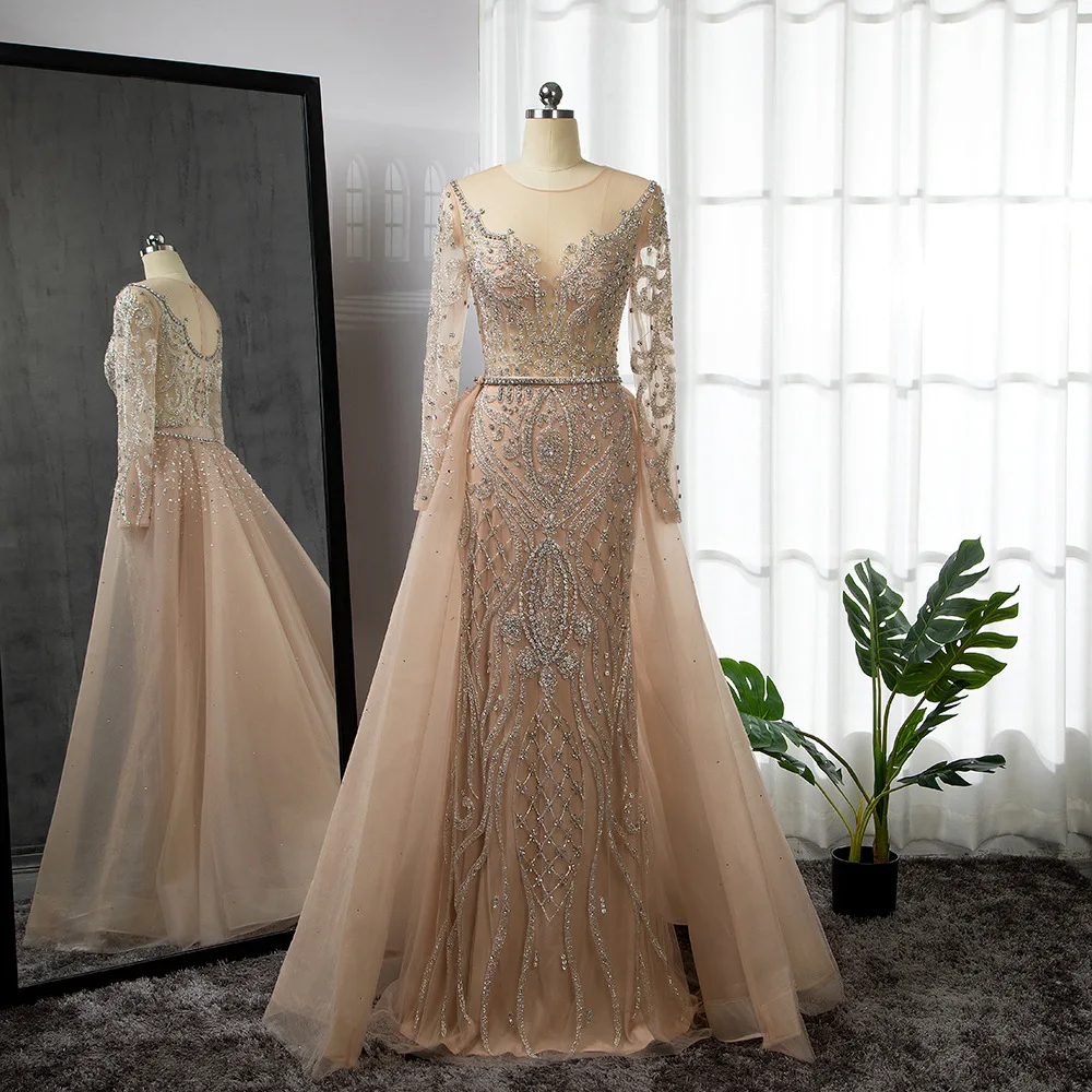High-End Elegant Round-Neck Long-Sleeve Solid-Color Full-Body Beading Luxury Diamond Heavy Craftsmanship Mermaid Evening Gown