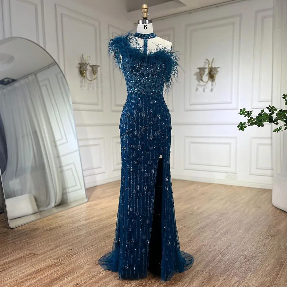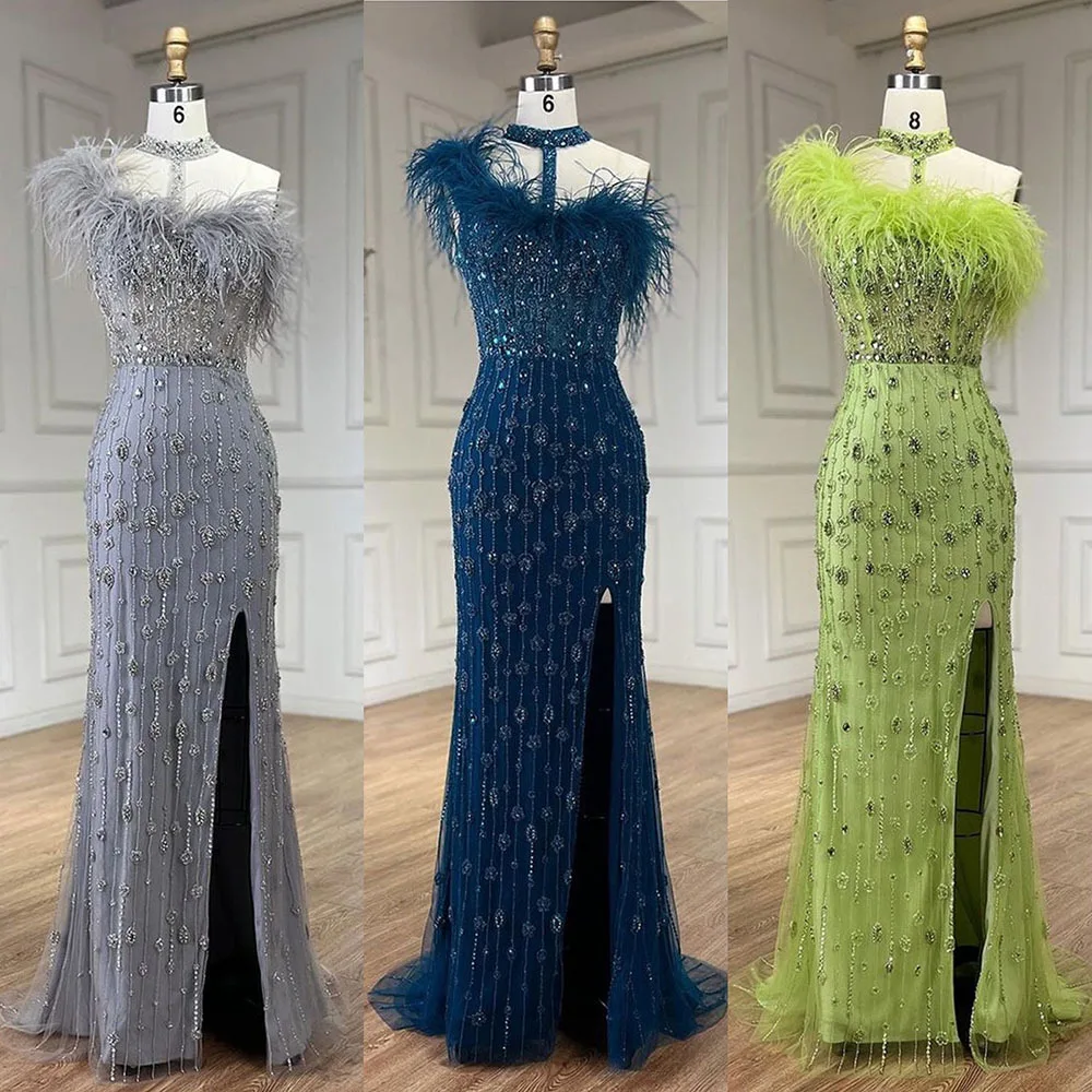 New Design Heavy Embellished Luxury Off-Shoulder Sleeveless Slim-Fit Maxi Solid Color Slit Mermaid Evening Gown with Feather