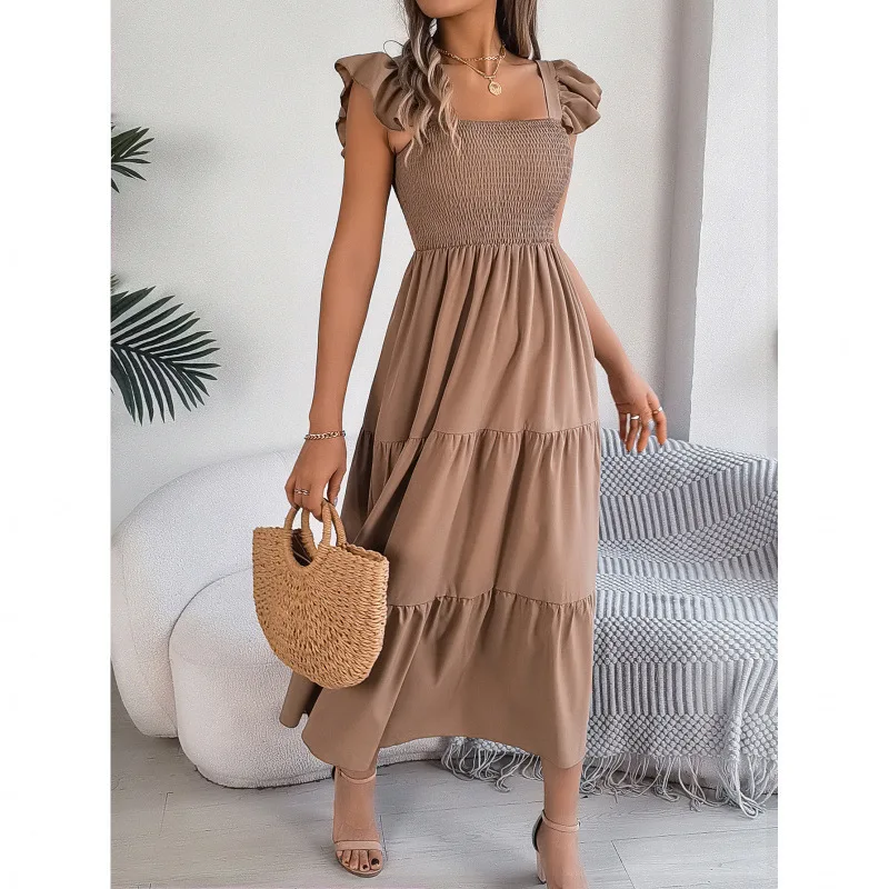 Women's Minimalist Summer Solid Color Short Sleeve Smocked Square Neck Backless Ruched Hem Maxi A-Line Casual Dress