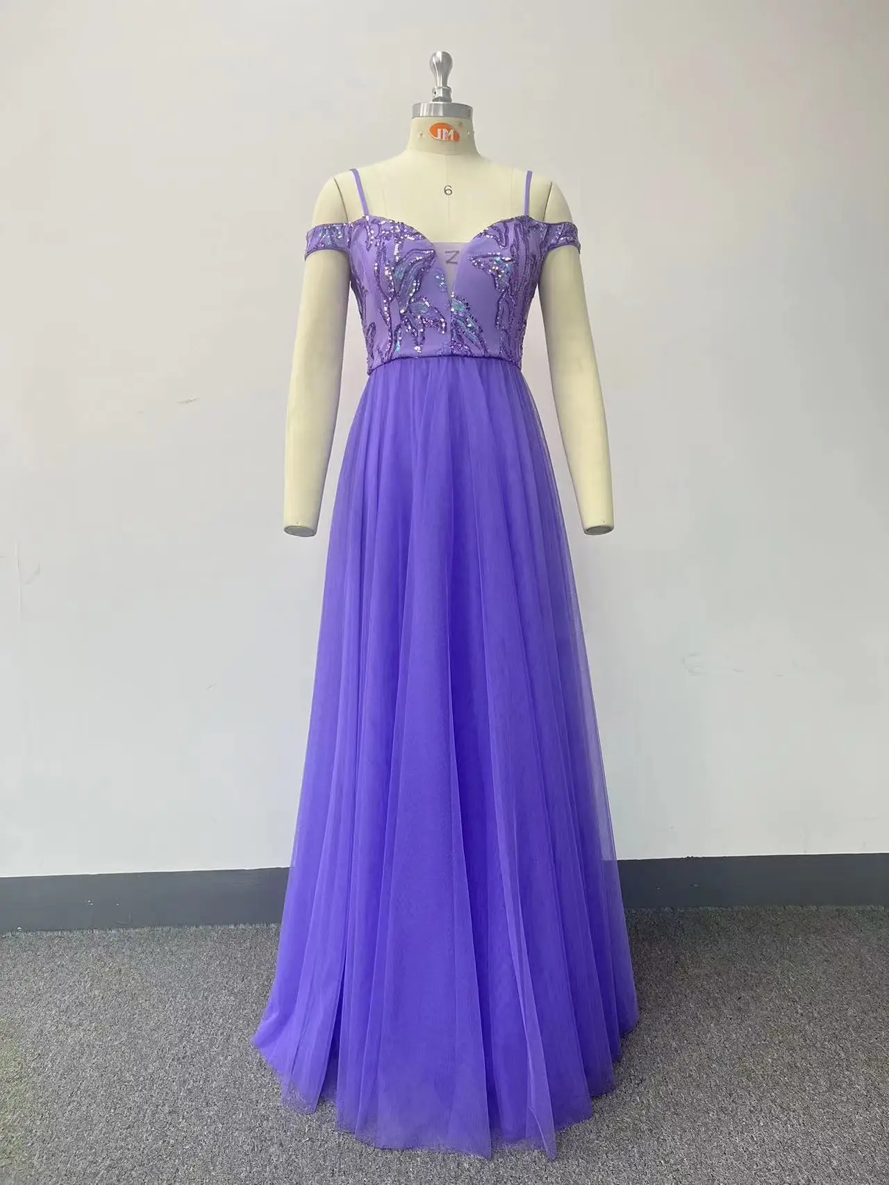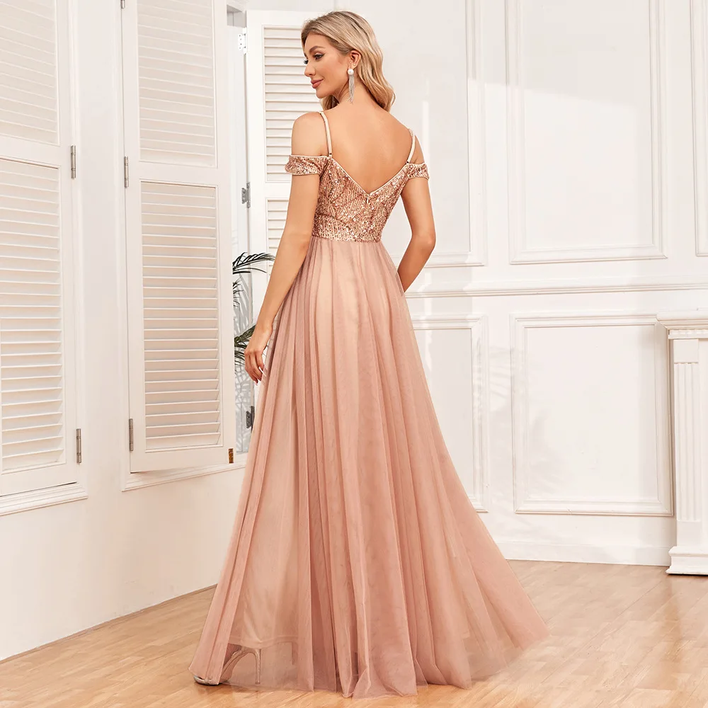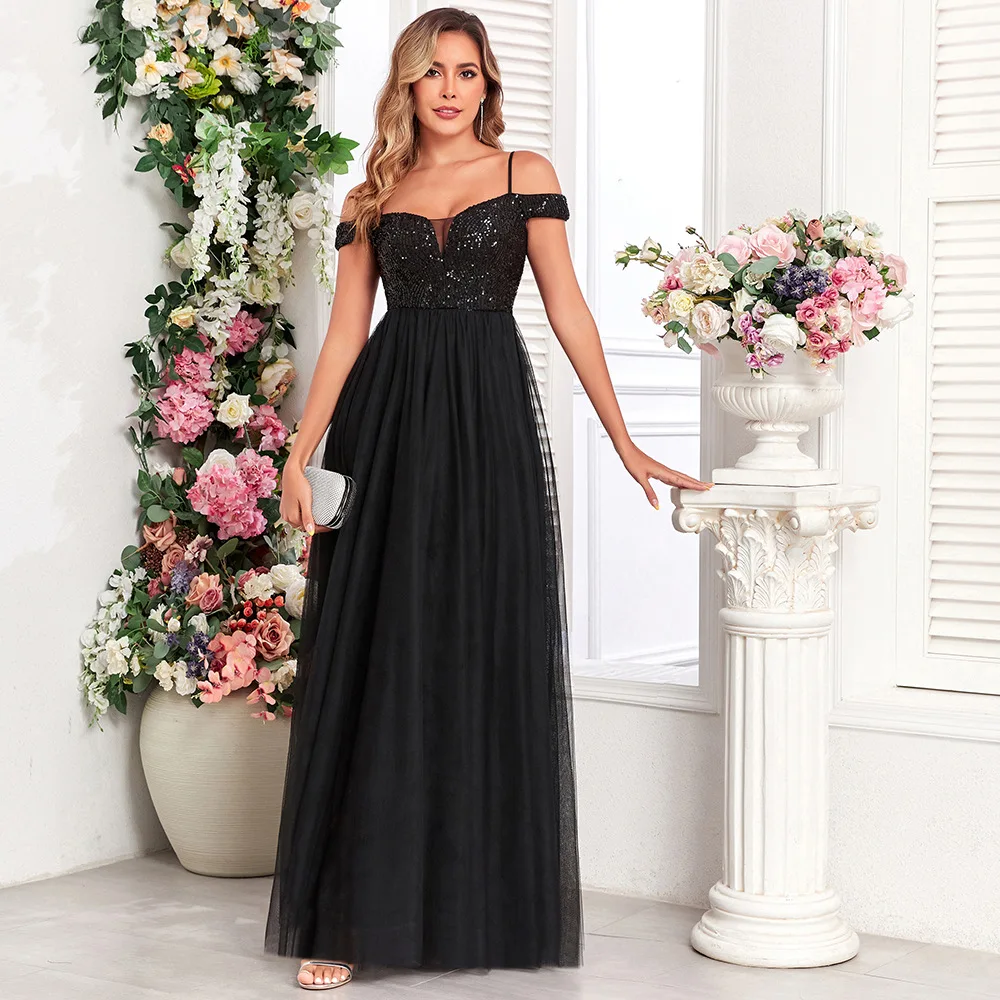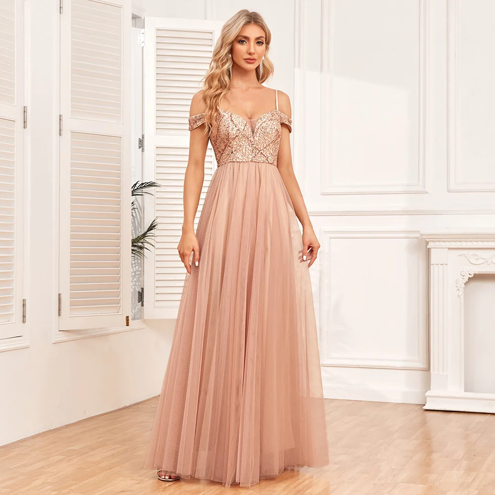 Elegant Women's Off-Shoulder Spaghetti Strap V-Neck Backless Sequin Embroidery Waist-Defining A-Line Solid Color Evening Dress