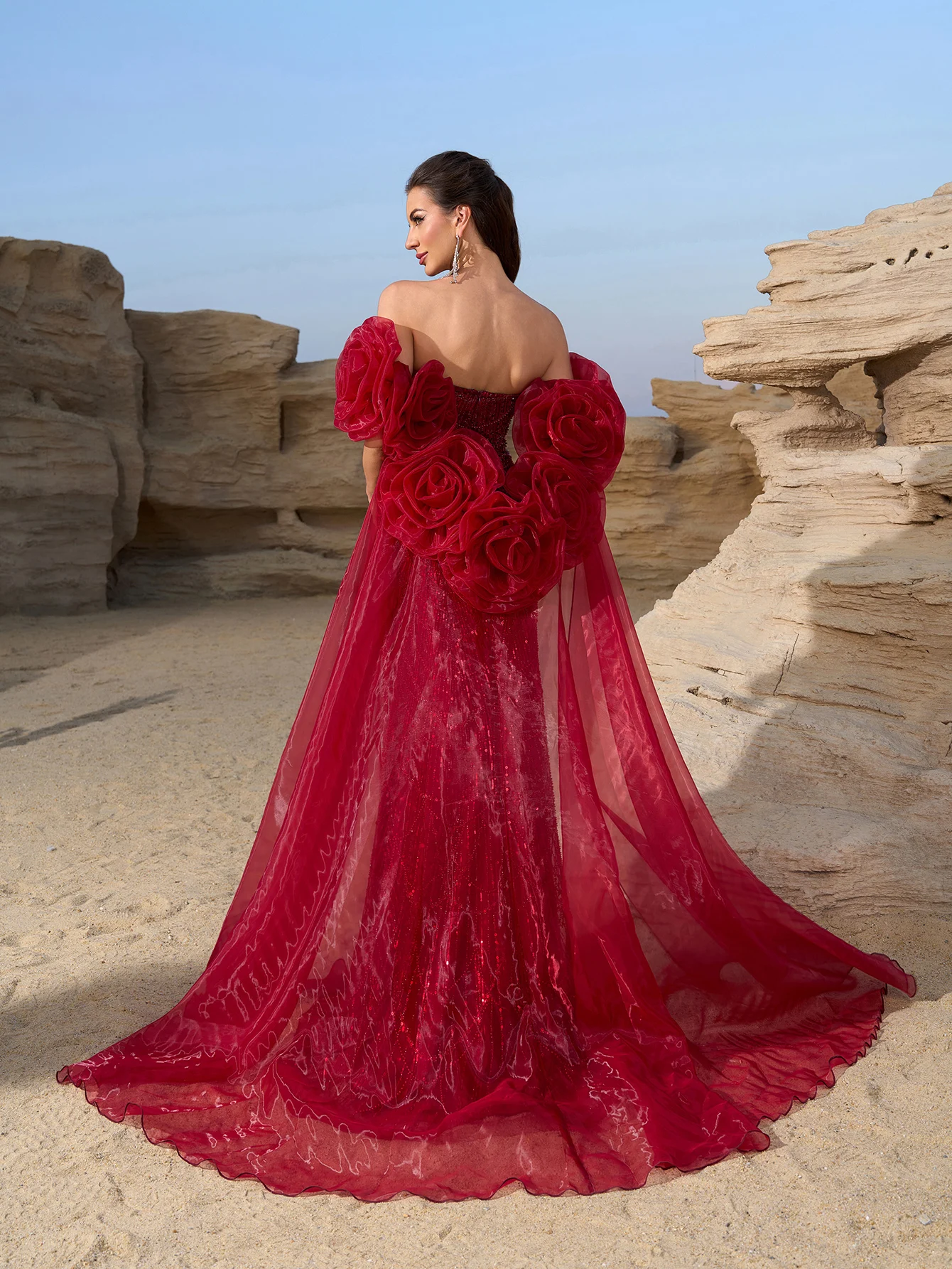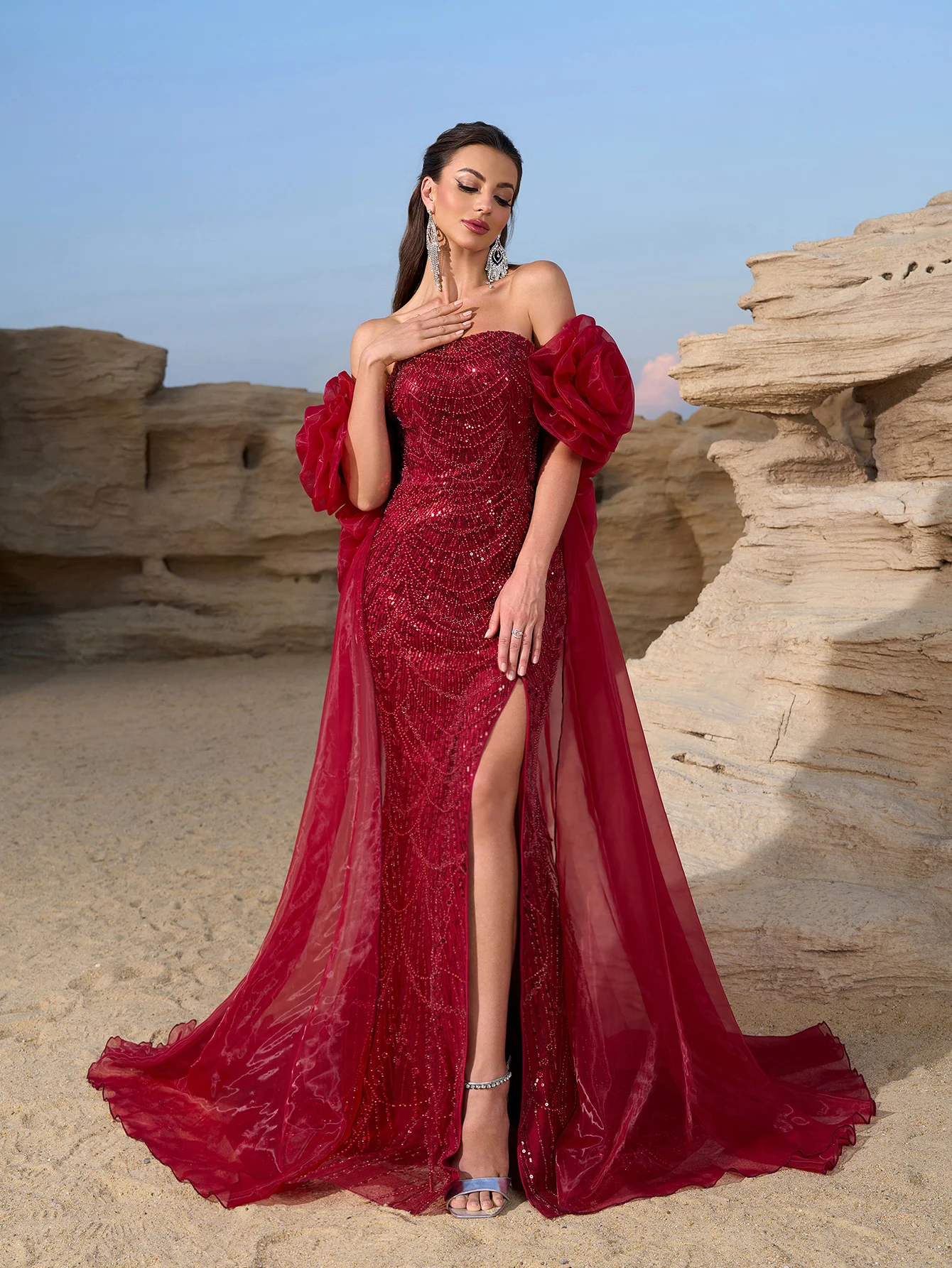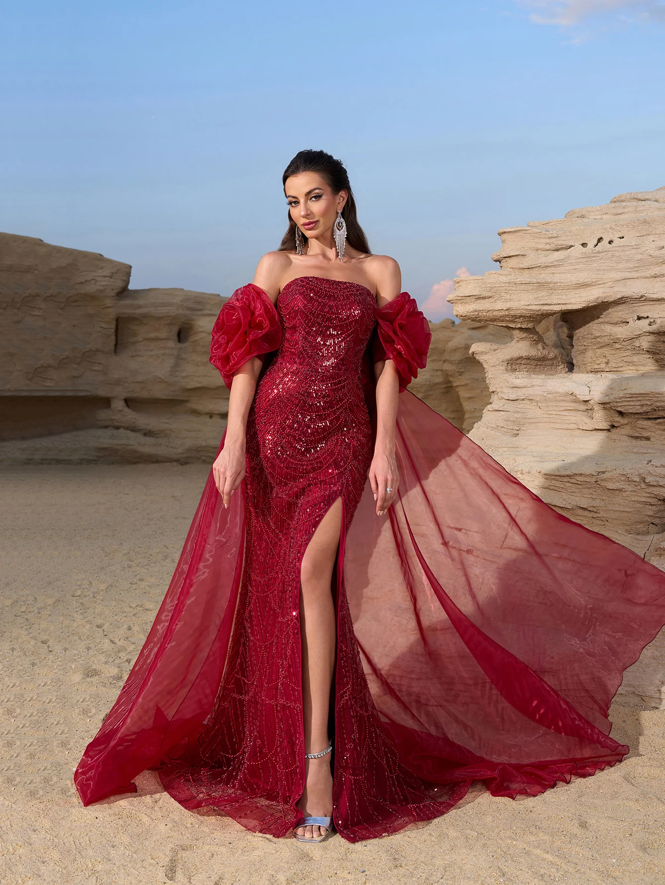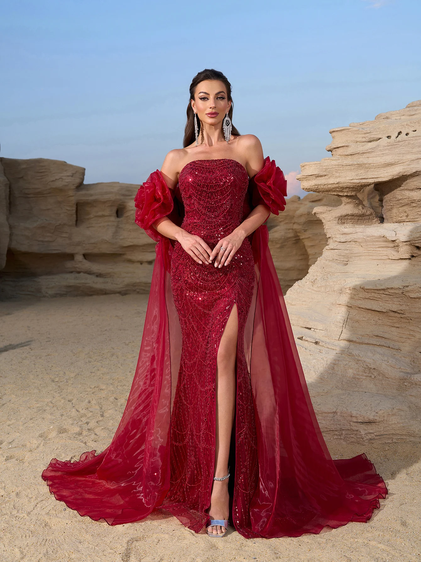 Women's Strapless Red Sequined Embroidered off the Shoulder High Slit Maxi Mermaid Formal Evening Dress With Detachable Shawl