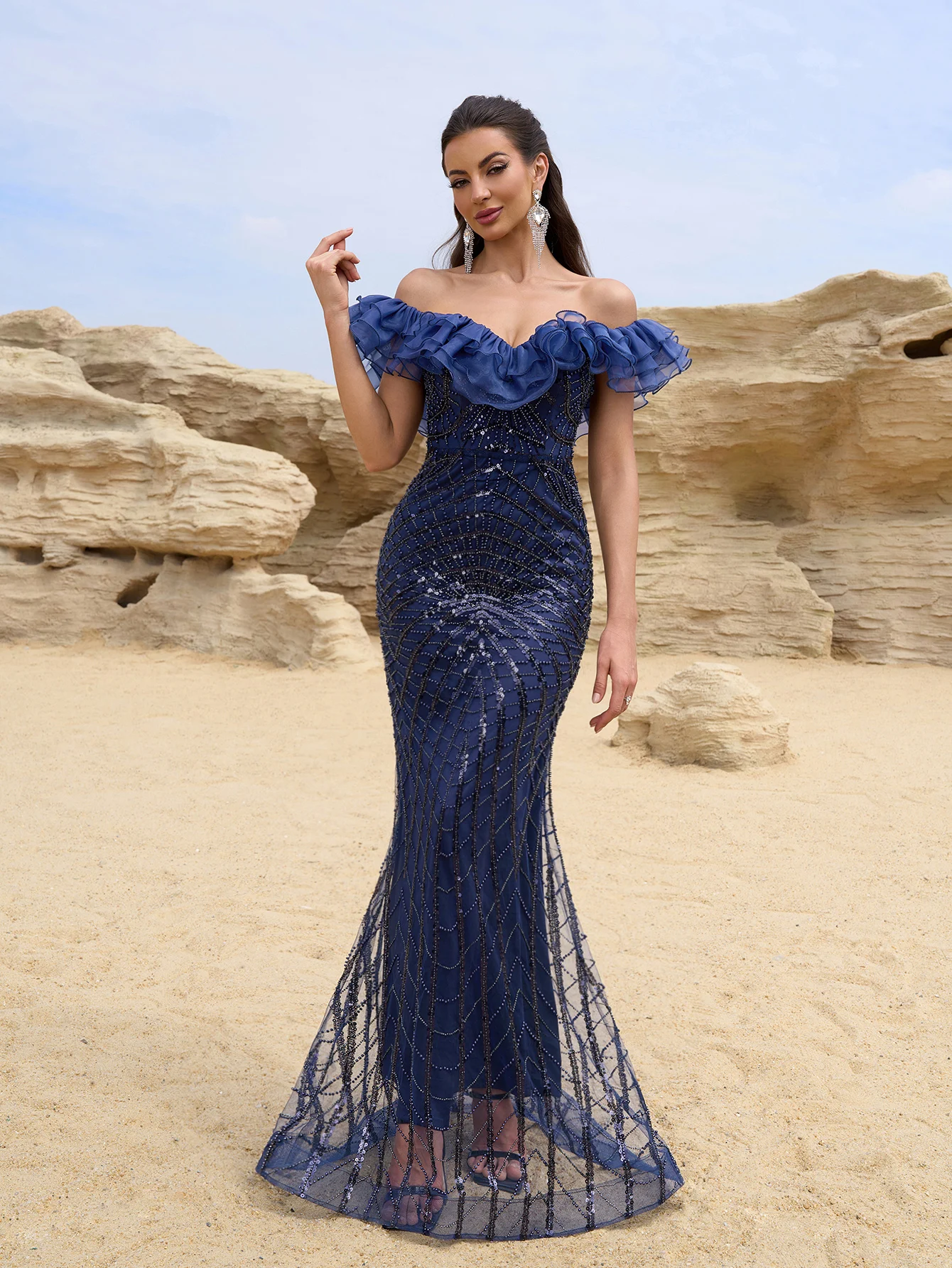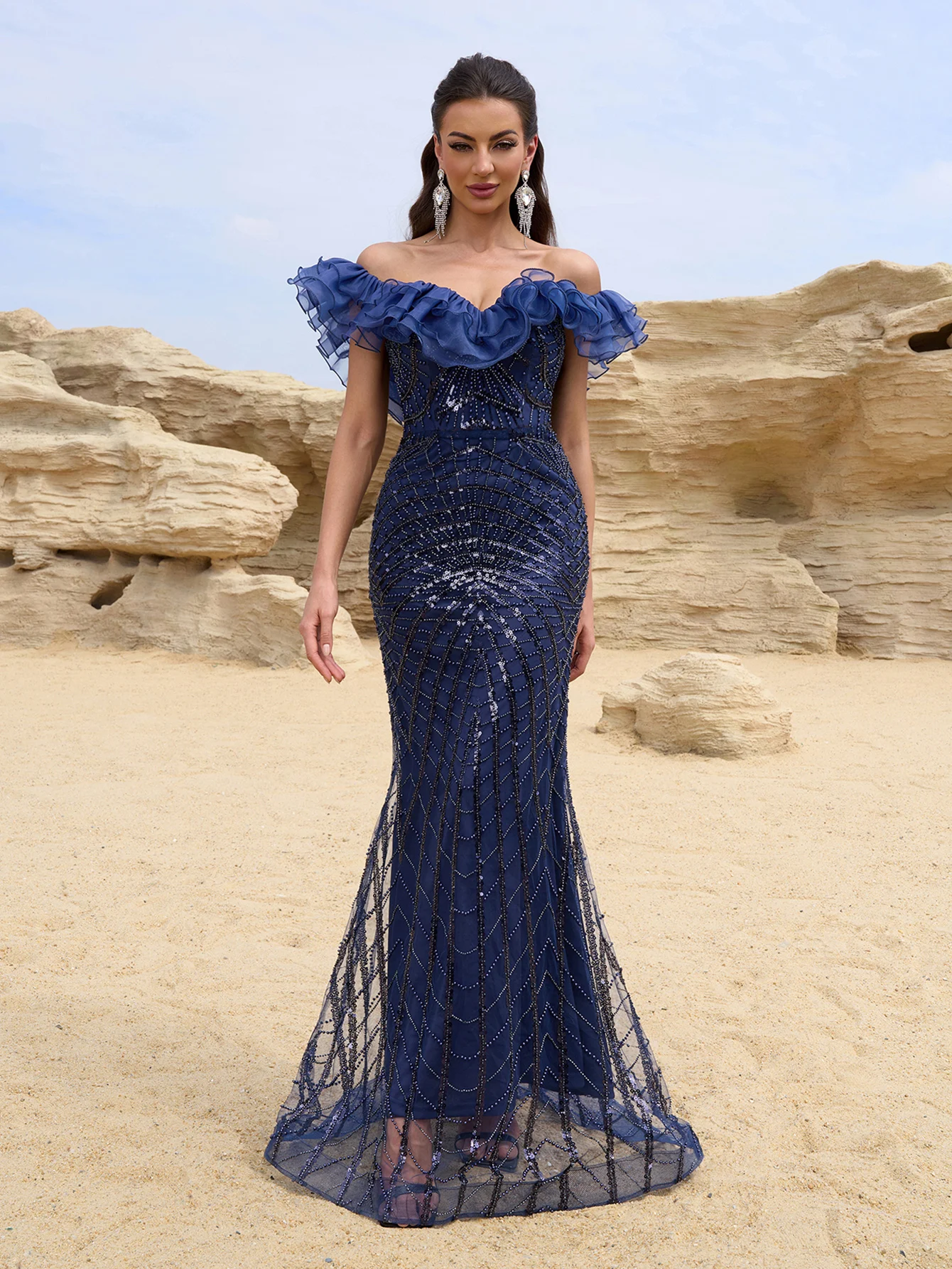 Women's Navy Blue off Shoulder Ruffled Collar Backless Beaded Sequins Embroidery Floor Length Mermaid Party Evening Dress Gown