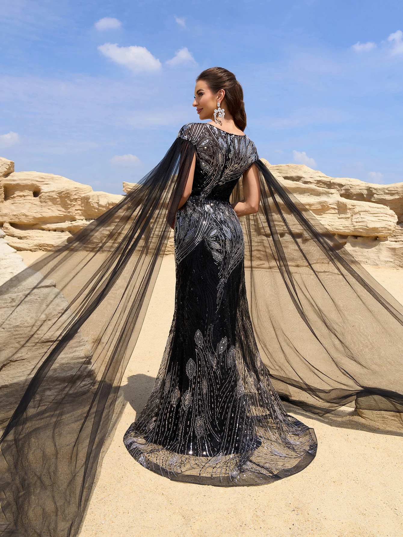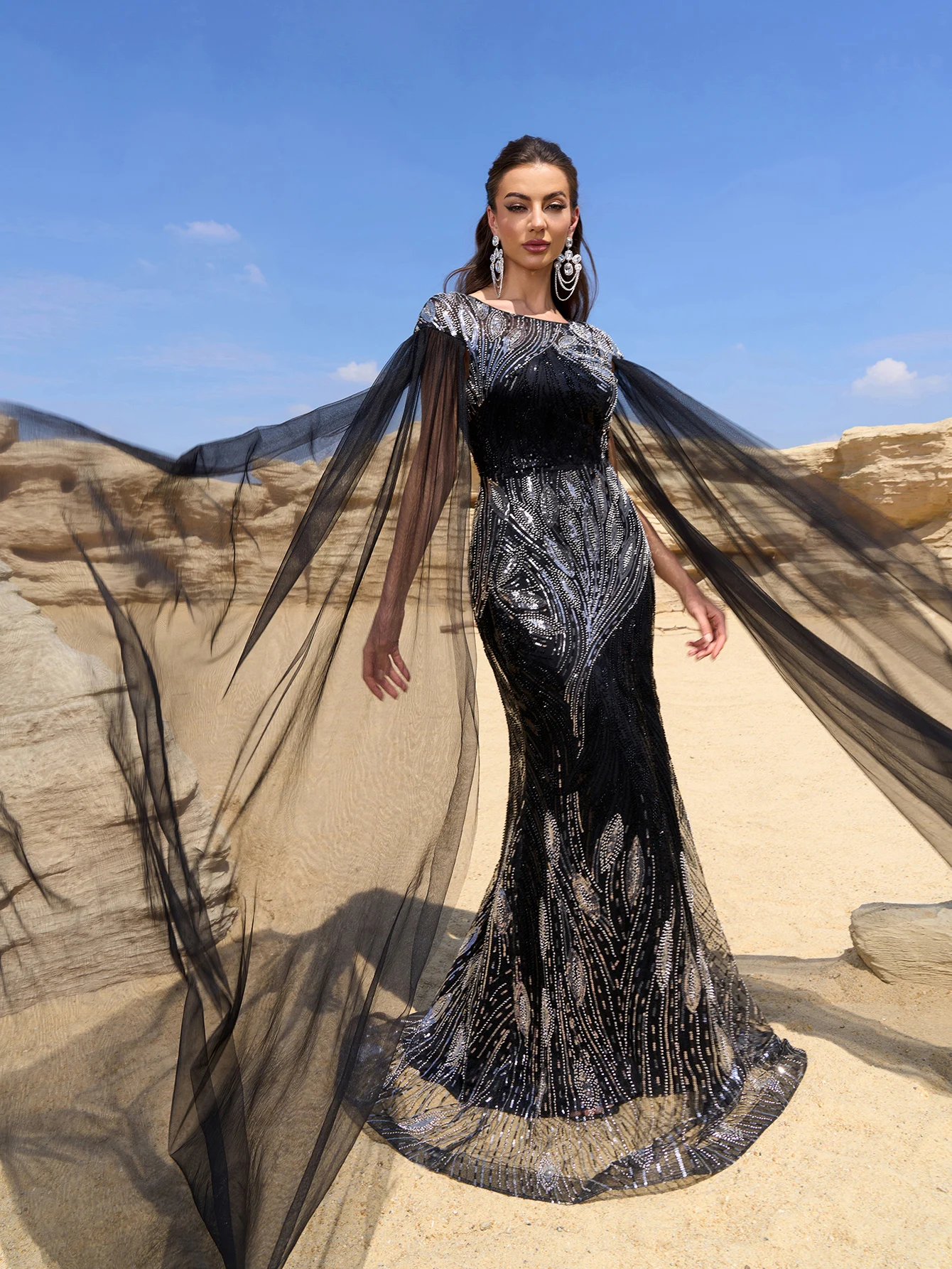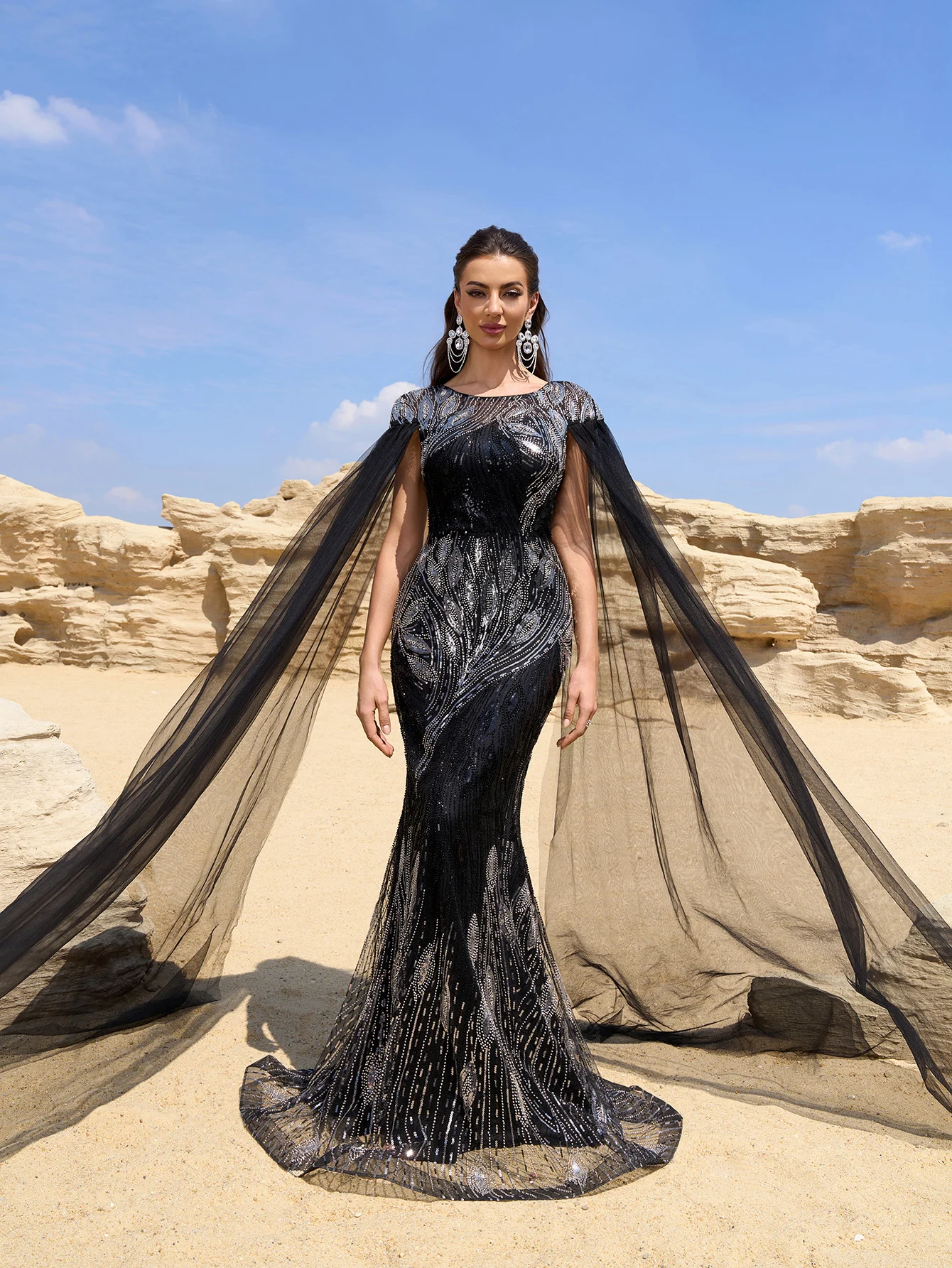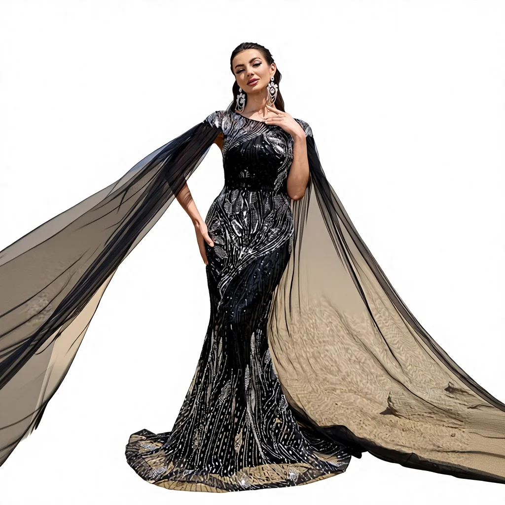 Elegant Women Round Neck Extra Long Sleeve Cinched Waist Beaded and Sequin Embroidery Floor-length Black Formal Evening Gown