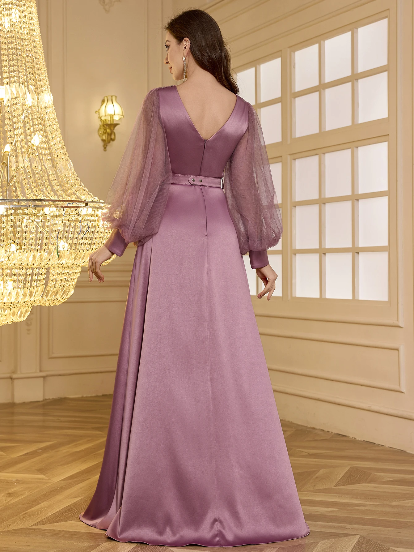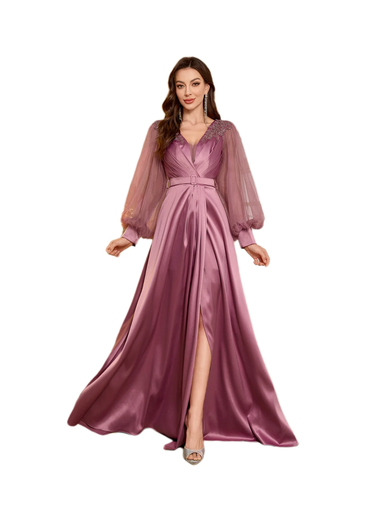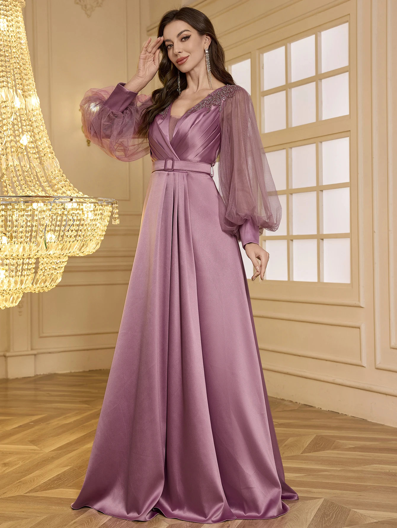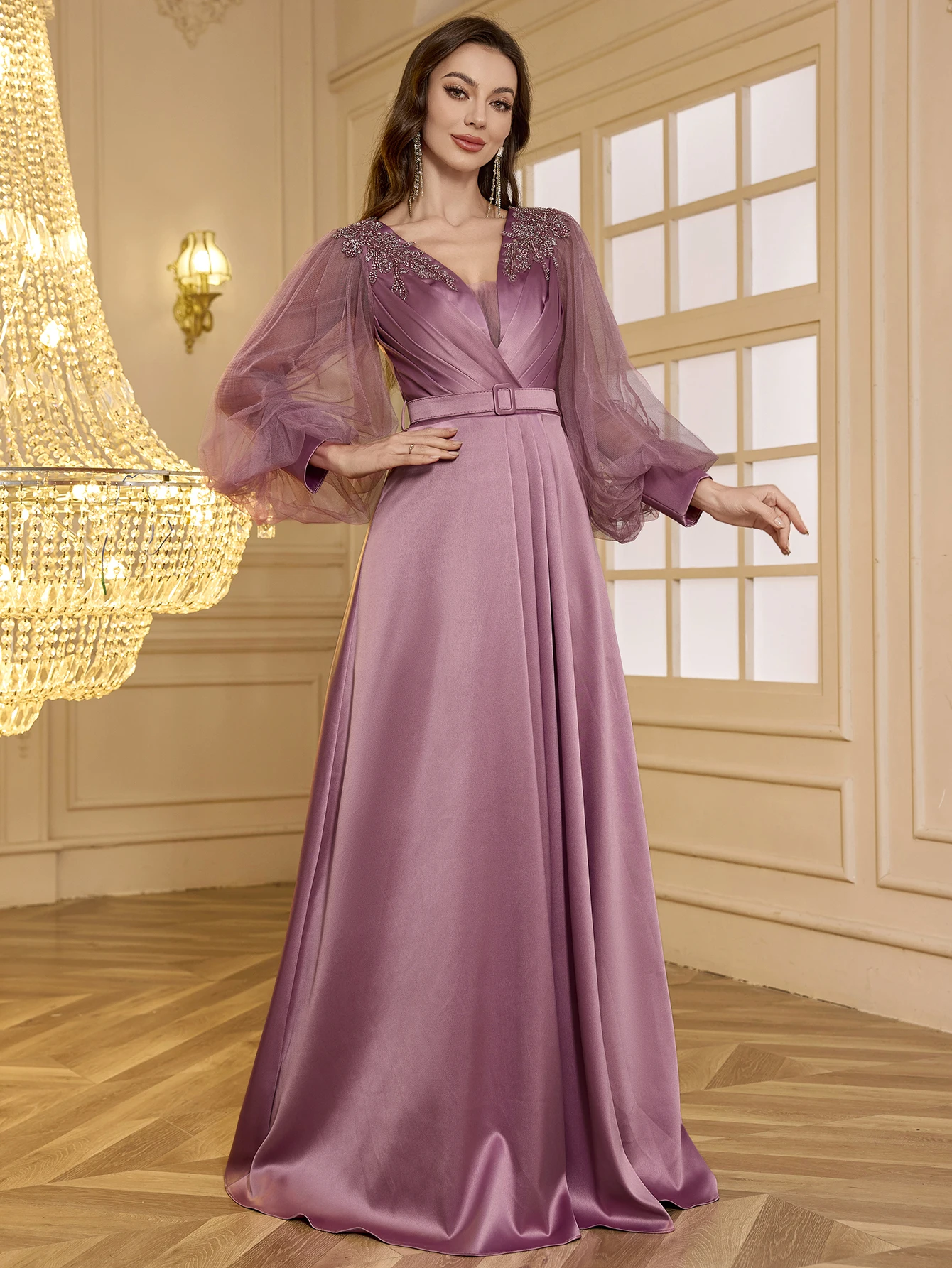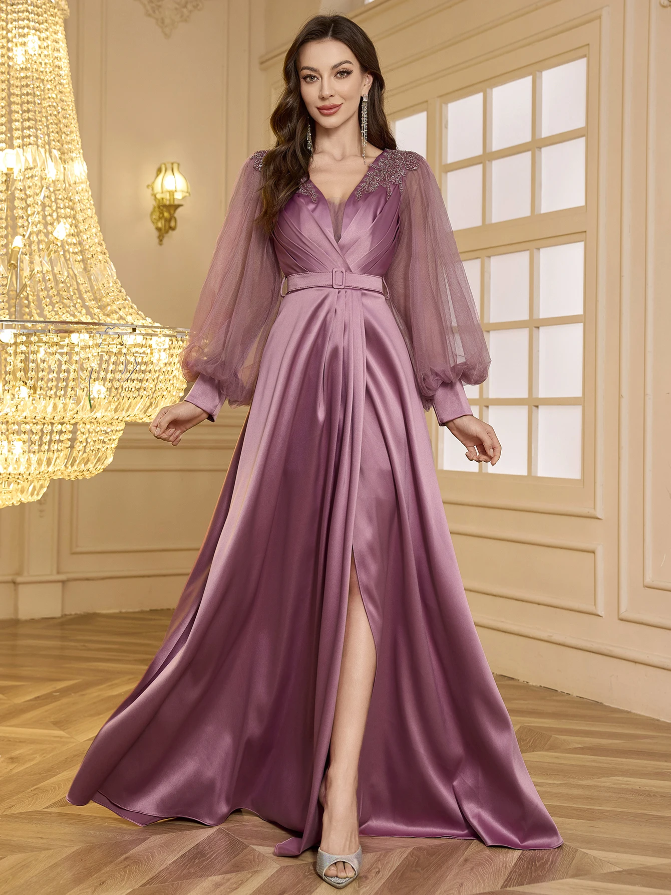 Elegant Solid V-Neck Lantern Sleeve Satin Patchwork Embroidered Pearl and Rhinestone Ruched Waist High Slit A-Line Evening Gown