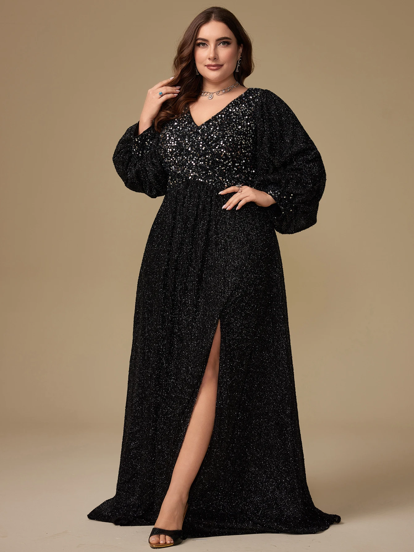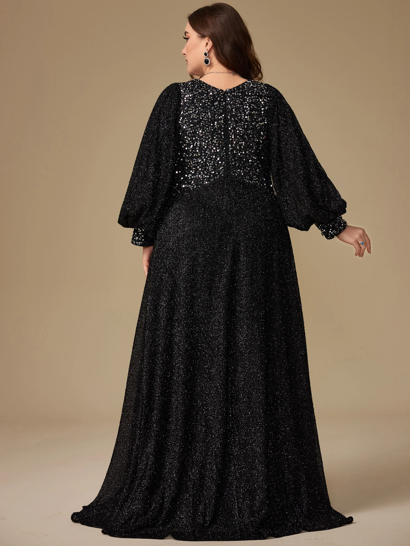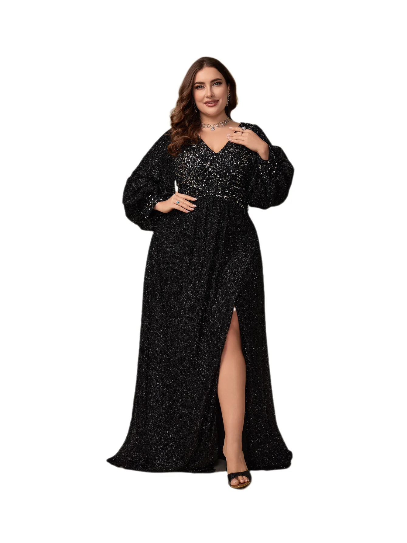 Plus Size Women Luxury Black Color v Neckline Glitter Lantern Long Sleeve Sequined Patchwork High Slit Maxi Party Evening Dress