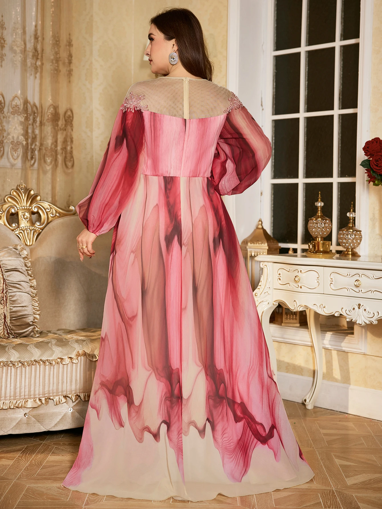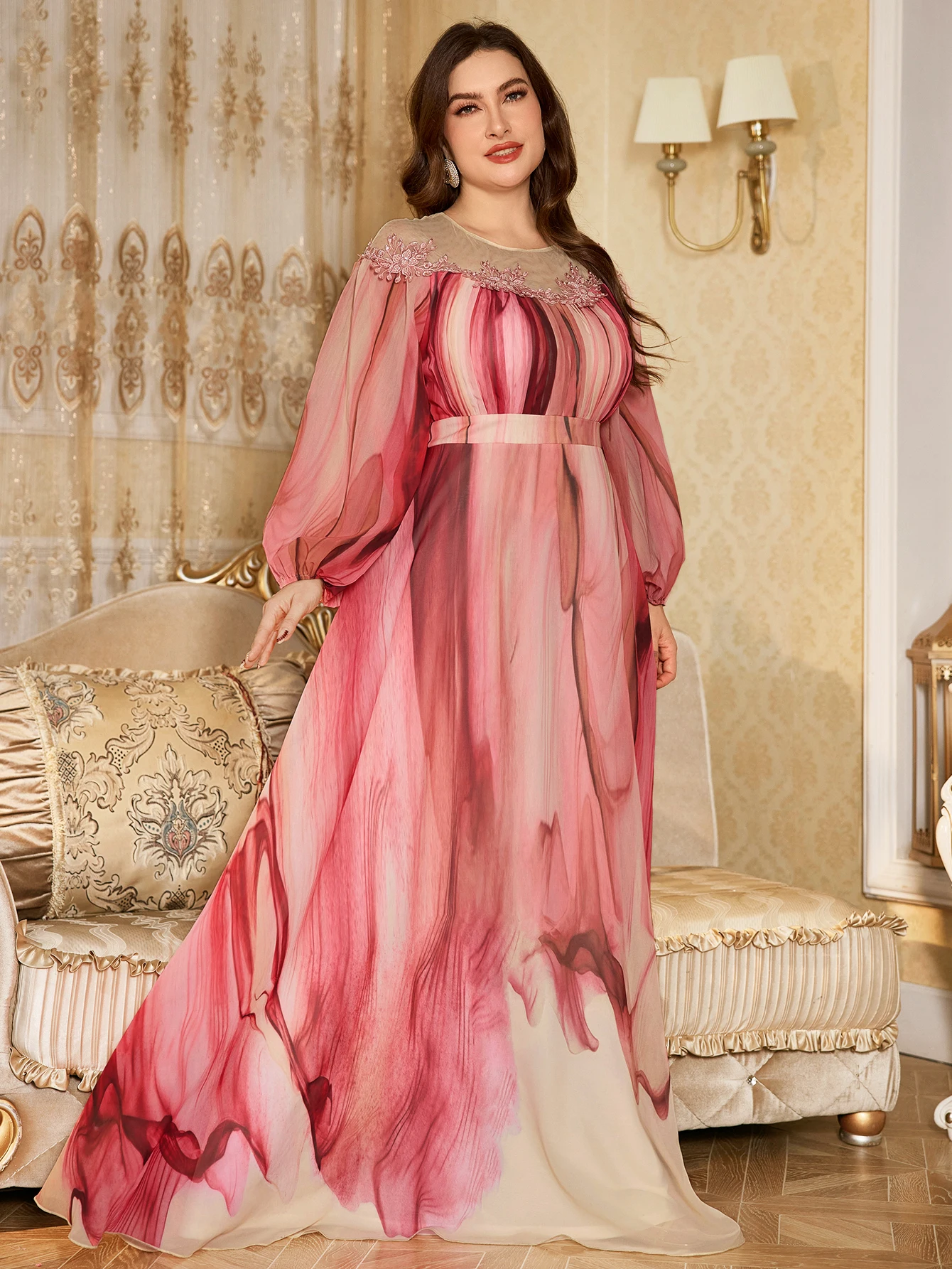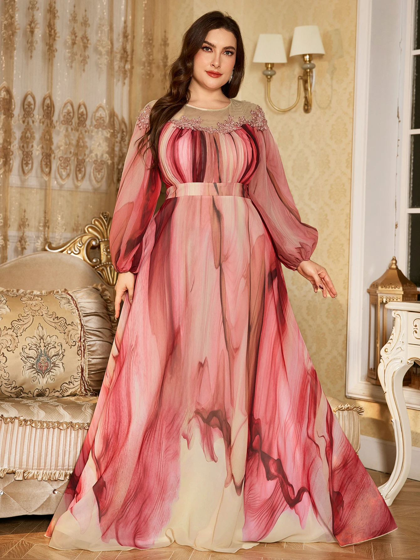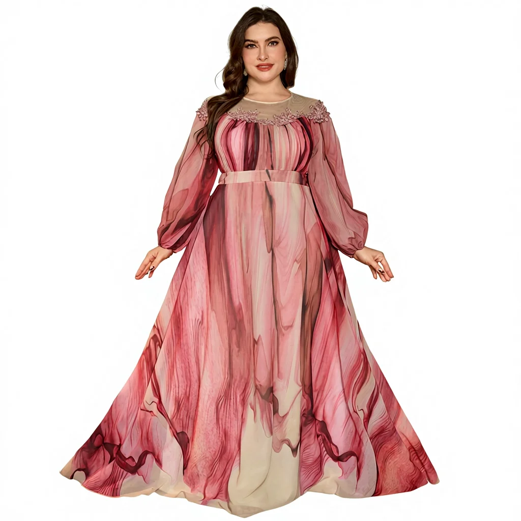 Plus Size Random Cut Women's Round Neck Lantern Sleeve Luxury Pearl Embroidered Decor Feminine Flared Hem Evening Gown Dress