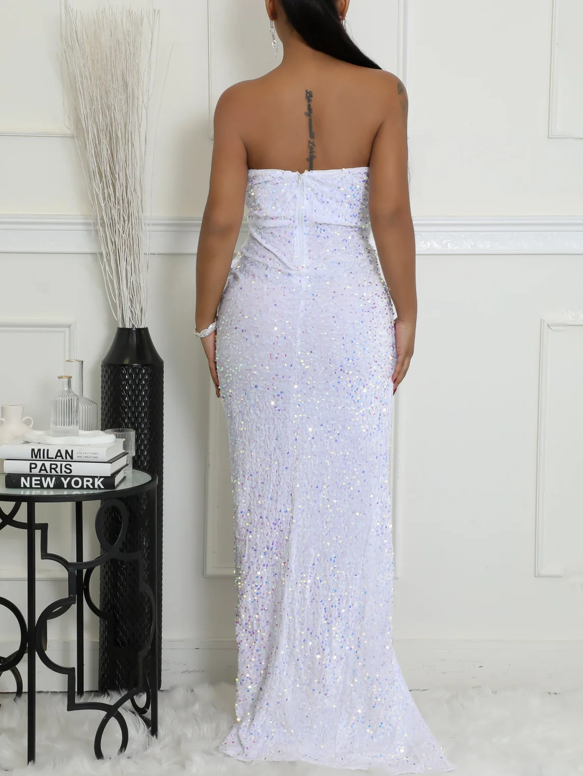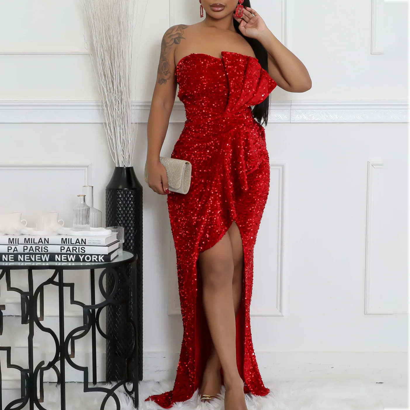 C8651 Foreign Trade New European American for Temperament Socialite Off-shoulder Sexy Slim Long Sleeve Sequined Floor-length