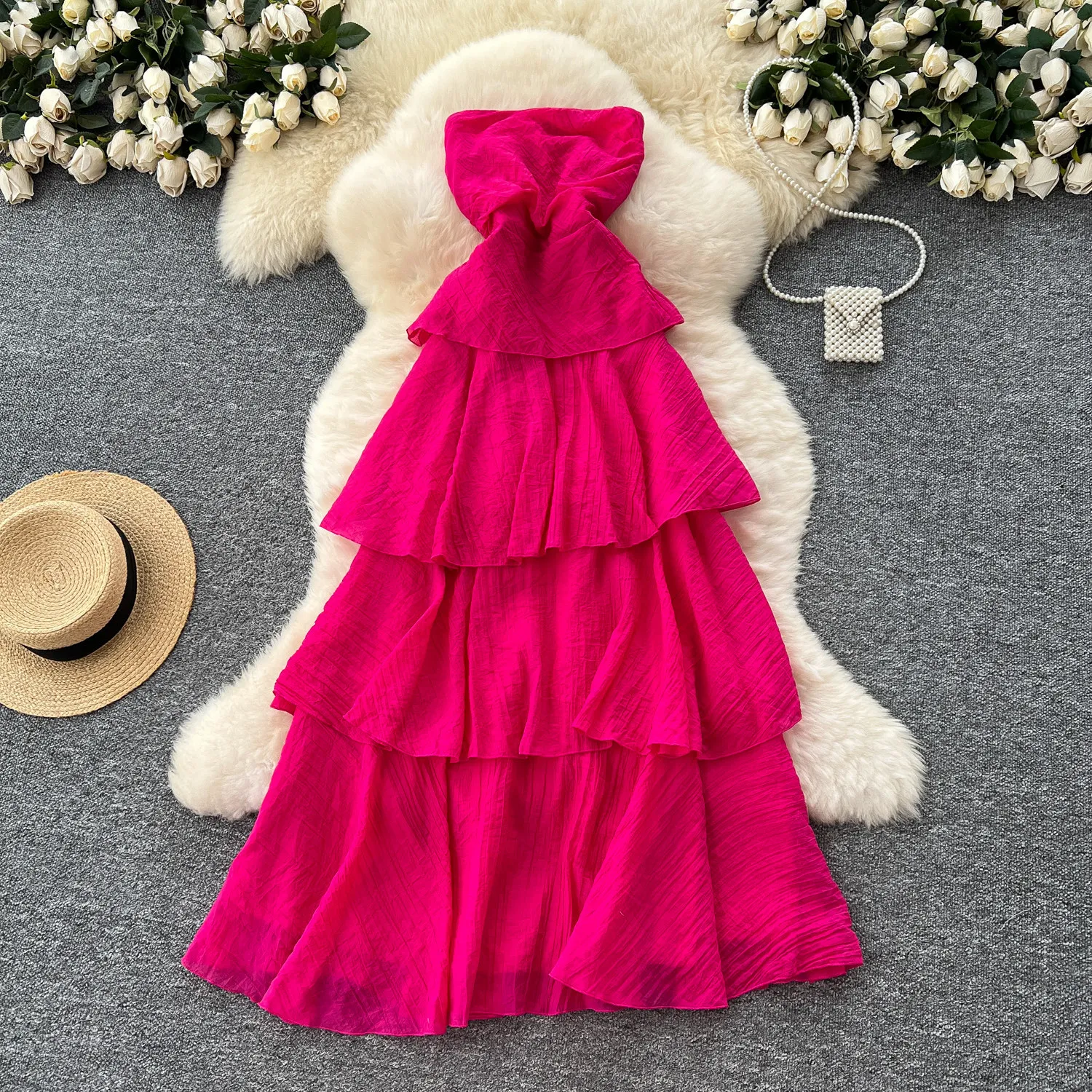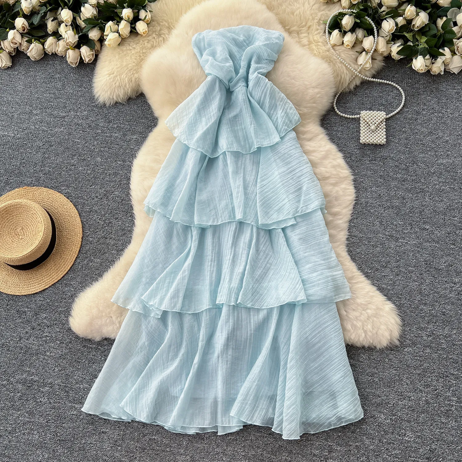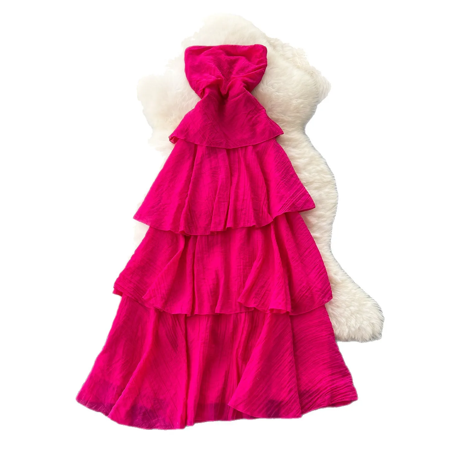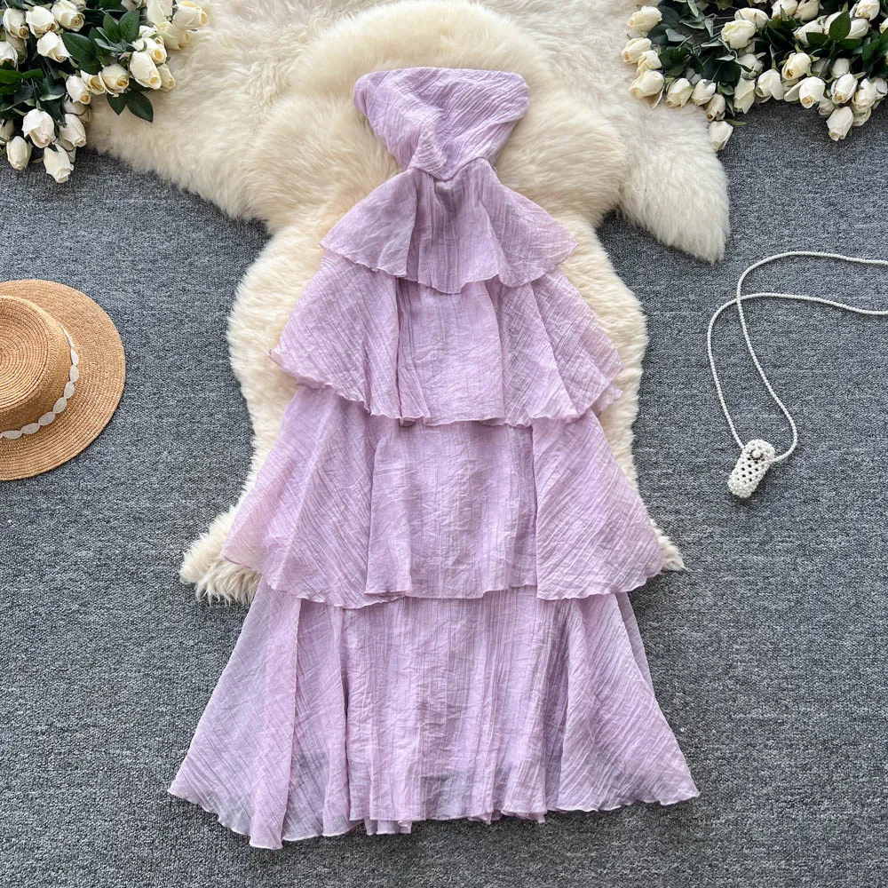 Sleeveless Strapless Women's Summer Elastic Waist Slimming Elegant Daily Medium Length Fairy Cake A-Line Skirt Socialite Dress