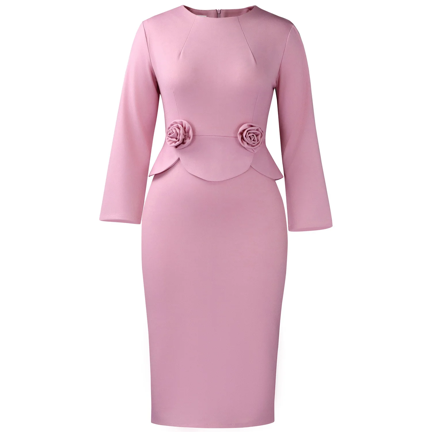 C8642 Foreign Trade Women's 2025 Autumn Winter New Fashion Neck Long Sleeve Solid Color Three-dimensional Flower Vintage Dress