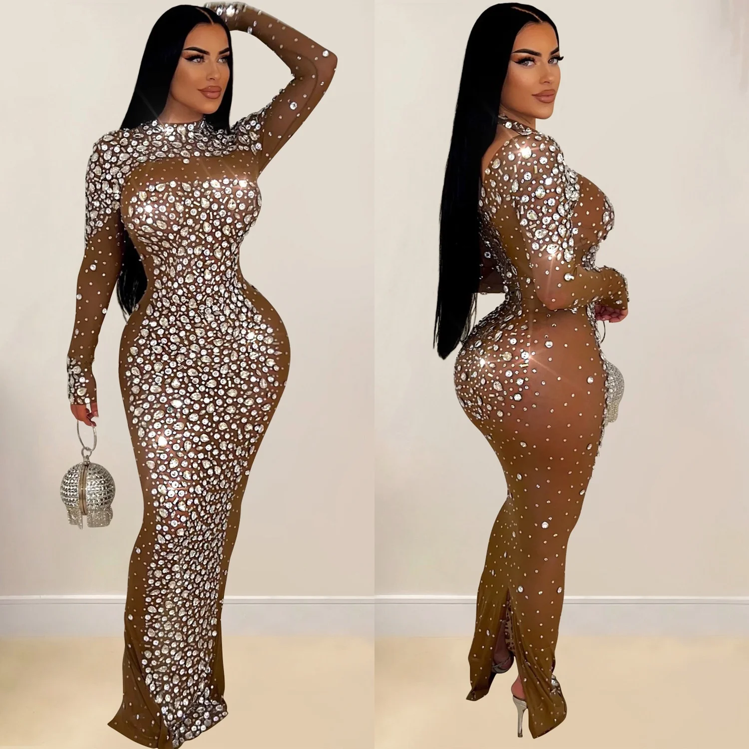 C6890 Women's Casual Long Sleeve European American Fashion Solid Color Mesh Knee-Length Hot Drilling for Cross-border AliExpress