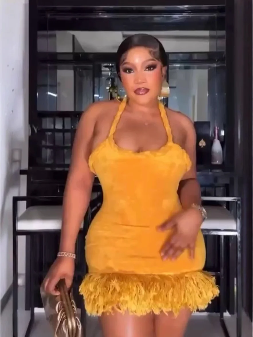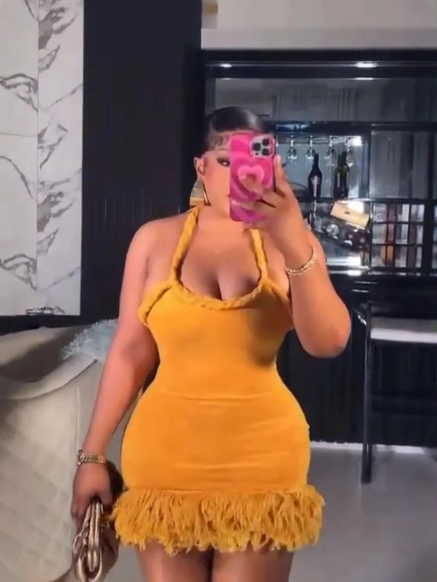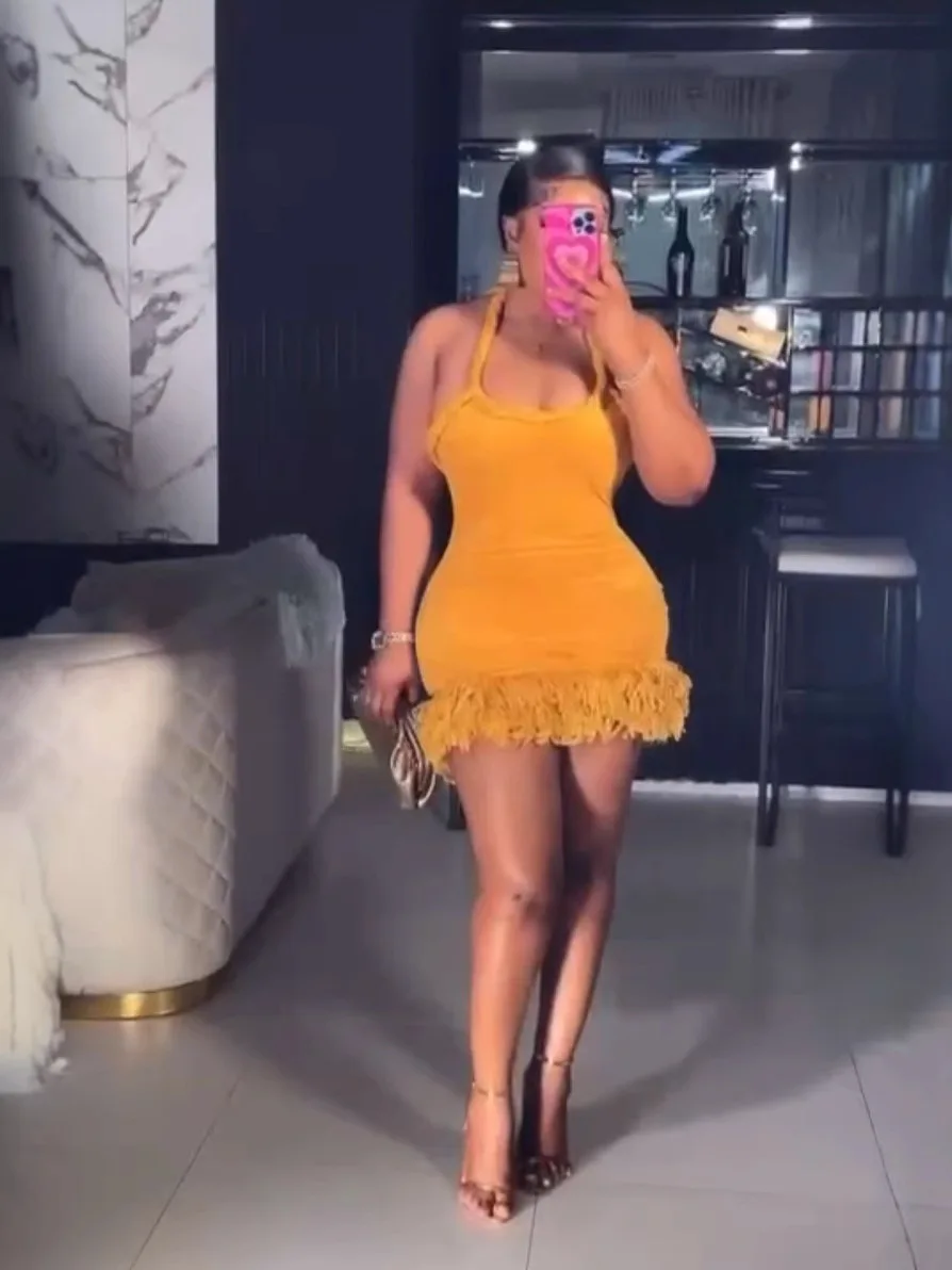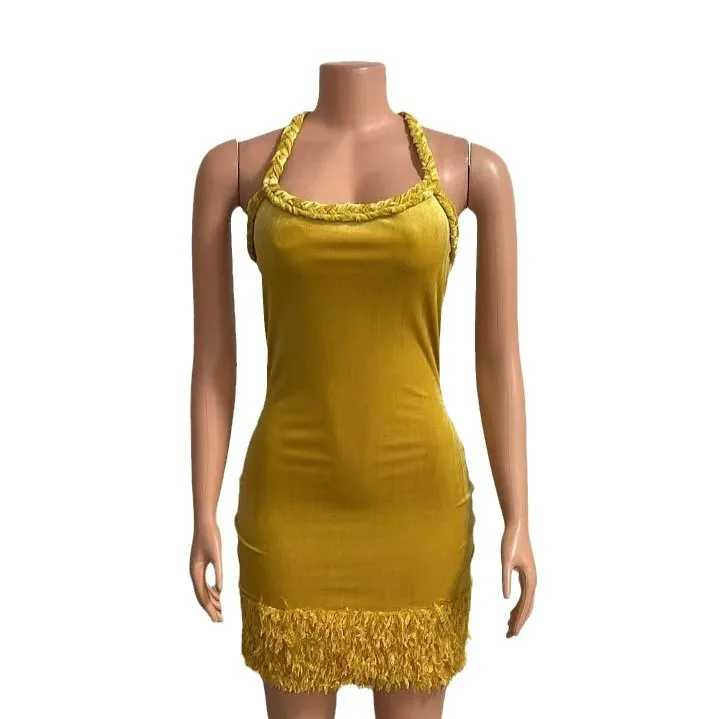 Cross-border Europe Summer Woven Twist Rope Halter Shoulder Strap Tassel Skirt Swing Short Solid Color Backless Velvet