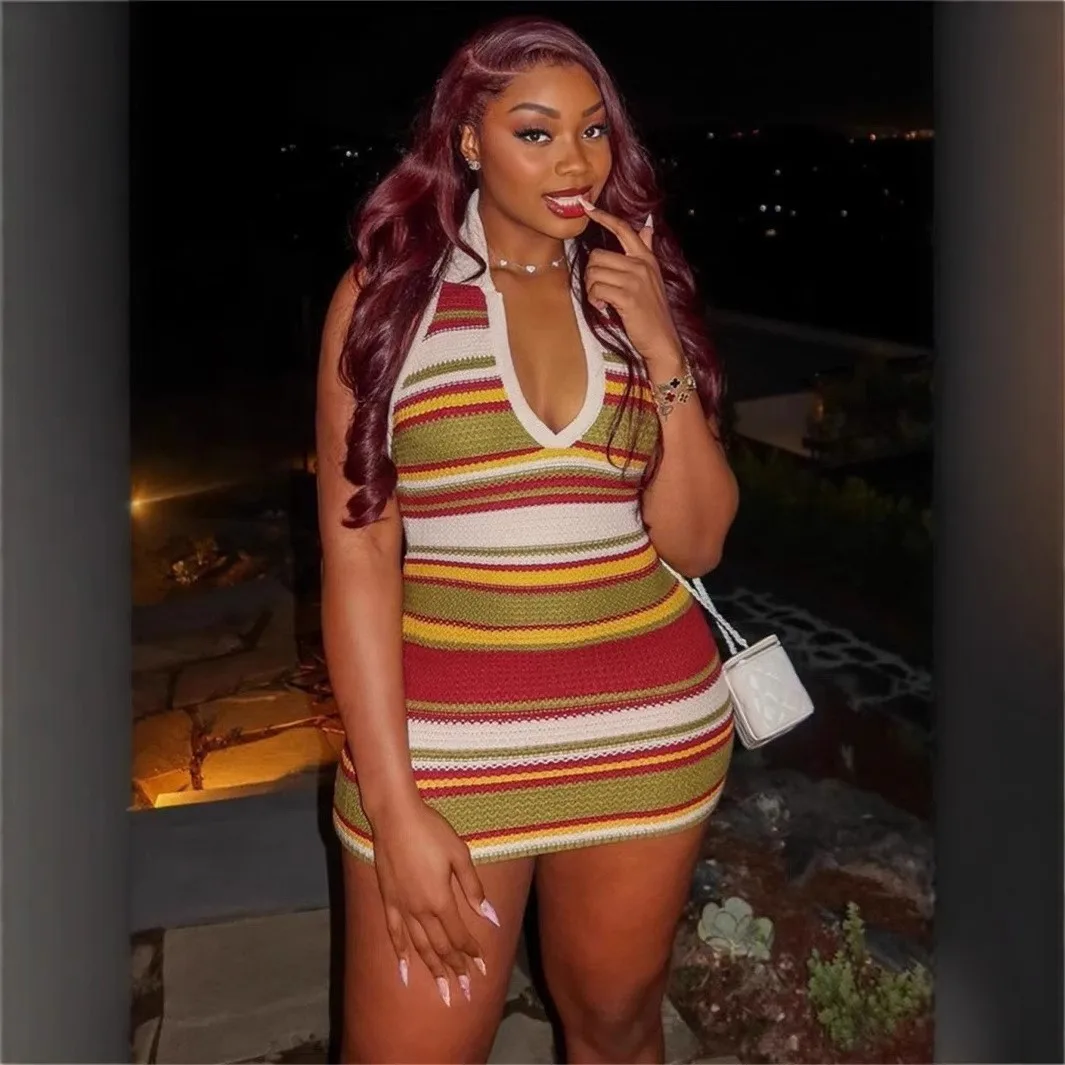 2025 Spring Summer Colorful Striped Knitted Luxury Nylon/Cotton Dress Turn-Down Collar Halter V-Neck Slim Fit Bodycon European