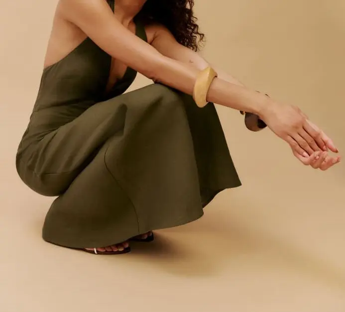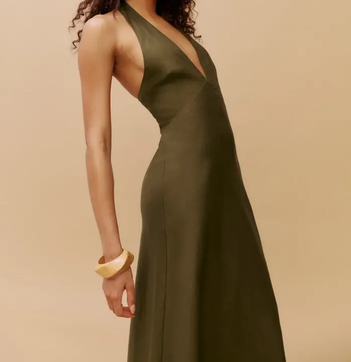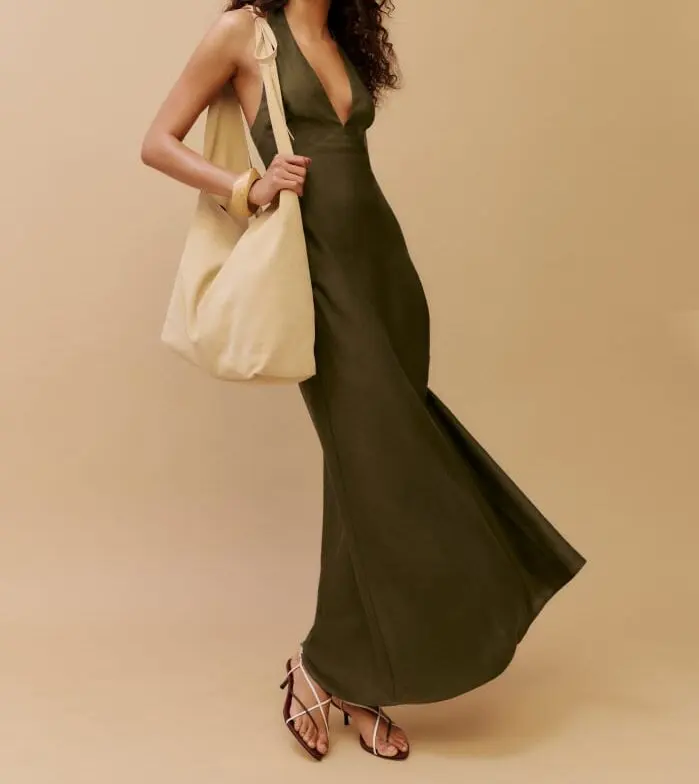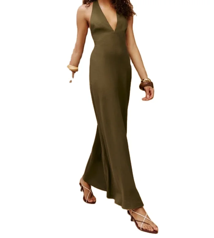 Custom Women's Summer Dress Elegant Casual Green Linen Maxi Sleeveless with Natural Waistline Woven and Digital Printed
