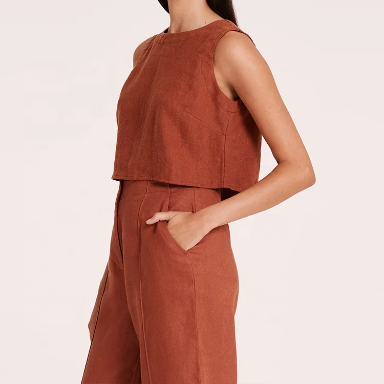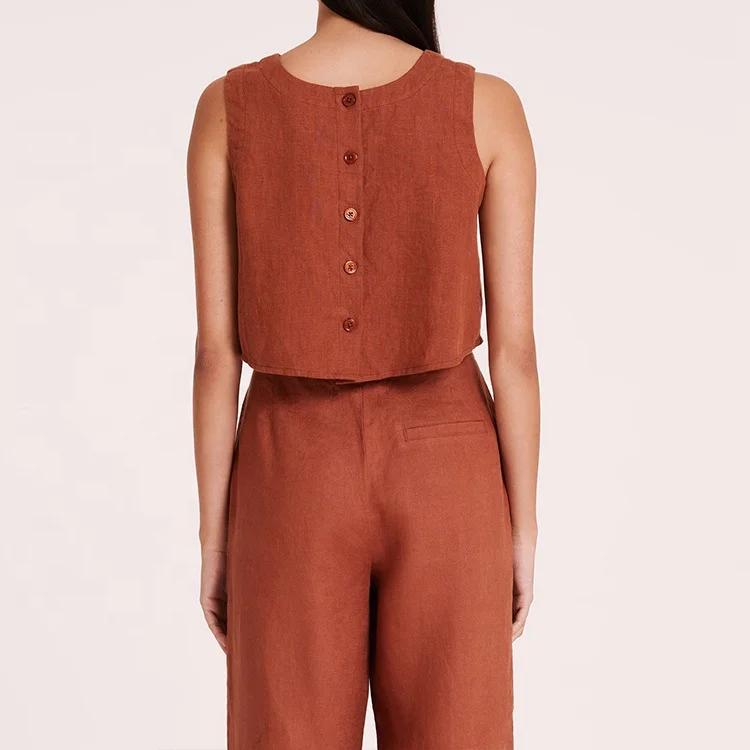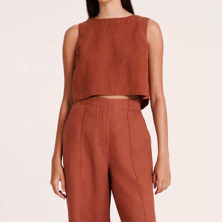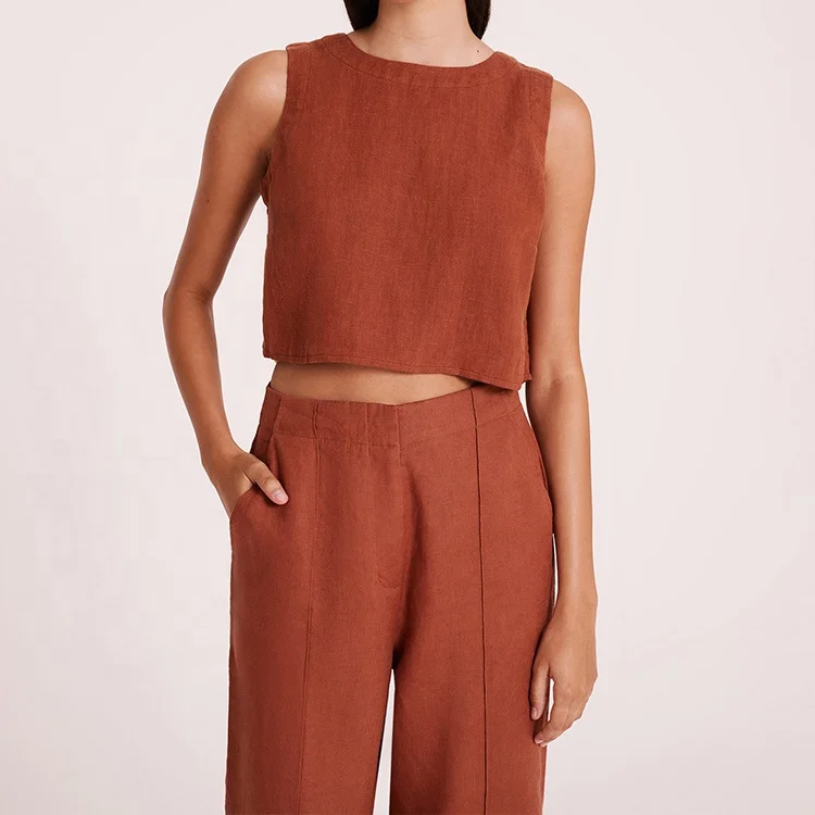 Elegant Women Wholesale Summer Flax Clothes Blouses Cotton Linen Sleeveless Solid Color Casual Crop Top and Pants Set