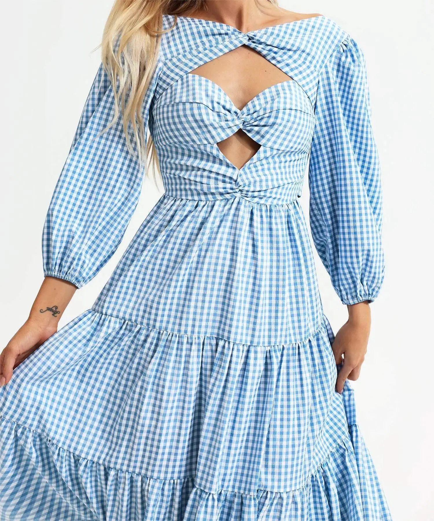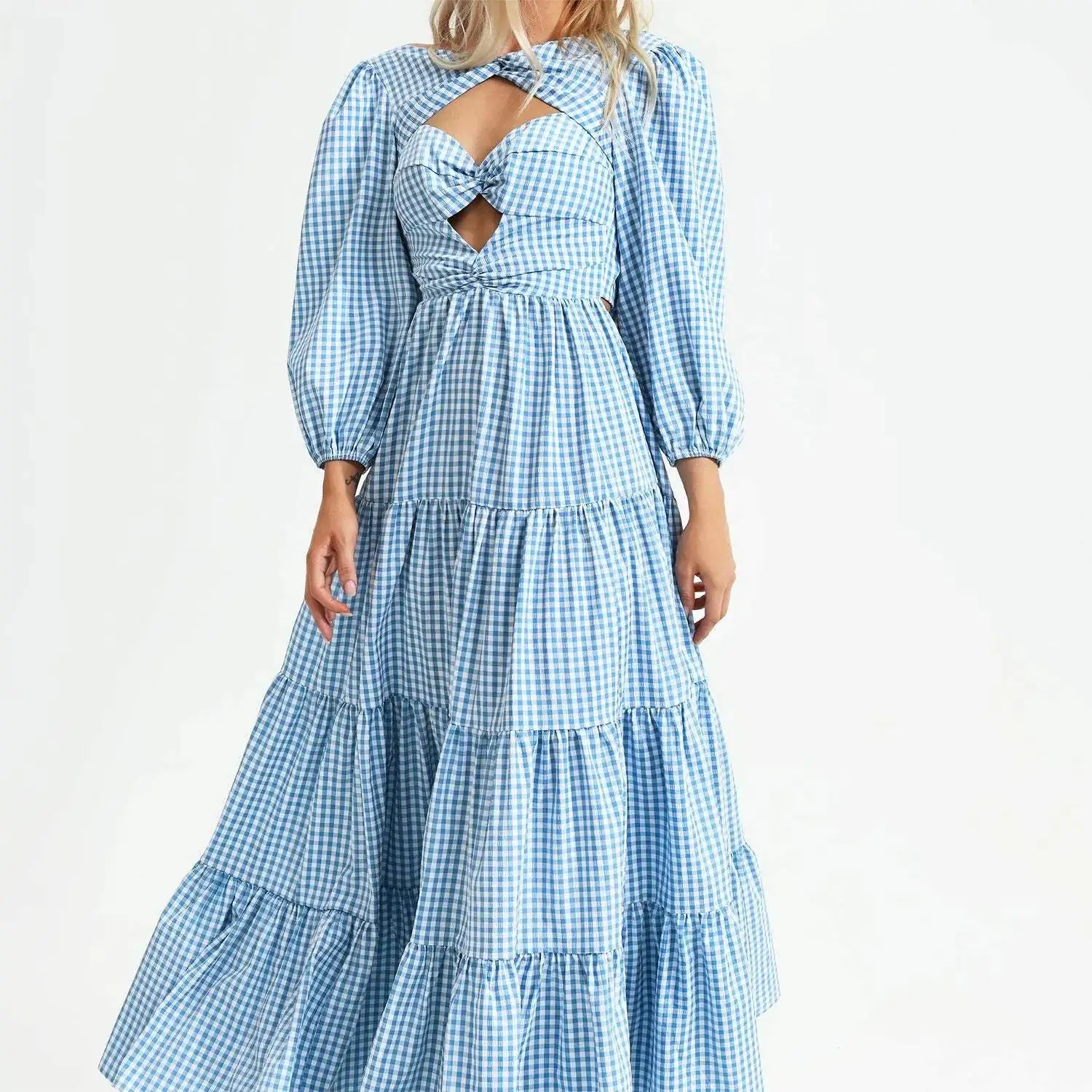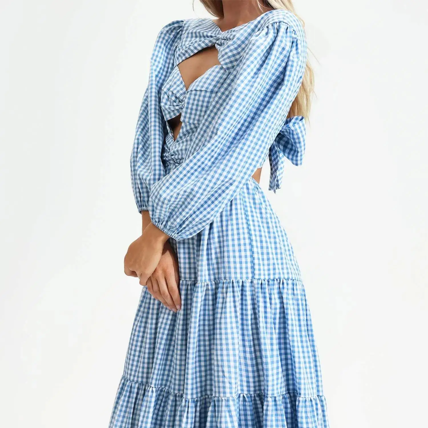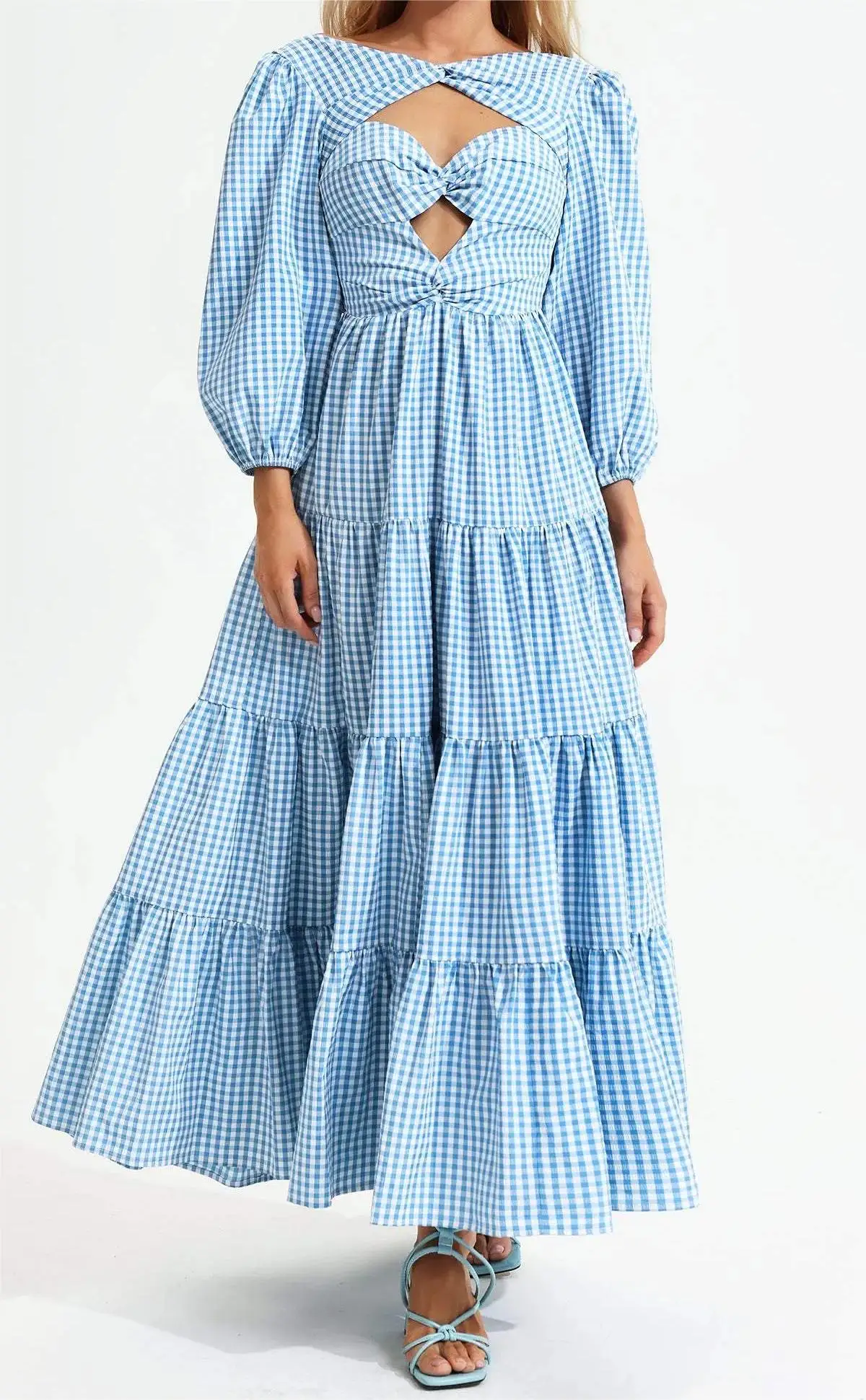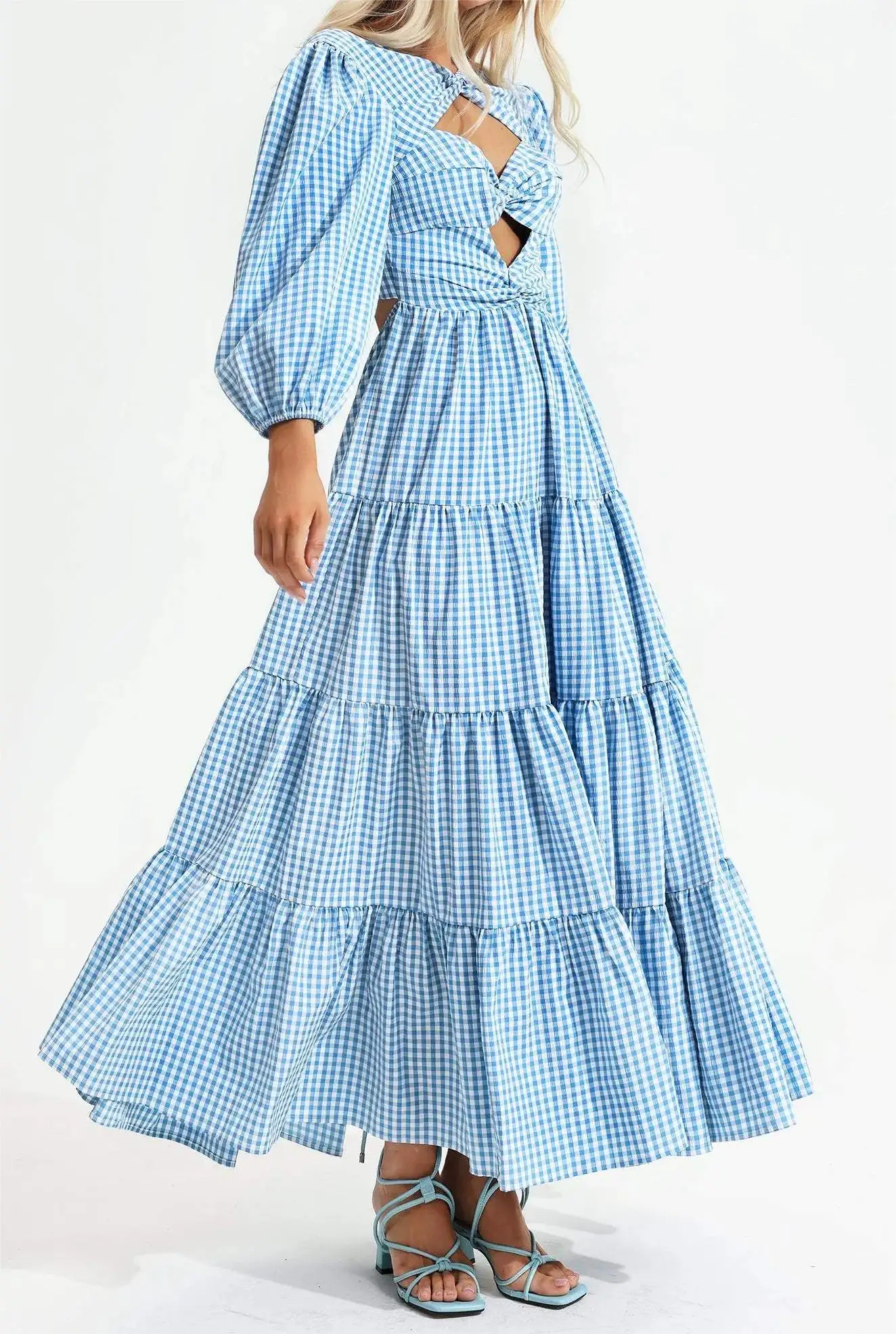 Plaid Smocked Ruffle Dress Puff Sleeve Cut-Out Tiered Ruffle Hem Backless Maxi Dress