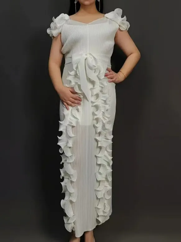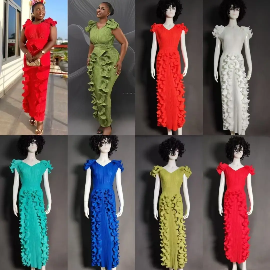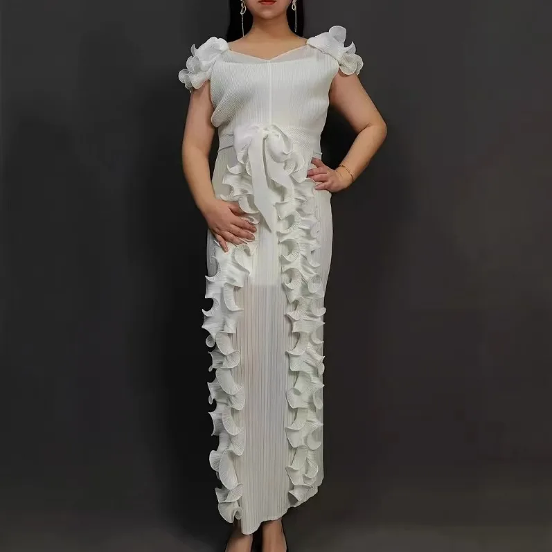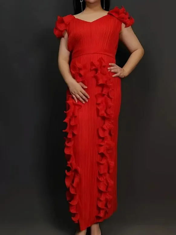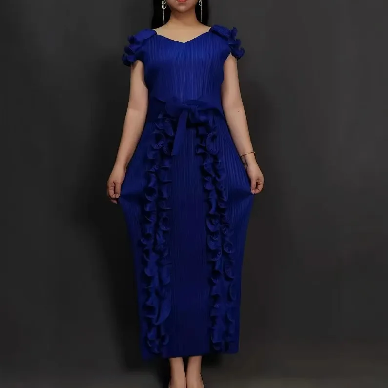 Latest Miyaki Elegant Casual Trendy Luxury Elegant V-Neck Short Pleated Plus Size Solid Color Women Party Long Dress