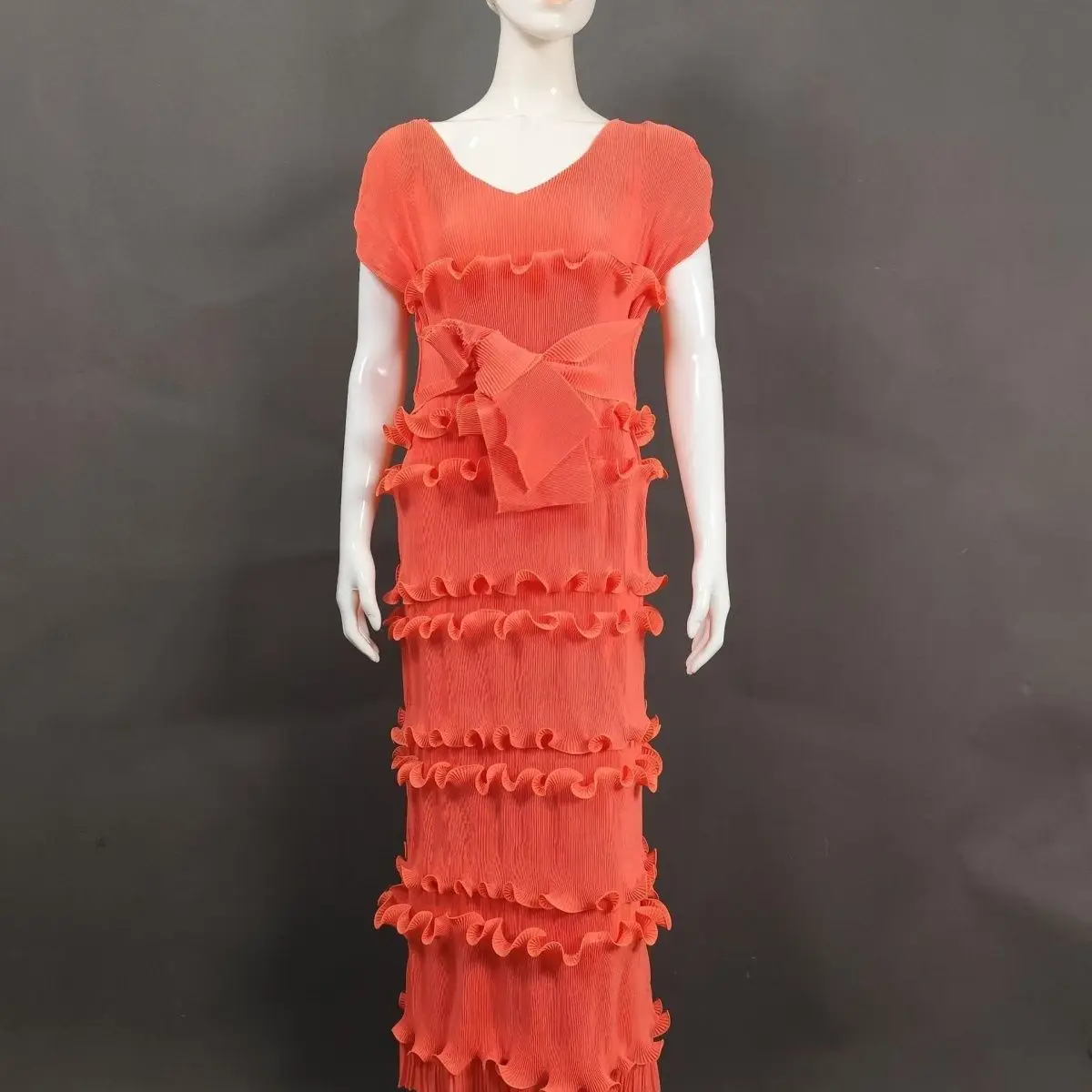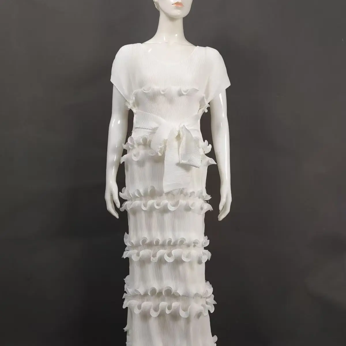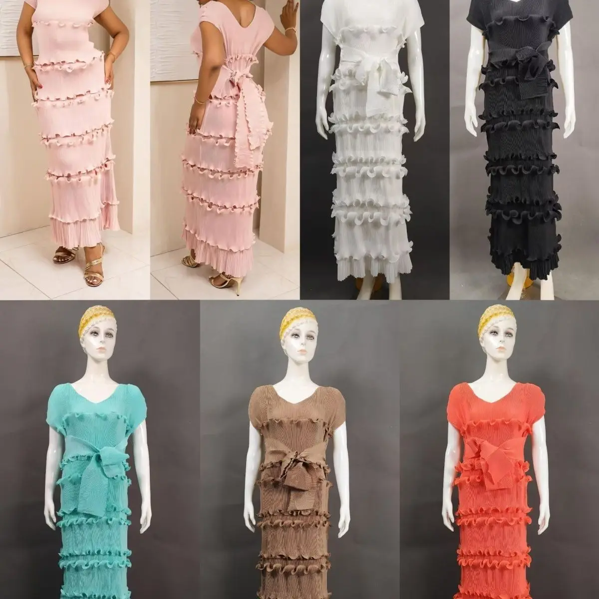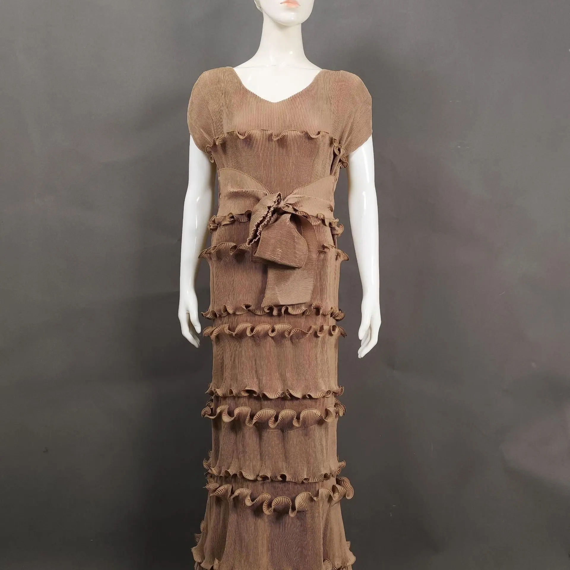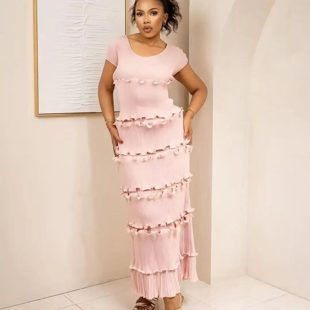 Latest Miyaki Elegant Casual Trendy Luxury Elegant V-Neck Short Cap Sleeves Pleated Plus Size Solid Color Women Party Long Dress