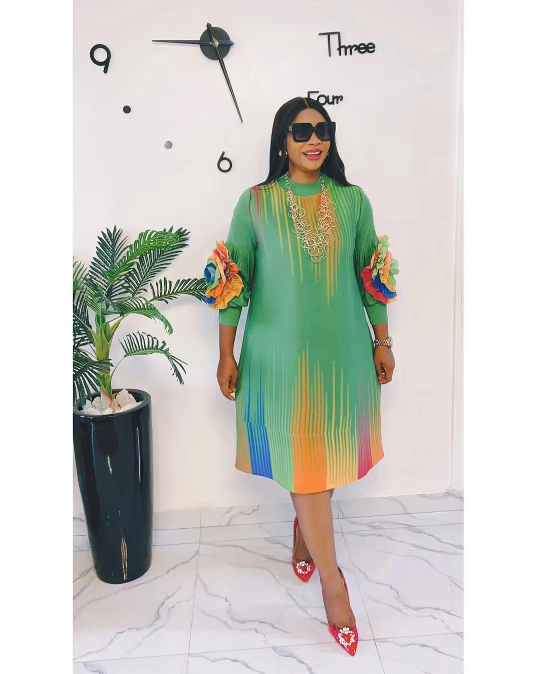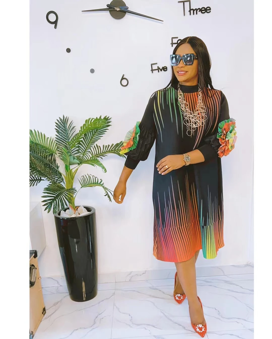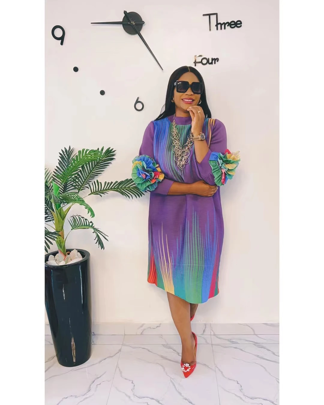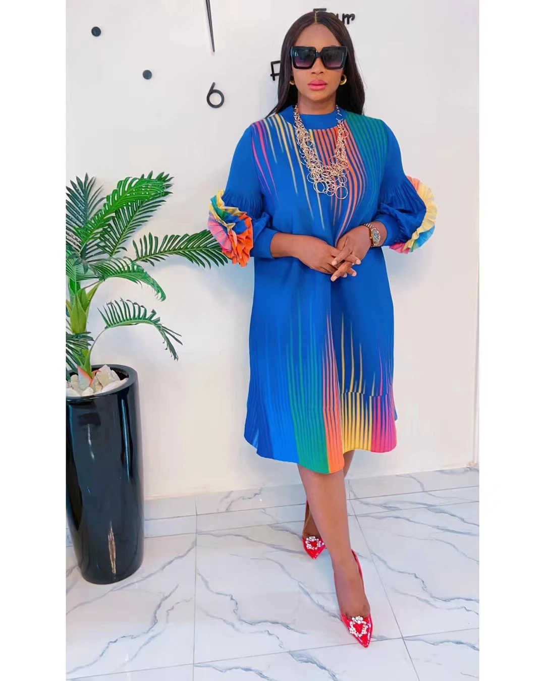 Fall of Polyester Patchwork Color Stripe Graphic O-Neck Plus Size Miyake Pleated Knee Length Ladies Women Dress