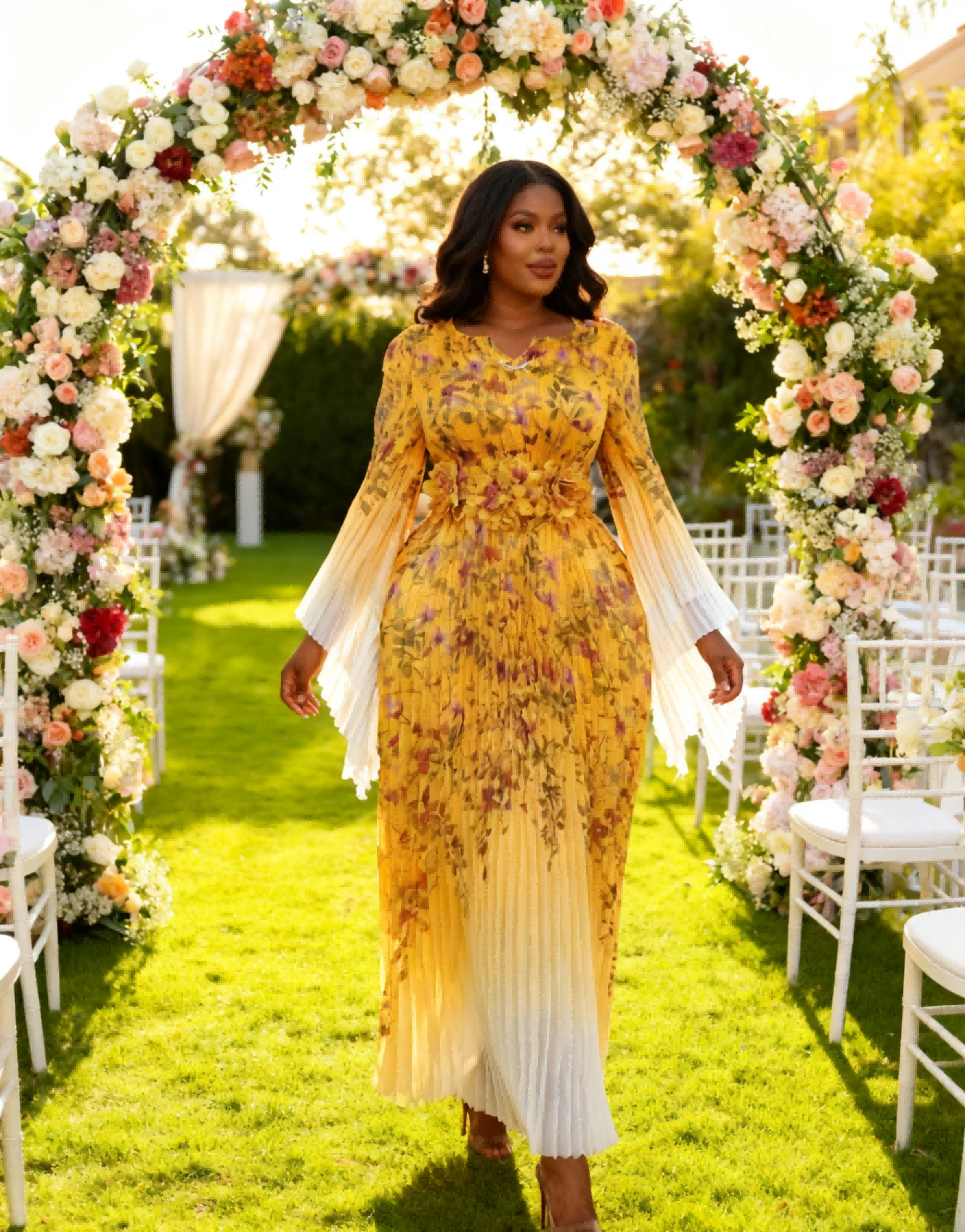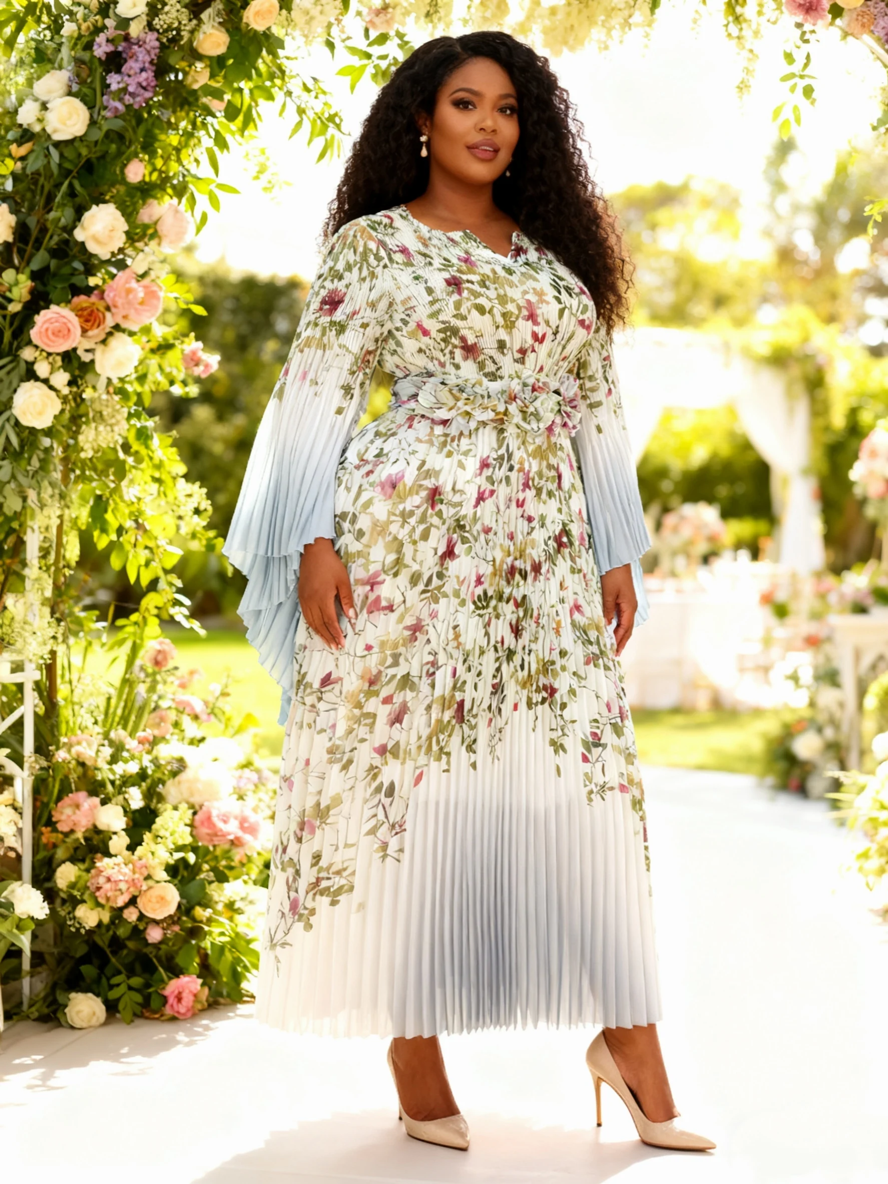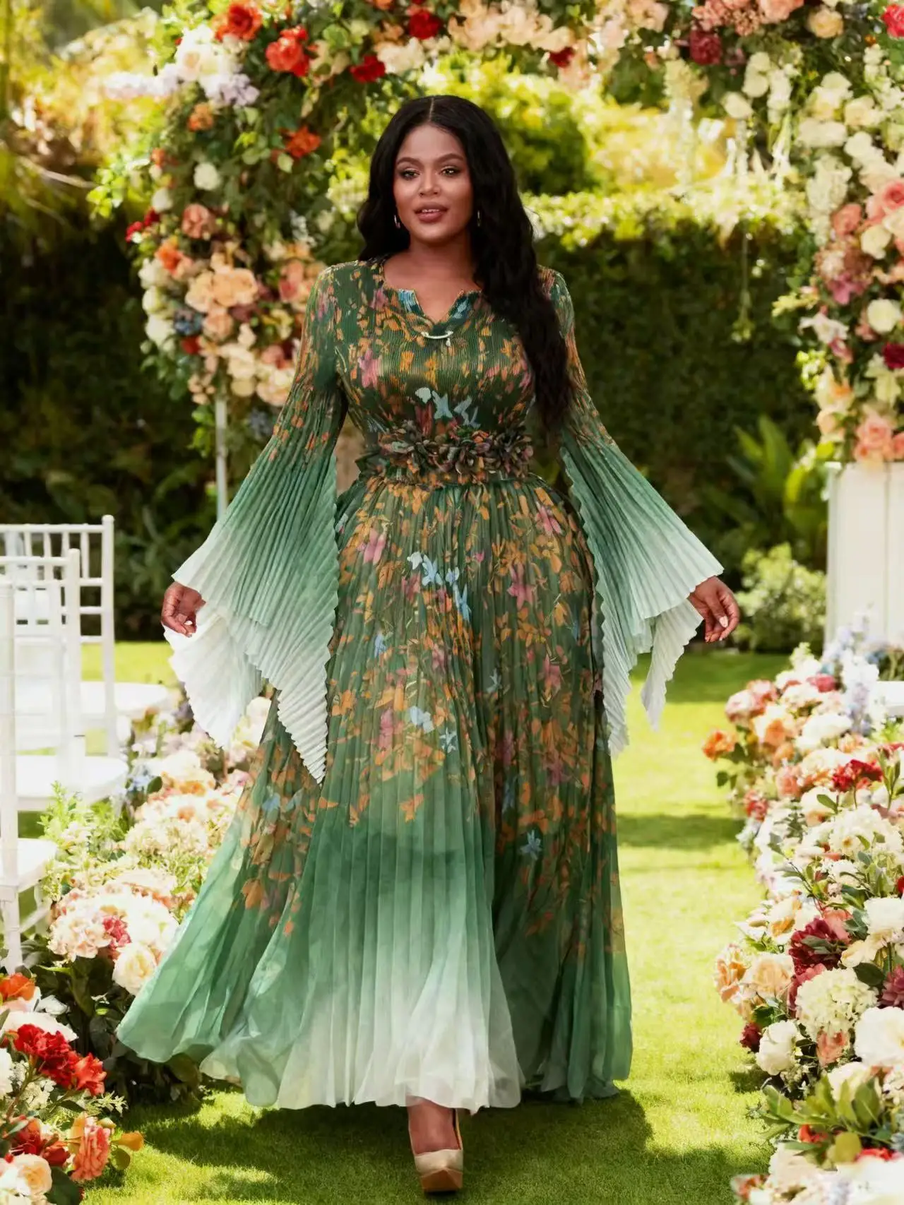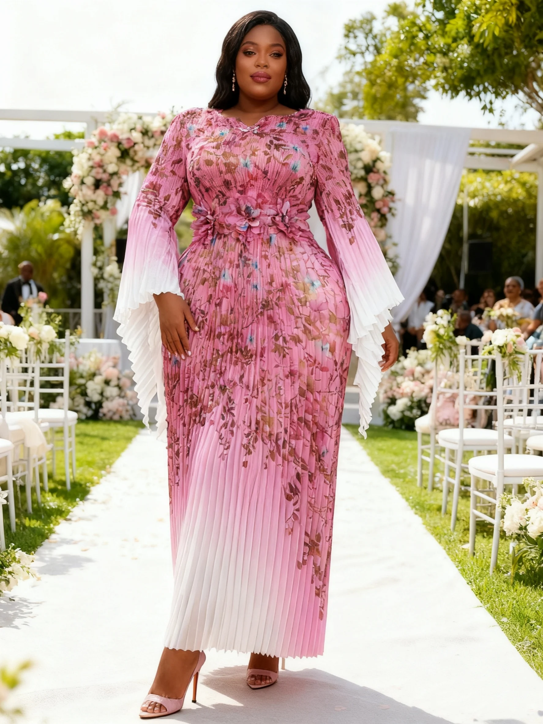 High-end Luxury Women's Gradient Color Long batwing Sleeve Translucent Dress Ladies Miyaki Pleated Floral Waistband Maxi Dress