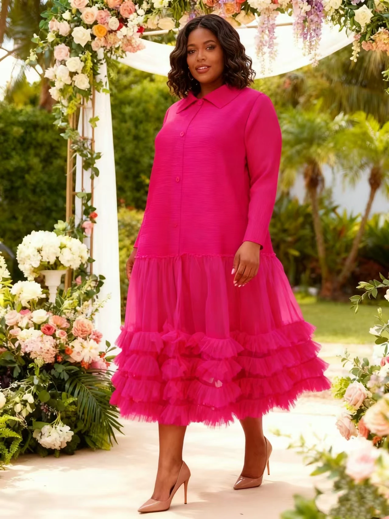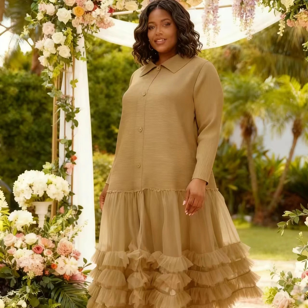 Wholesale Women's Solid Color Polo Collar Button Decoration Dress Plus Size Ruffled Lace Hem Miyaki Pleated Dress