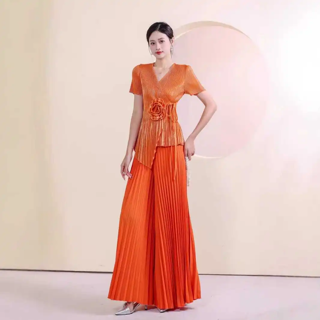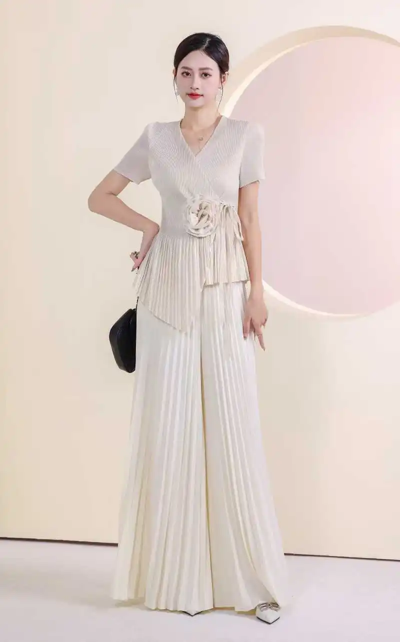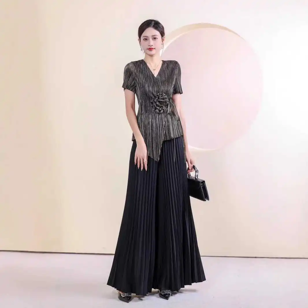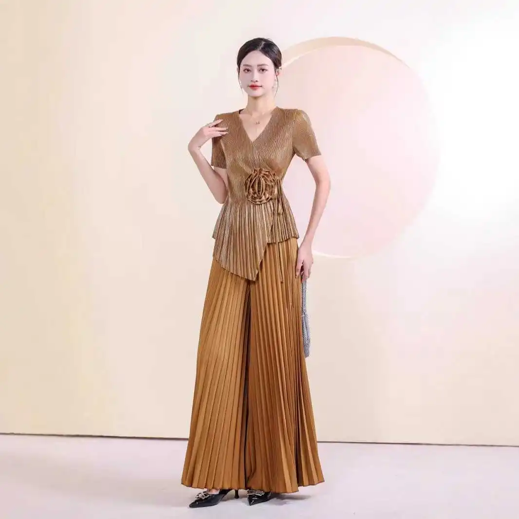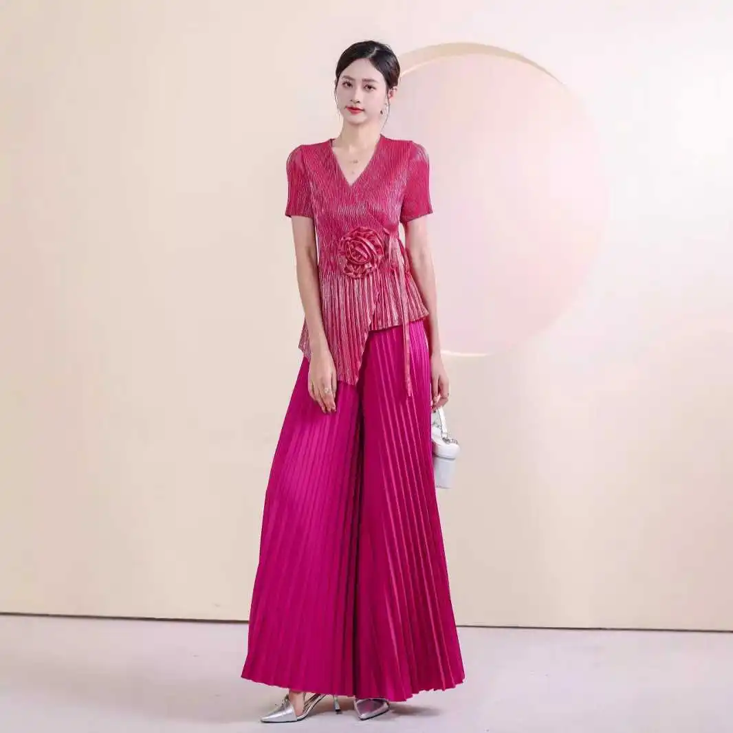 New Collection Summer Casual Elegant Trendy Issey Miyaki Pleat Short Sleeves Solid Color Plus Size Two Pieces Pant Set