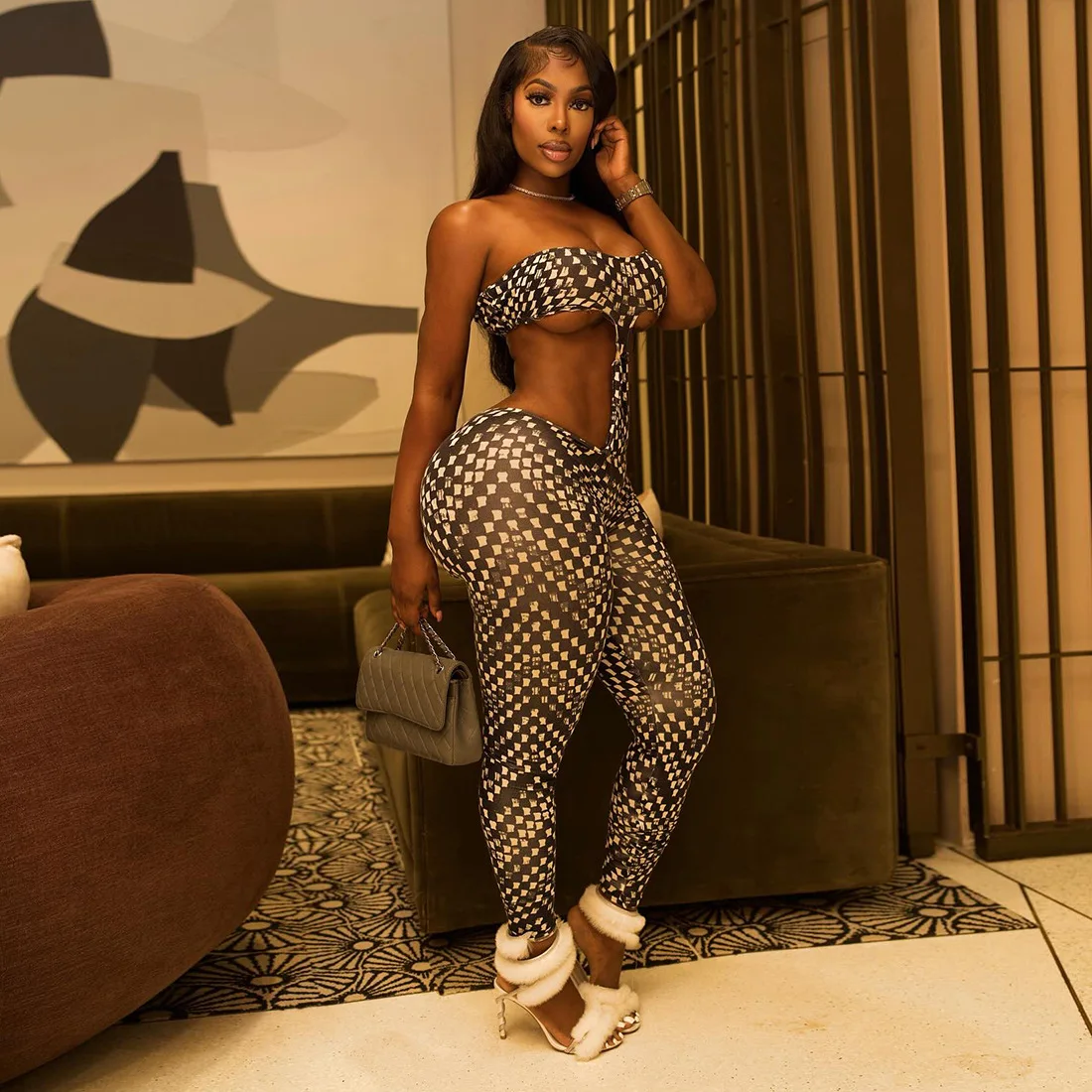 C0383 Geometric Print Sexy Hollow Out Strapless Sleeveless Backless Bodycon Jumpsuit for Women