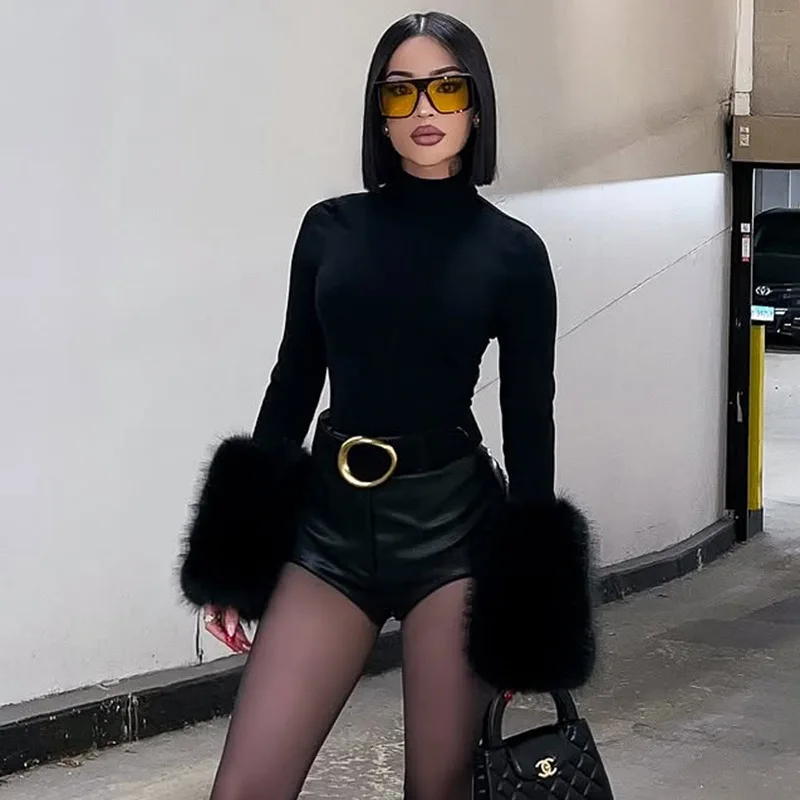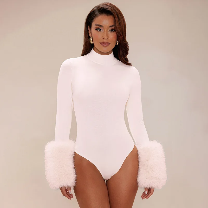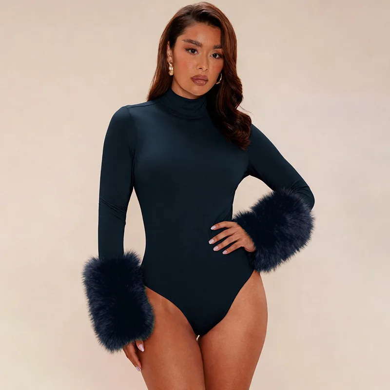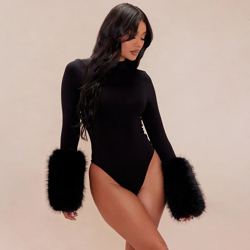 C0120 Fall New Women's Sexy Style Cuff Patchwork Wool Solid Bodycon Bodysuit